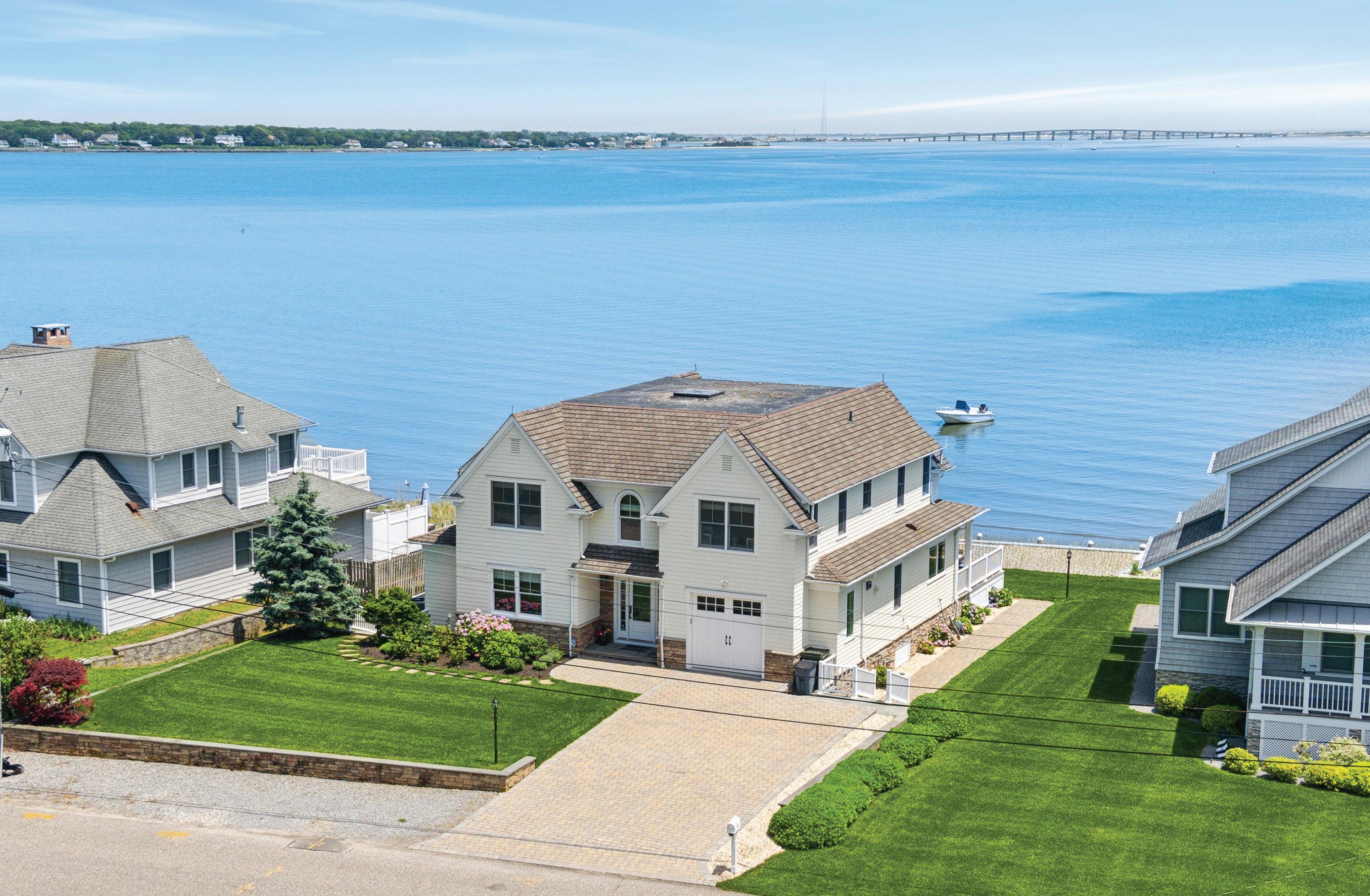 Set on 105' of open bayfront, this 5,200 sf home features 3 levels of impeccable living space, offering unparalleled views of Moriches Bay. Enter into the soaring 30' foyer to an open, sunlit layout that blends coastal charm with sophisticated modernism. The spacious living room features a g as fireplace and walls of over sized glass doors. A chef's kitchen is outfitted with Thermador appliances and an integrated Gaggenau cooktop with Teppanyaki griddle. In addition, a media room/den provides a cozy retreat for relaxing. All 6 en-suite bedrooms, with water views, are designed with privacy in mind. The primary suite offers panoramic views, a private balcony and a spa-like bath. The expansive waterside deck is complete with a heated Gunite saltwater infinity pool & spa. A 156-foot catwalk, with a 12-foot ramp, leads to the brand-new 2025 floating dock. An attached 2.5 car garage, large yard for outdoor games and short distance to fabulous ocean beaches complete this exceptional home! Co-Exclusive $7,950,000