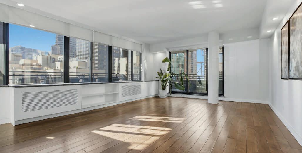 The home occupies two corners of the building’s triangular footprint, showcasing south, east, and west exposures. The main living space is anchored by a spacious great room with approximately 10-foot ceilings. Curved windows — tied directly to the building’s original architecture — frame views toward Fifth Avenue and the surrounding Ladies’ Mile Historic District.