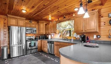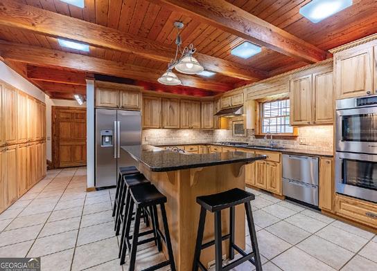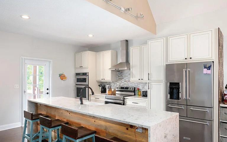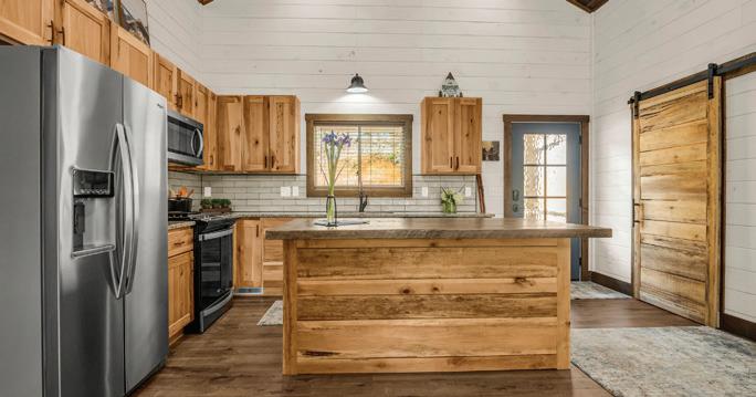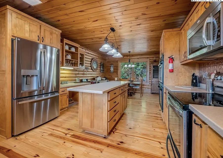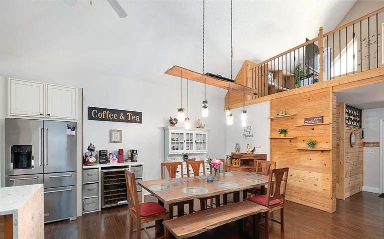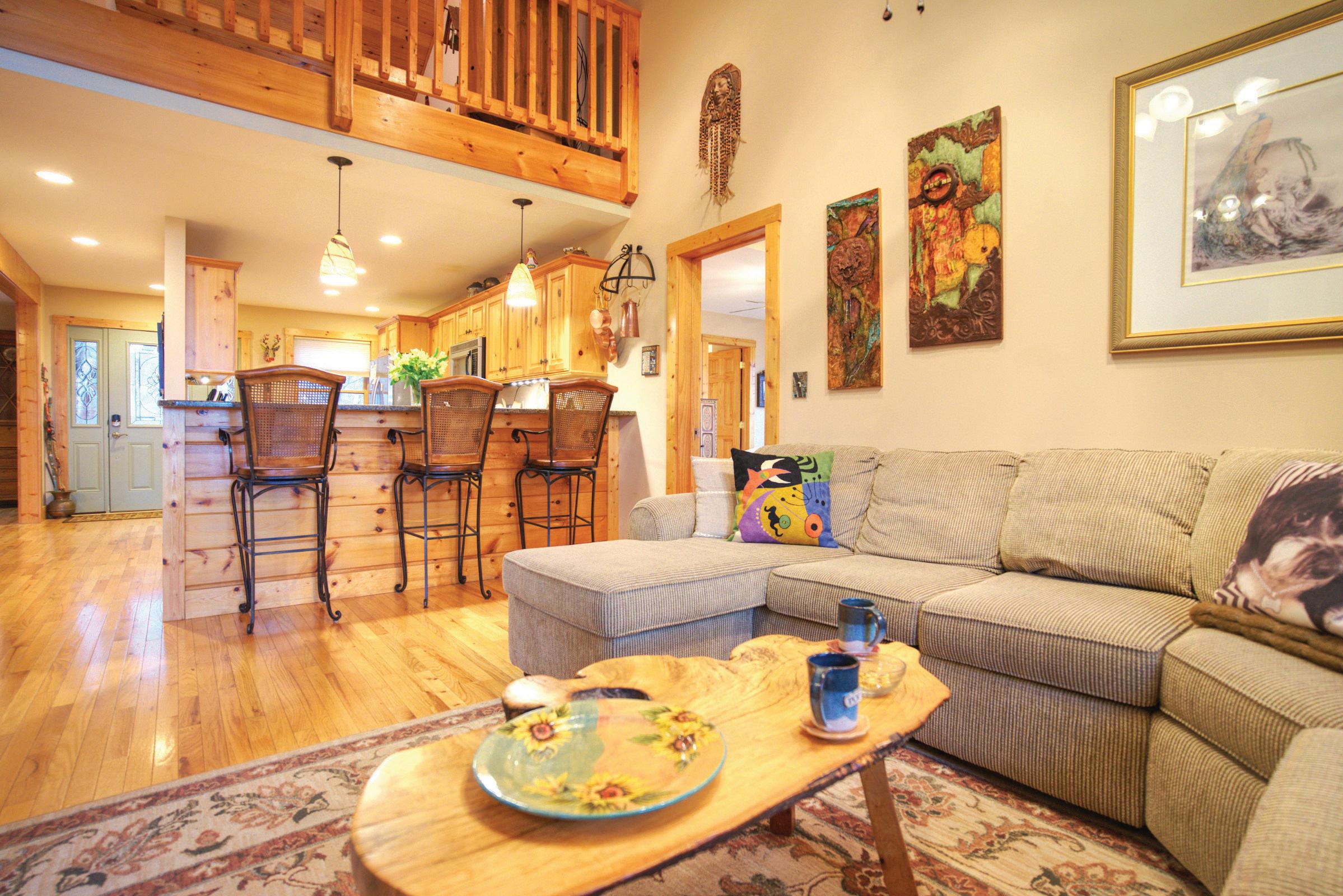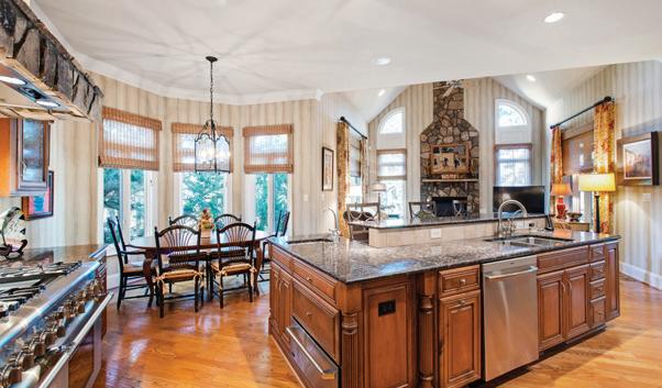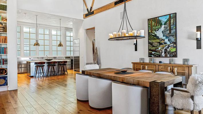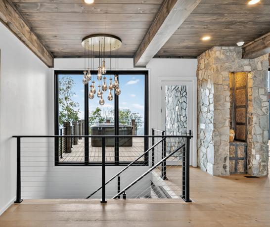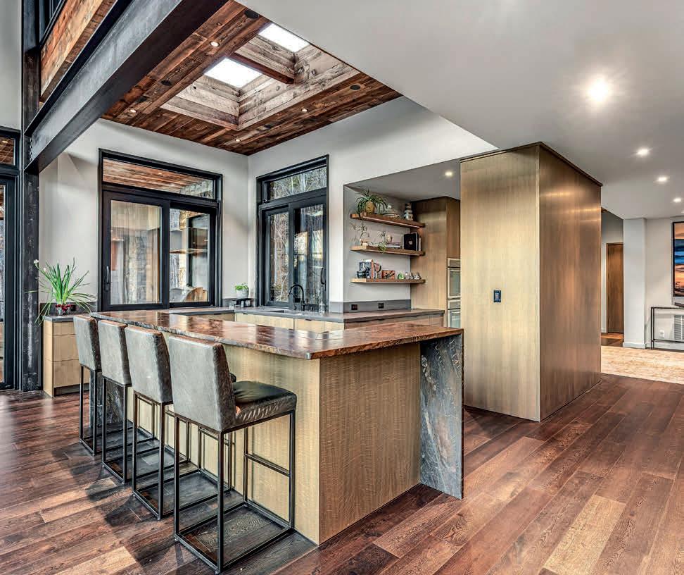 The interior showcases natural materials and meticulous craftsmanship at every turn. Soaring reclaimed hemlock ceilings throughout, stone accents and sculptural steel fireplaces infuse warmth and texture, while custom cabinetry and refined finishes elevate everyday living. The great room seamlessly flows into a chef’s kitchen crafted for both artistry and functionality, featuring grain-matched cabinetry, leathered granite concrete countertops, premium appliances and a dedicated wet bar—perfect for gatherings that extend into the evening.