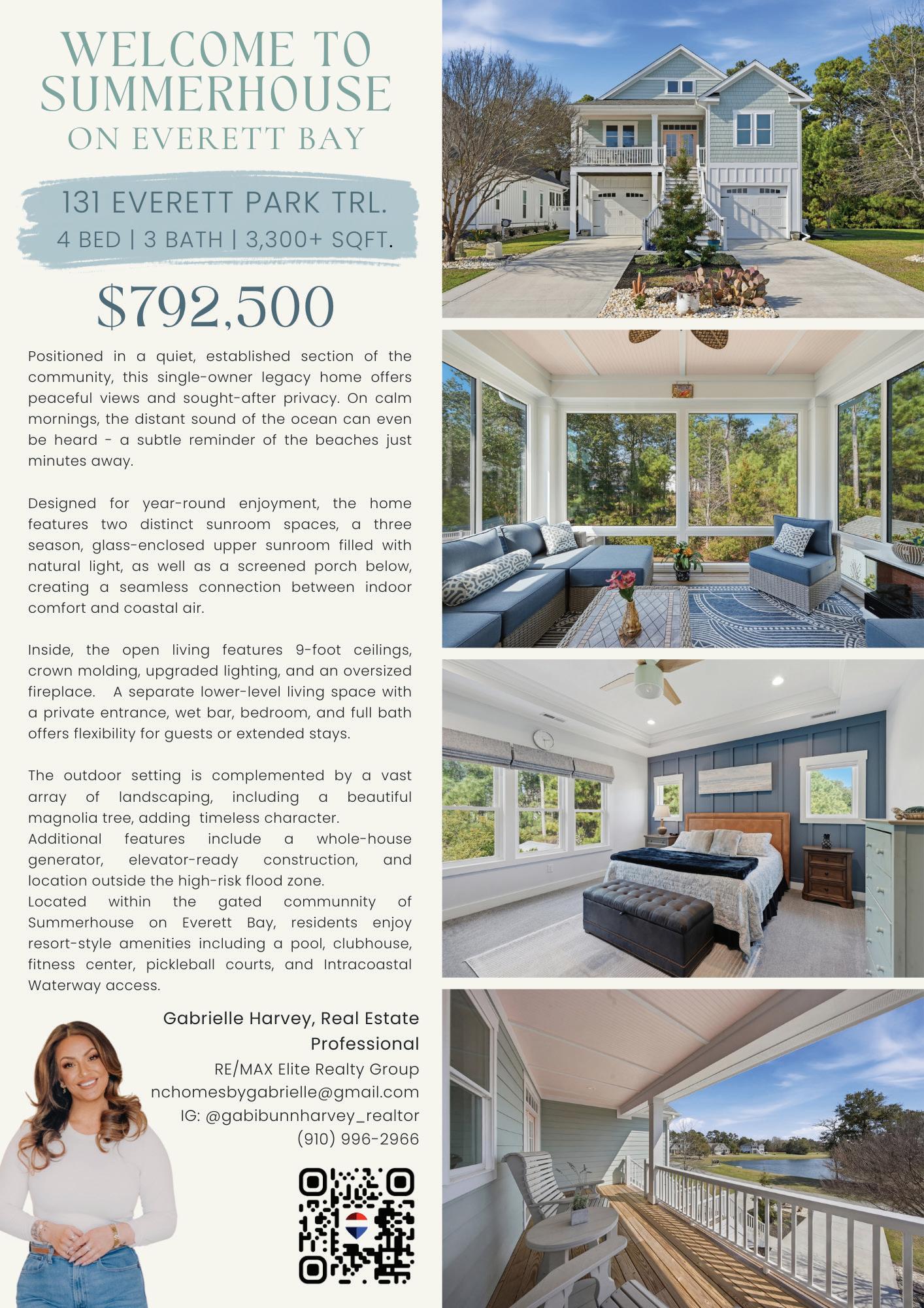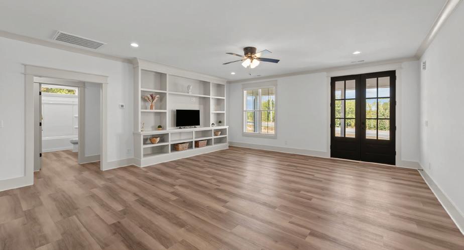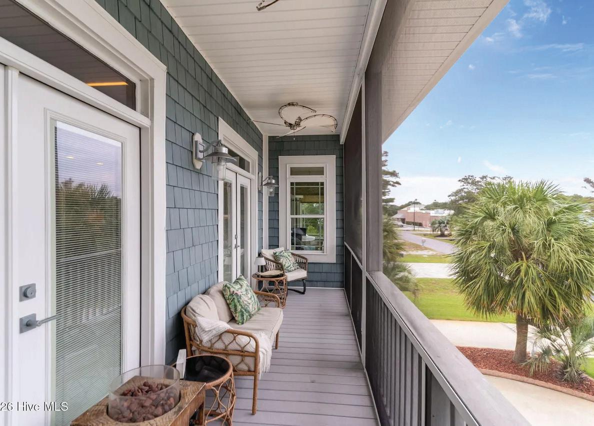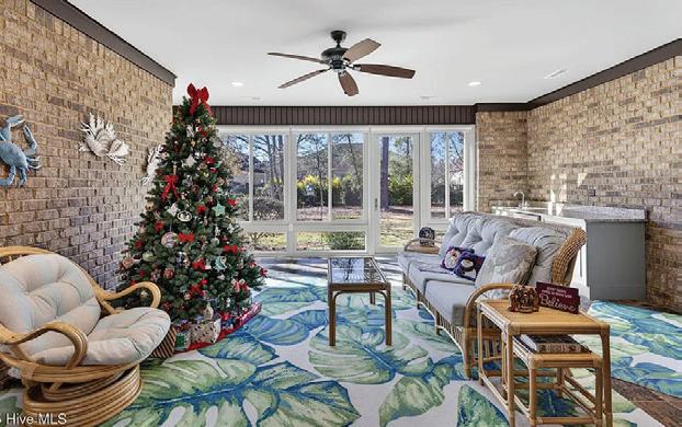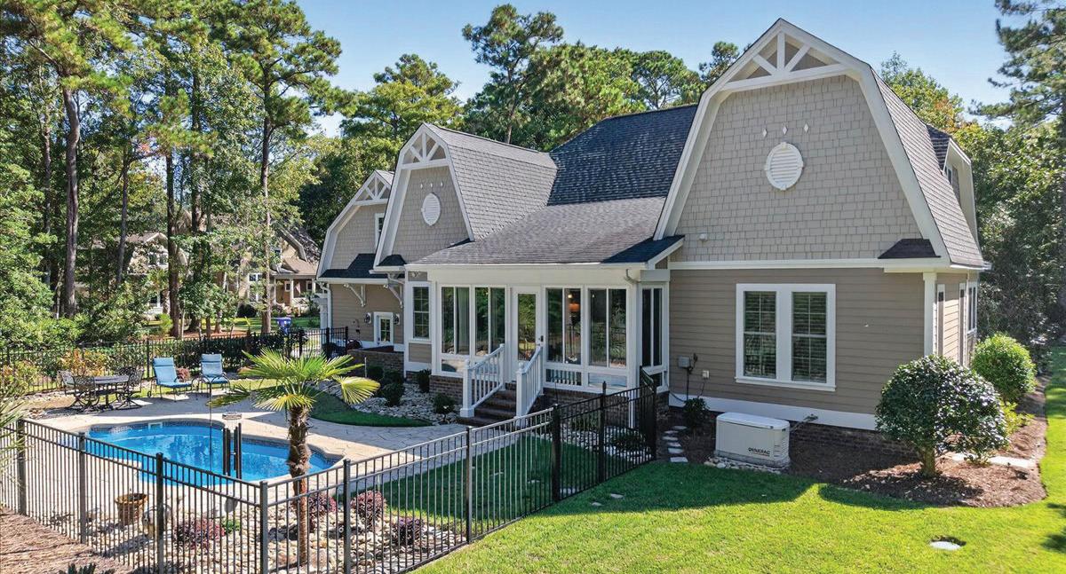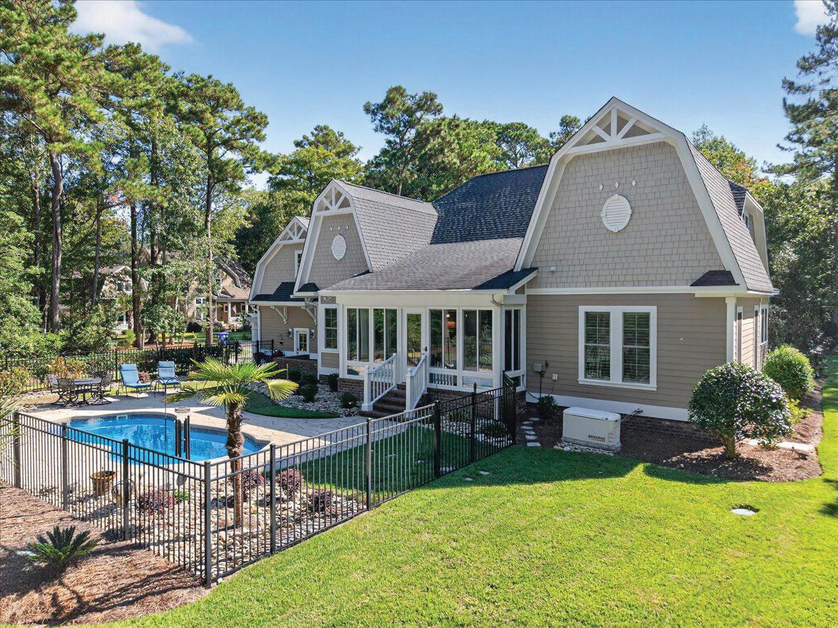 convenience, with a tray ceiling, expansive windows, and a spa-inspired bath boasting a walk-in tile shower, double vanity, and spacious walk-in closet. Upstairs, two guest suites each have private baths, while a versatile fourth bedroom above the 2.5-car garage—with full bath and private staircase—serves as a media room, fitness studio, or secluded guest haven. A dedicated office with custom built-ins provides a serene workspace. Modern amenities include a whole-house generator, 300-gallon propane tank, and tankless water heater—ensuring comfort year-round. Outdoor living is elevated by a stunning allseasons room overlooking the saltwater pool, perfect for gatherings or quiet reflection. Plumbing for an outdoor grill, shower, and more enhance this coastal sanctuary. The home’s setting is truly unique—protected woodlands in front and back will remain untouched, preserving the natural beauty and tranquility for years to come.