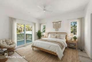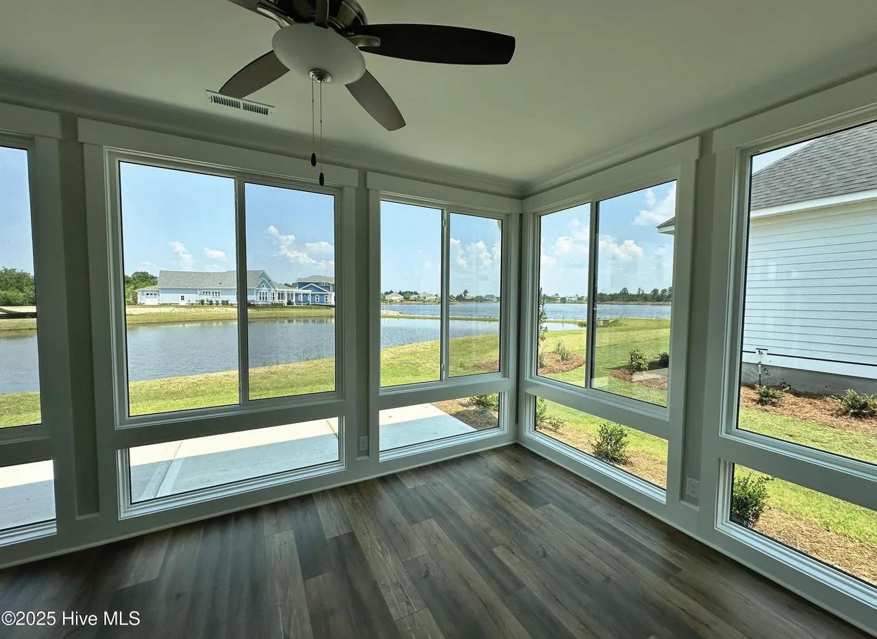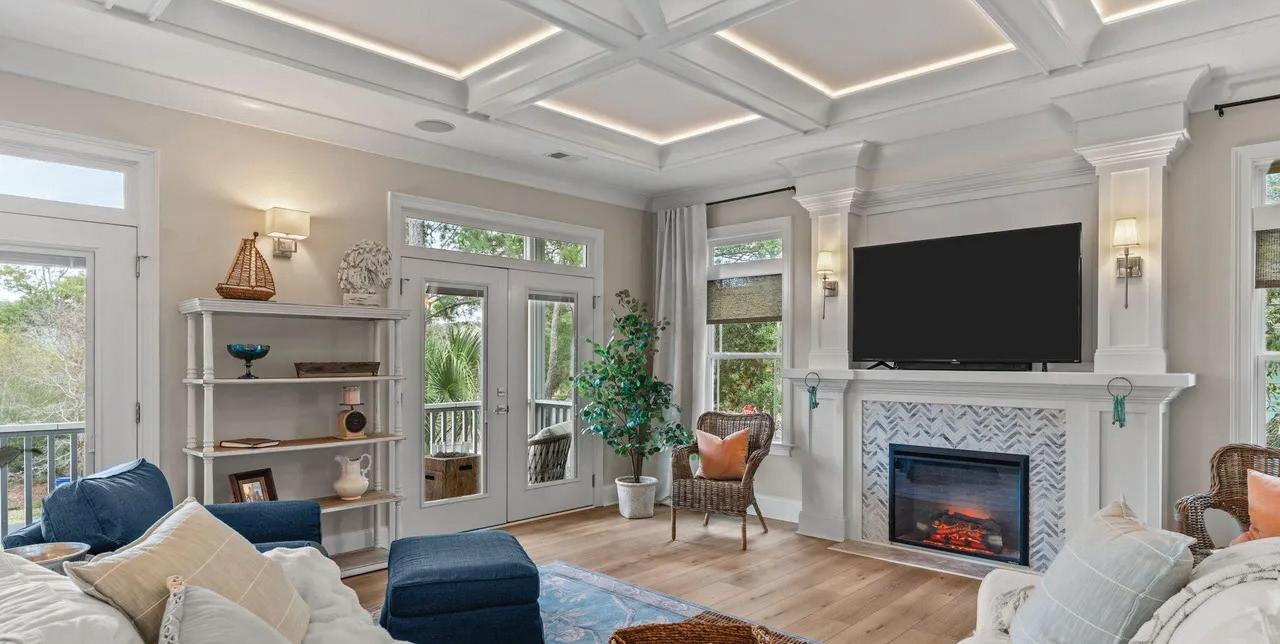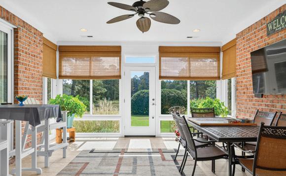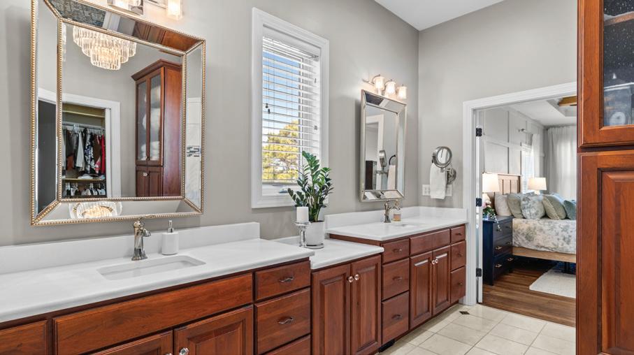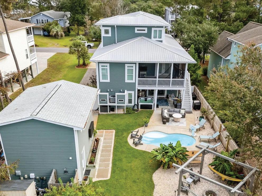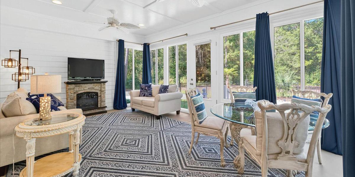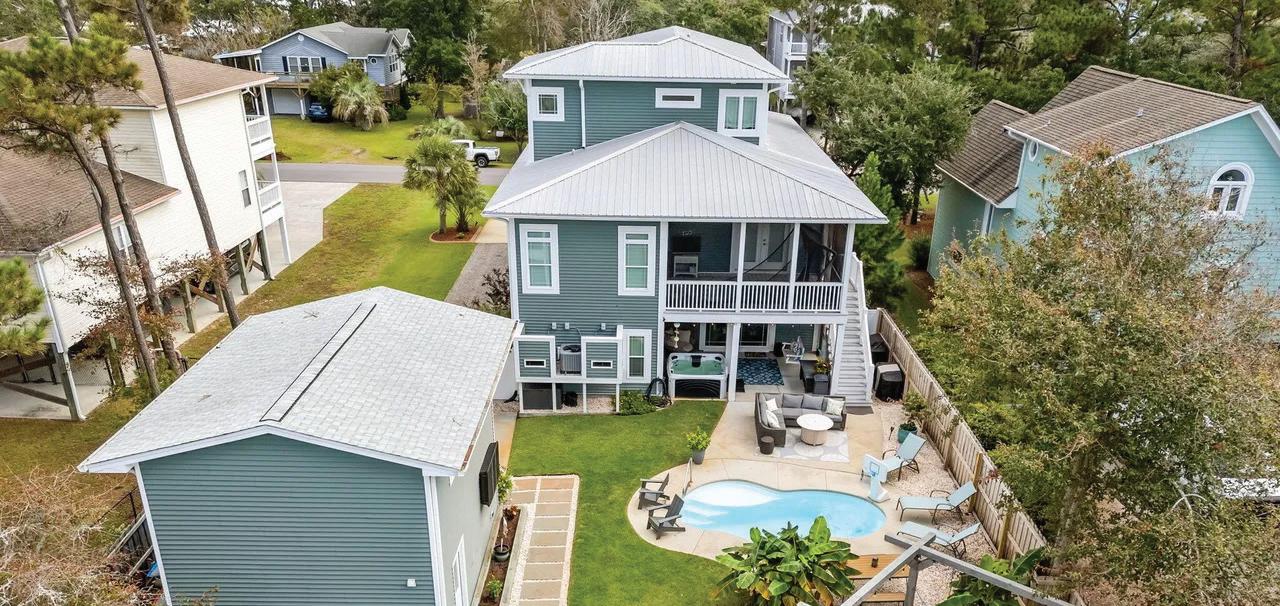 convenience, with a tray ceiling, expansive windows, and a spa-inspired bath boasting a walk-in tile shower, double vanity, and spacious walk-in closet. Upstairs, two guest suites each have private baths, while a versatile fourth bedroom above the 2.5-car garage—with full bath and private staircase—serves as a media room, fitness studio, or secluded guest haven. A dedicated office with custom built-ins provides a serene workspace. Modern amenities include a whole-house generator, 300-gallon propane tank, and tankless water heater—ensuring comfort year-round. Outdoor living is elevated by a stunning allseasons room overlooking the saltwater pool, perfect for gatherings or quiet reflection. Plumbing for an outdoor grill, shower, and more enhance this coastal sanctuary. The home’s setting is truly unique—protected woodlands in front and back will remain untouched, preserving the natural beauty and tranquility for years to come.