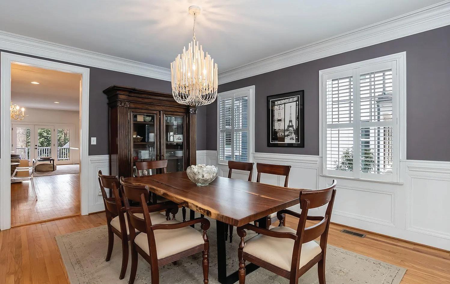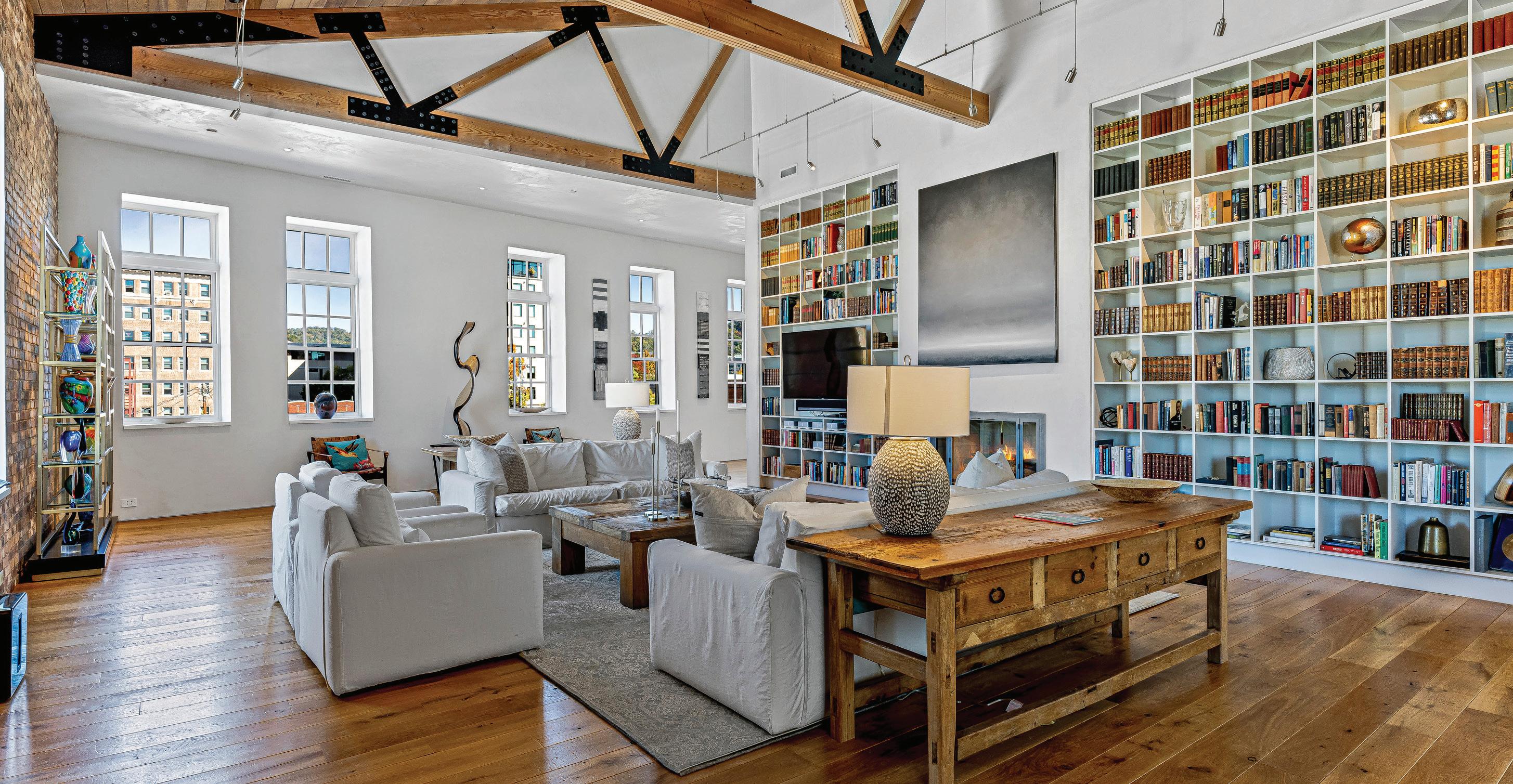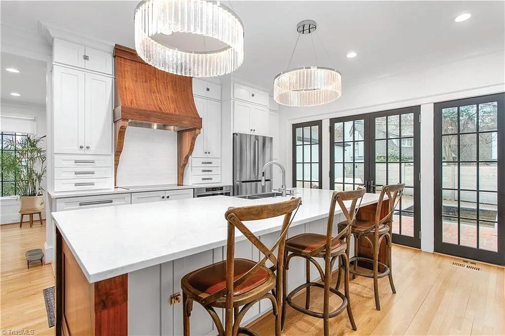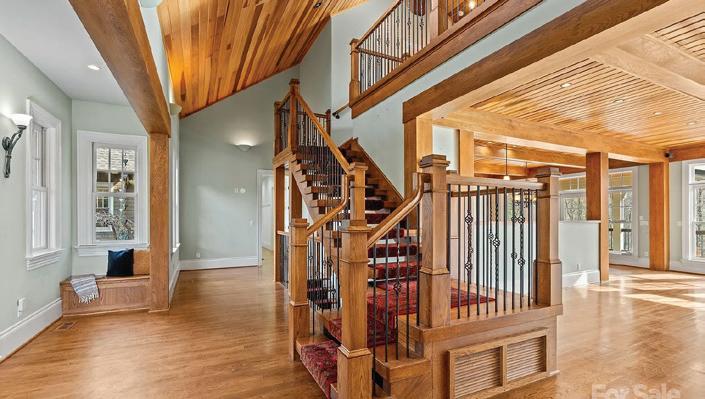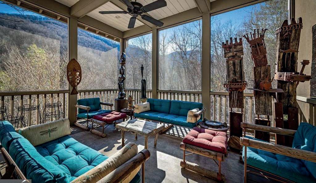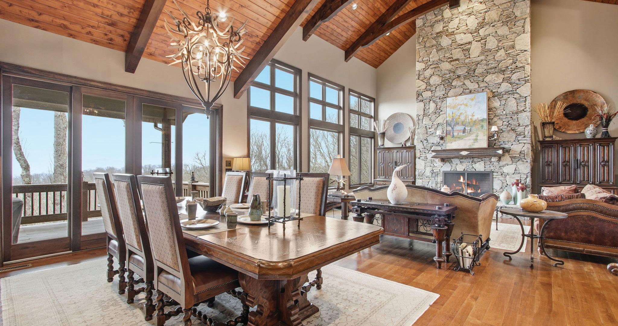 Inside, 4,600 square feet of refined living space is defined by clean architectural lines, 22-foot vaulted ceilings with exposed beams and custom-stained white oak floors. The chef’s kitchen designed to pair commercial-grade appliances with custom cabinetry and Caesarstone surfaces, while artisan metalwork by Asheville artist Warren Perdue lends sculptural elegance to the formal dining room.