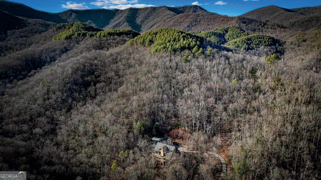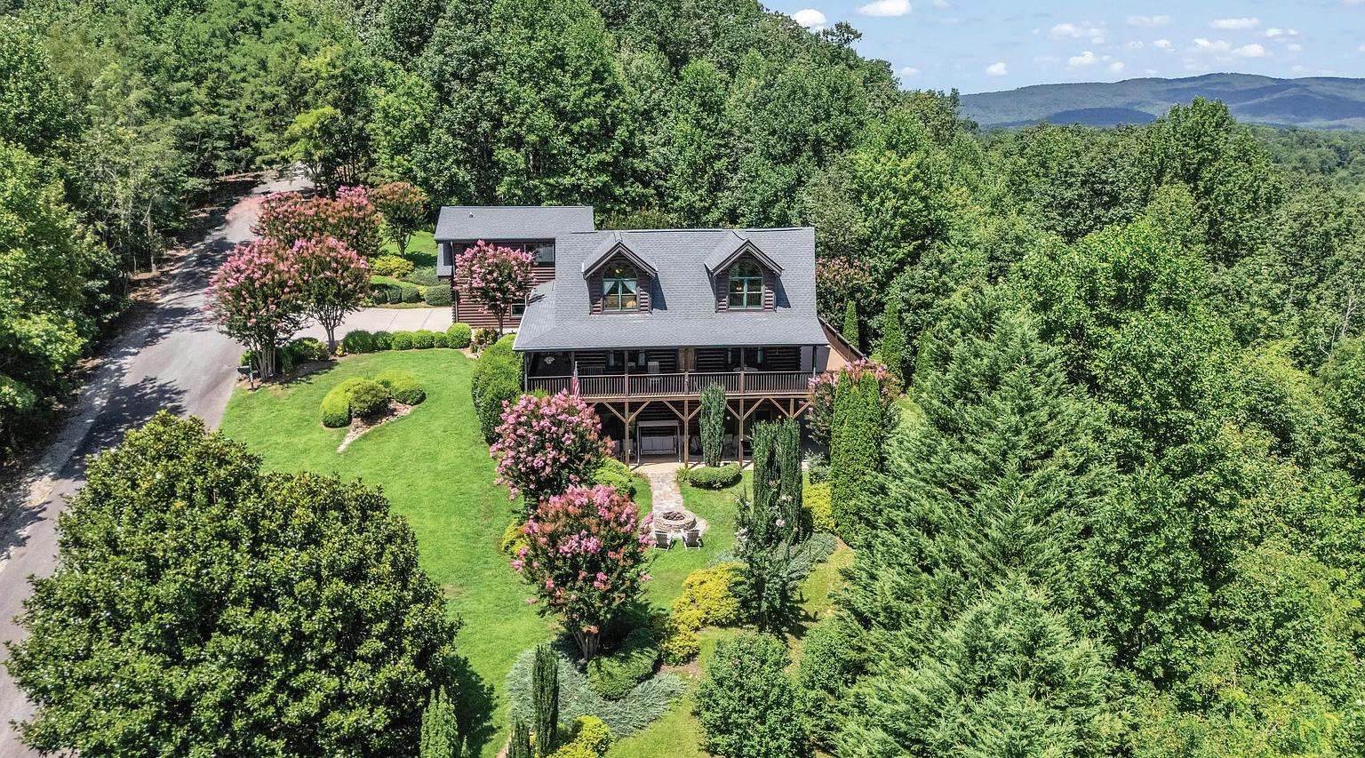 A private mountain sanctuary just minutes from the Franklin, NC airport, this extraordinary mountaintop estate spans 34.7 pristine acres bordered on three sides by U.S. Forest Service land, with a bold native trout stream flowing through the heart of the property. The Great Room features soaring 25-foot ceilings and a dramatic masonry wood-burning fireplace, showcasing rich woodwork, thick moldings, built-in shelving, Kolbe windows and French doors, a solid walnut front door, and five-inch quarter-sawn oak floors throughout. Breathtaking views of Wayah Bald, Macon County’s highest peak, are visible from nearly every room. The chef’s country kitchen is appointed with Wolf appliances, designer cabinetry, antique granite countertops, a custom pot rack, and seating for eight, complemented by a butler’s pantry, spacious laundry room, and second powder room. The formal dining room is filled with natural light and forest views. A screened porch captures sweeping vistas where the Appalachian and Bartram Trails pass. The main-level primary suite offers a spa-inspired bath with heated floors, Wolf Appliances paired with a Sub-Zero Refrigerator and Kohler Whirlpool Tub, Toto Neorest toilet, and multiple closets. Upstairs are two guest suites and a sunlit loft. The terrace level includes a second great room, stone fireplace, wine cellar, and two unfinished guest suites with plumbing in place. A true nature lover’s paradise.