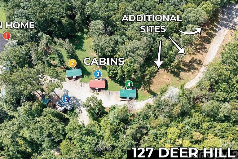 Additionally, a site has been approved for three more rental units, or for a family to build their own Oasis, with possibilities limited only by your imagination. Plenty of room for a pool or two, a tennis court, and much more! Quality built and quality maintained with a three-bedroom, threeand-a-half bath home with a Loft, game room, and indoor sauna. Three Amish-built log cabins and a Tiny home built on site by the Seller/Contractor. The sale includes many additional amenities, such as outbuildings, vehicles, and furnishings, at no extra cost. If you want a place for the family and guests to gather for those special times in the Mountains, this IS IT! Contact the Listing Broker to schedule a showing and for more information regarding possible creative SELLER FINANCING options.