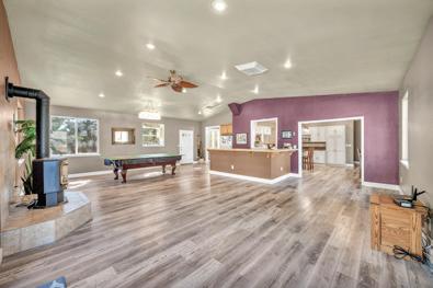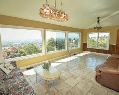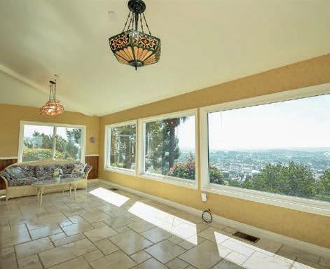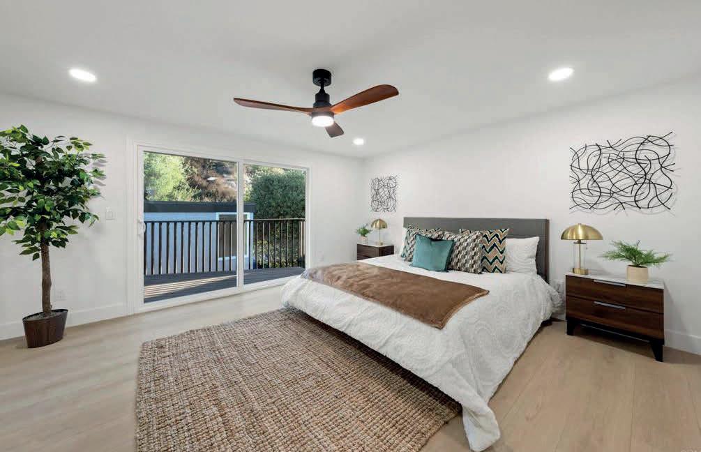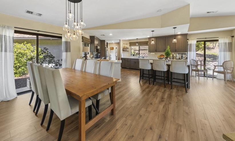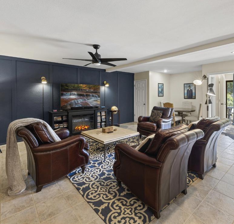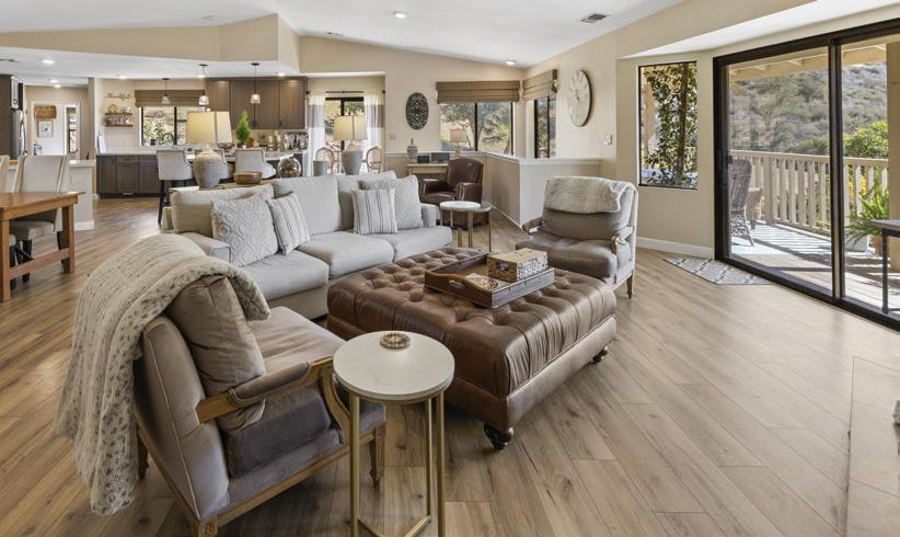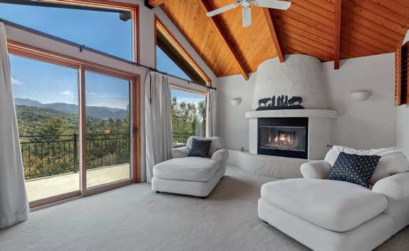 T he adjacent dining area opens to a sliding door leading to the side yard, while the inviting family room, complete with a cozy fireplace, extends onto a full-length veranda balcony perfect for enjoying the breathtaking hillside views. Designer ceiling fans adorn every room, ensuring comfort year-round.