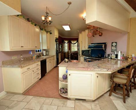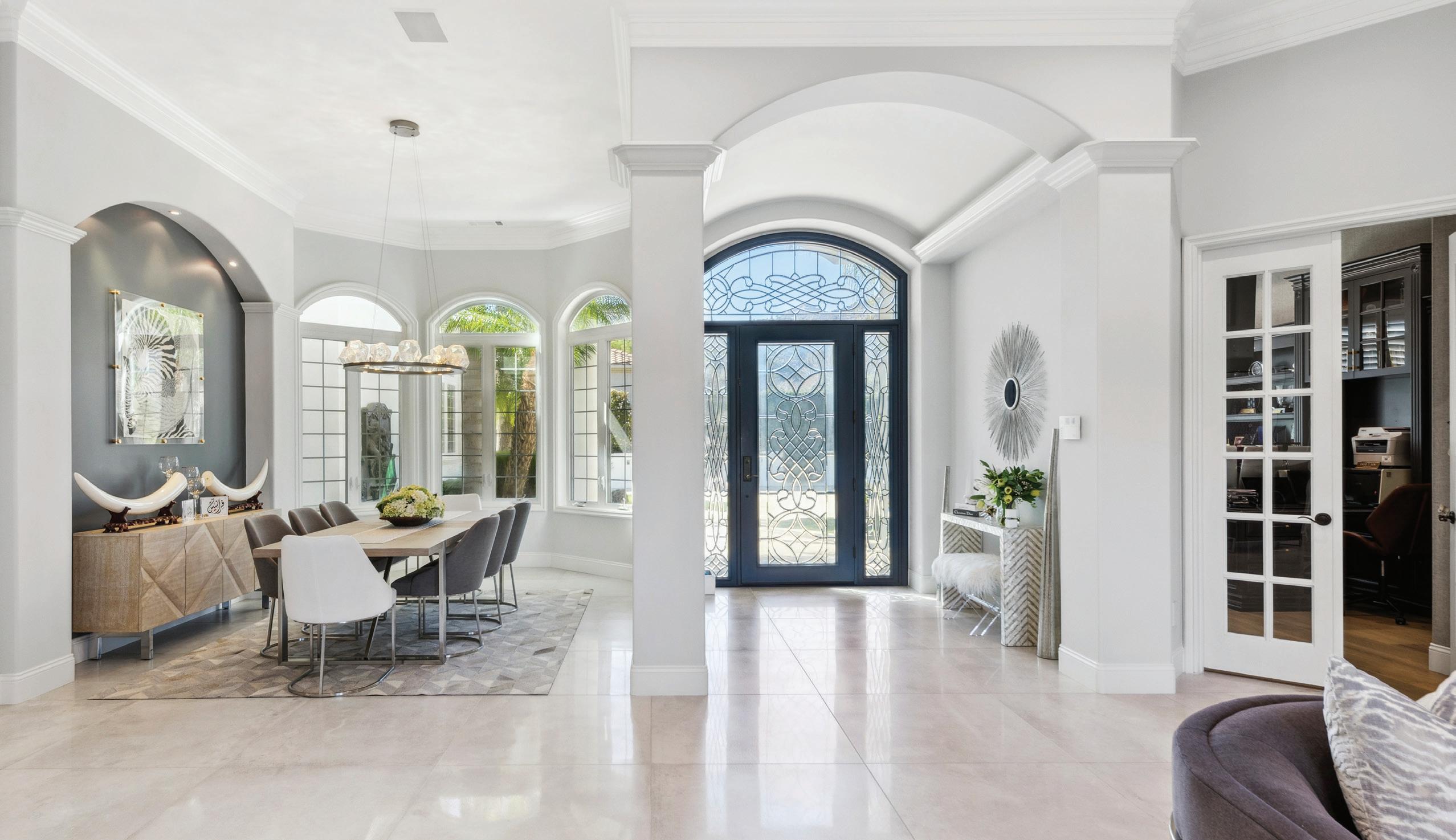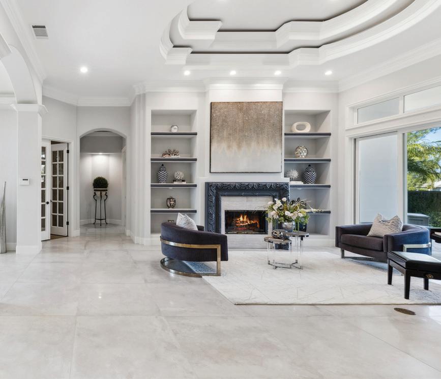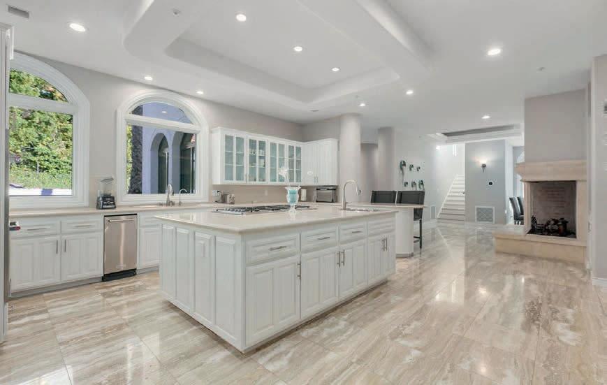 The state-of-the-art kitchen is designed for both function and beauty. Exquisite counter tops from Marbolis, a premier importer of fine stone, elevate the space, while professional-grade appliances, including a double oven, gas cook top, and double kitchen sink, make it a chefs dream. A tastefully concealed butlers pantry provides additional storage and prep space, seamlessly integrating into the sleek design. The flooring is a striking 3 x 3 porcelain tile with select silver inlay accents, which extends into the family room, creating a cohesive and refined aesthetic.