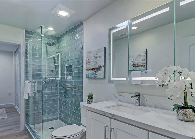 The primary suite is a sanctuary of comfort and style, with an en suite bath that has been completely re-imagined to include a luxurious two-person soaker tub, a large walk-in shower, and elegantly detailed marble inlay flooring. Lighted Paris vanity mirrors add an extra touch of sophistication, while all-new plumbing and electrical ensure the space is as functional as it is beautiful. Even the smallest details, like the exclusive Toto toilet, reinforce the commitment to quality and refinement.