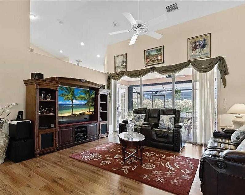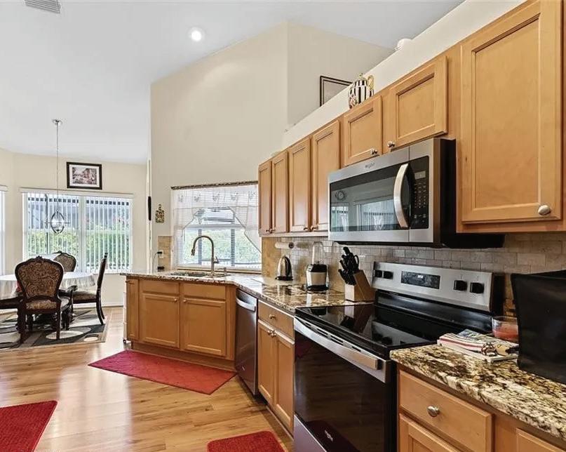 Experience this stunning Winston Trails home featuring a remodeled kitchen with quartz waterfall island and new appliances. Enjoy serene golf course and pool views from the living room or screened patio with phantom screen—perfect for relaxing and entertaining in true Florida style.