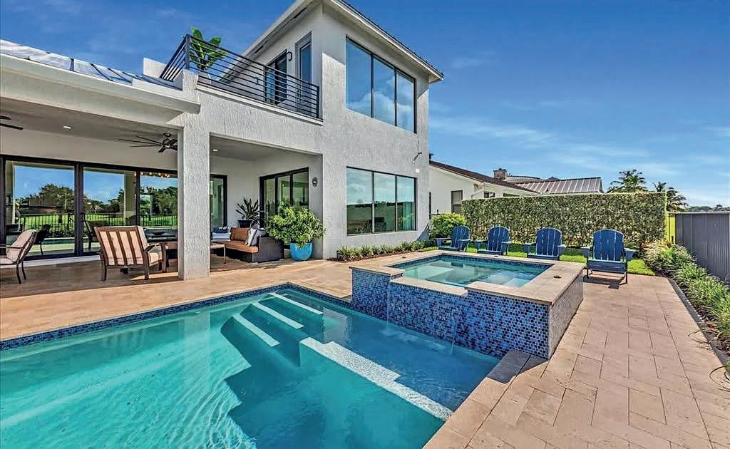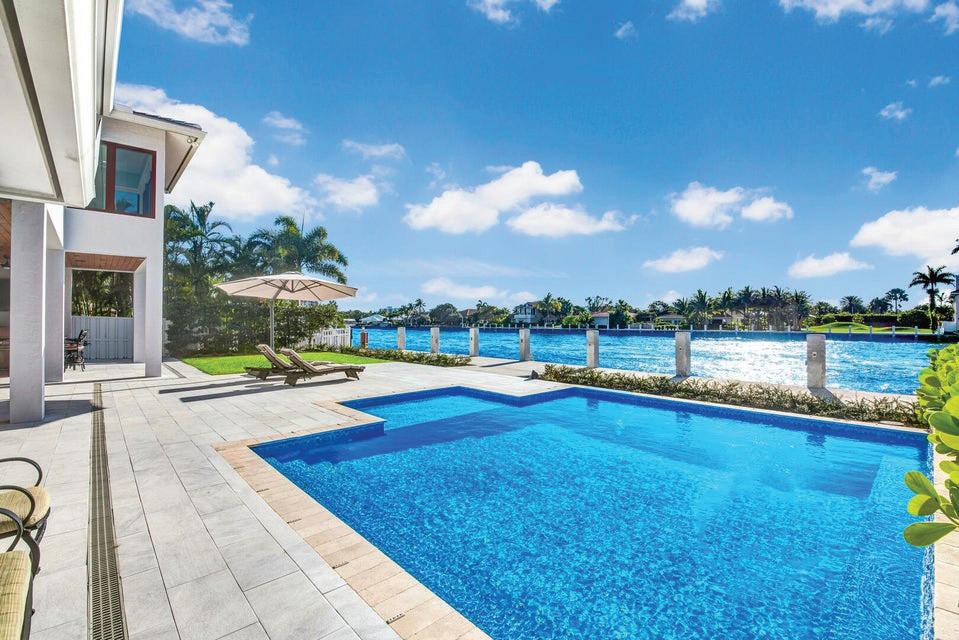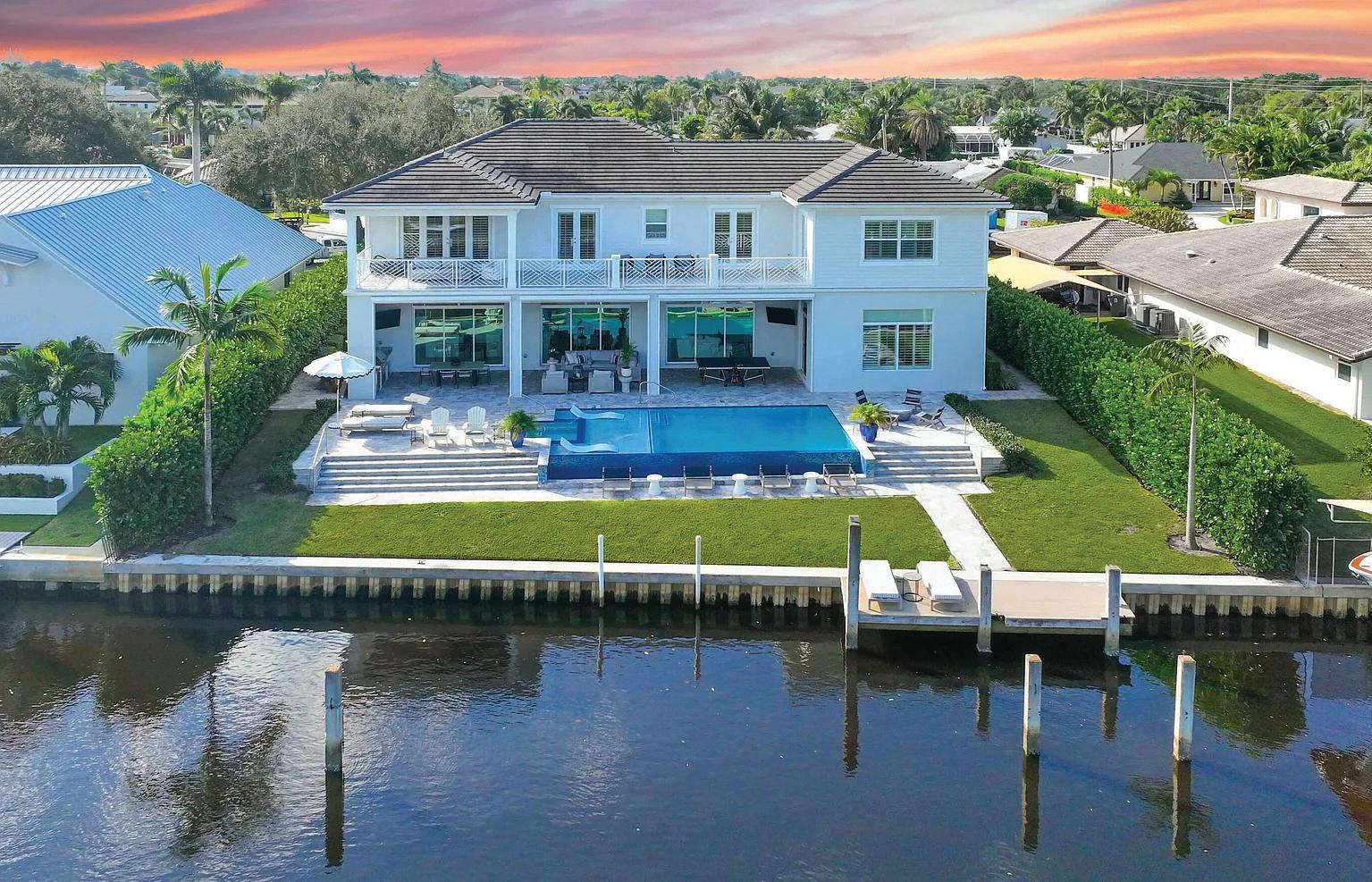 Welcome to your Boca dream retreat! Custom built in 2021, this modern home features impact windows & doors, quartzite countertops, & a split floor plan. Open-concept living flows to the lanai with a heated pool and spa, perfect for indooroutdoor entertaining. Breathtaking SUNRISE & SUNSET views from the rooftop deck & private waterfront dock overlooking the Hillsboro Canal & private golf course. The gourmet kitchen offers a large island, wine fridge, Bosch stainless steel appliances, & an induction cooktop. Two primary suites include walk-in closets & ensuite baths with glass-enclosed showers. Additional highlights include a metal roof, private backyard, security system, two A/C units, separate laundry room, & garage workshop. Close to shopping, dining, beaches, and major highways.