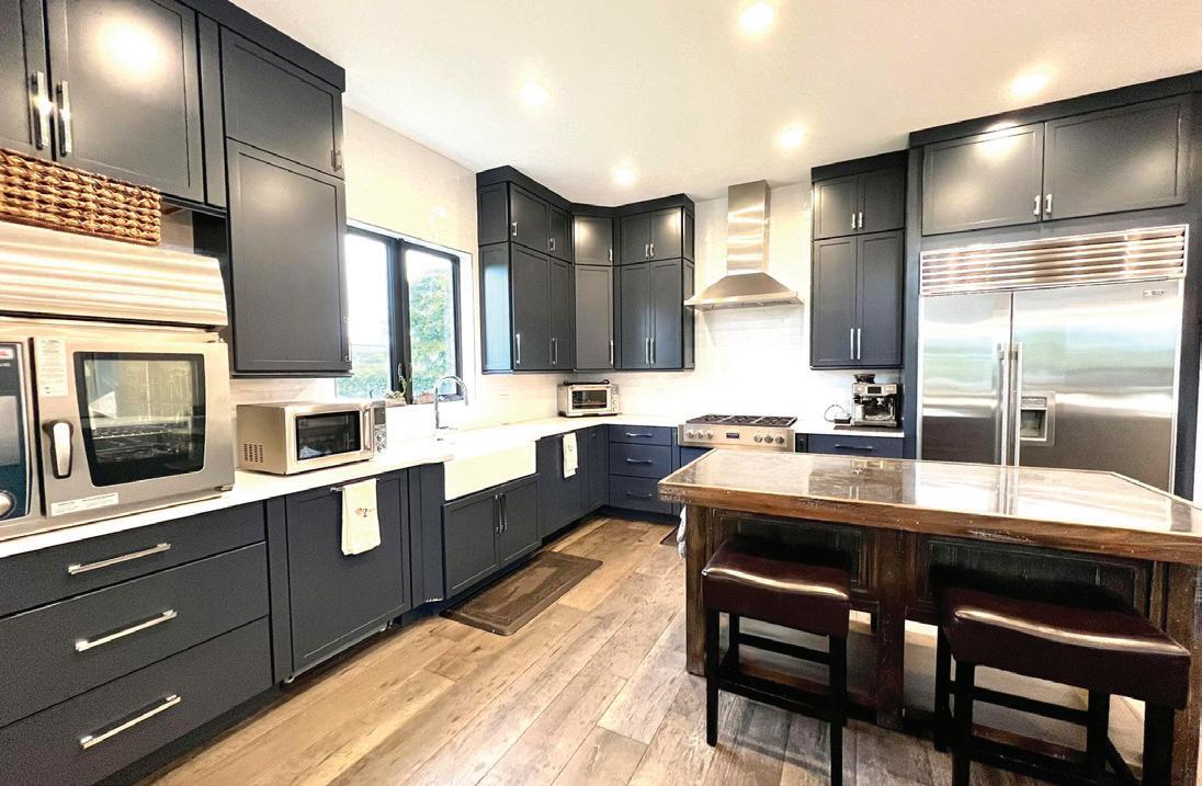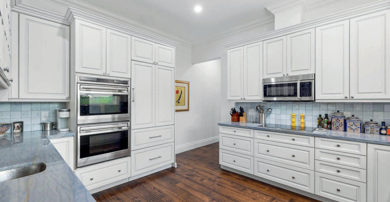 Gourmet kitchen featuring a Wolf gas range, Sub-Zero column refrigerator and freezer, and built-in wine cooler. Custom cabinetry designed and fabricated exclusively for this home. Exotic imported stone countertops with rare veining and natural textures. Secondary butler’s pantry with Thermador appliances, perfect for entertaining.
