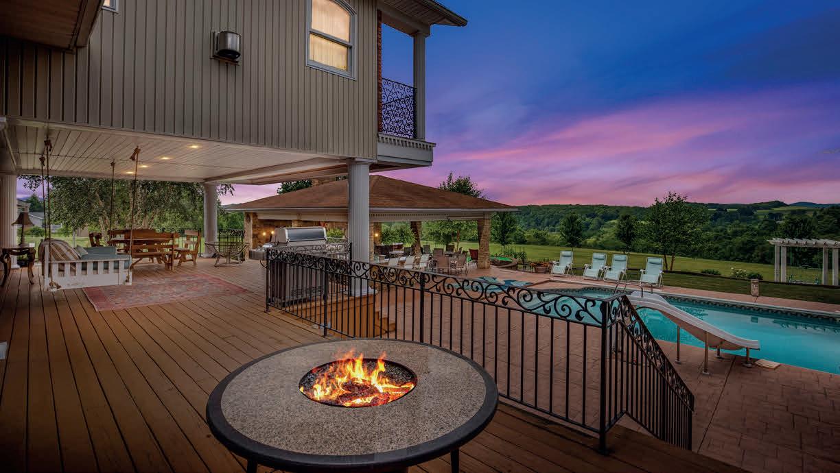 Welcome to 153 Berkeys Lane, a one-of-a-kind home in Stoystown, PA, where timeless craftsmanship meets resort-style living. Set on 1.05 level, landscaped acres with paver walkways, a koi pond, fountain, and wrought-iron fencing, this home is designed for both everyday luxury and unforgettable entertaining. The outdoor pavilion is a showstopper—complete with a stone fireplace, wood-fired pizza oven, granite bar tops, built-in grilling area, and professional-grade appliances—perfectly complementing the inground pool, putting green, and covered porches. Inside, a chef’s dream kitchen boasts custom oak cabinetry, granite counters, Sub-Zero and Wolf appliances, double ovens, and a wine fridge. The formal living room offers built-in oak bookshelves and a granite-surround fireplace, while the magnificent 1,750 sq. ft. great room features soaring 15-ft ceilings, stone fireplace, dining for 12, custom bar, billiards area, and French doors opening to a balcony. Wine enthusiasts will appreciate two climate-controlled cellars with capacity for over 2,400 bottles. The home offers two luxurious primary suites—each with fireplaces, spa-like baths, and balcony—plus an additional bedroom with breathtaking views. A heated 34x50 garage, radiant-heated driveway, and advanced utility systems add unmatched convenience. From its exquisite finishes to its unparalleled amenities, this property is truly a private retreat unlike any other. Close to Flight 93 Memorial, Hidden Valley, Seven Springs and Laurel Mt Ski Resorts