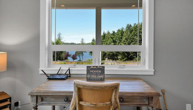The home’s entryway runs from front to back, providing access to the main living space, guest quarters, and north and south 10-foot glass doors that open to the outdoors. Inside, highlights include granite and quartz countertops, solid fir doors, oak hardwood floors, beamed ceilings, heated bathroom floors, and on-demand hot water heating. An open-concept layout, southern exposure, and a double-sided fireplace create warm and inviting living spaces, complemented by a lofted office overlooking the great room.