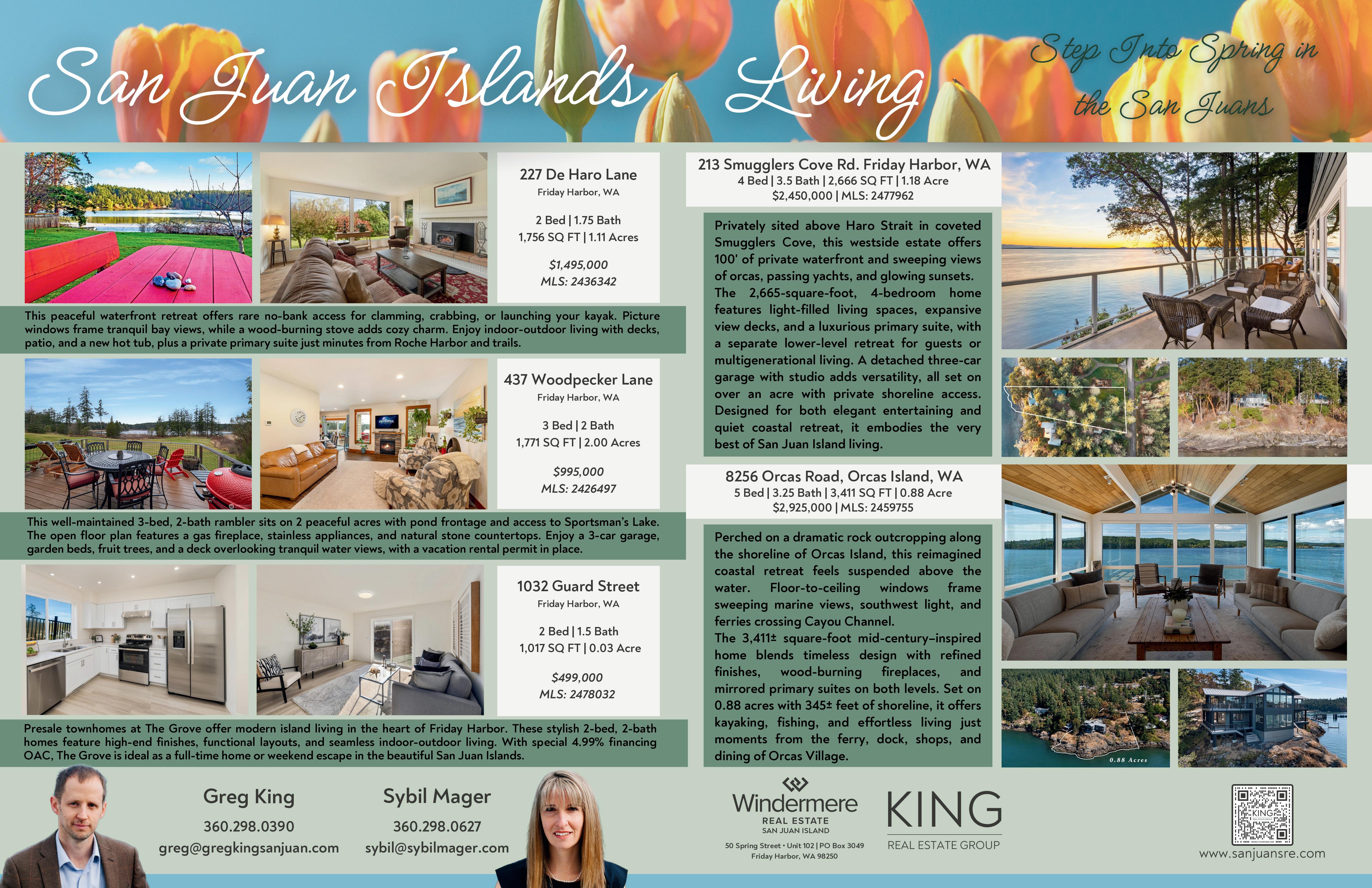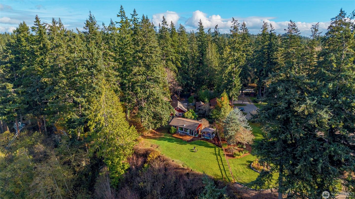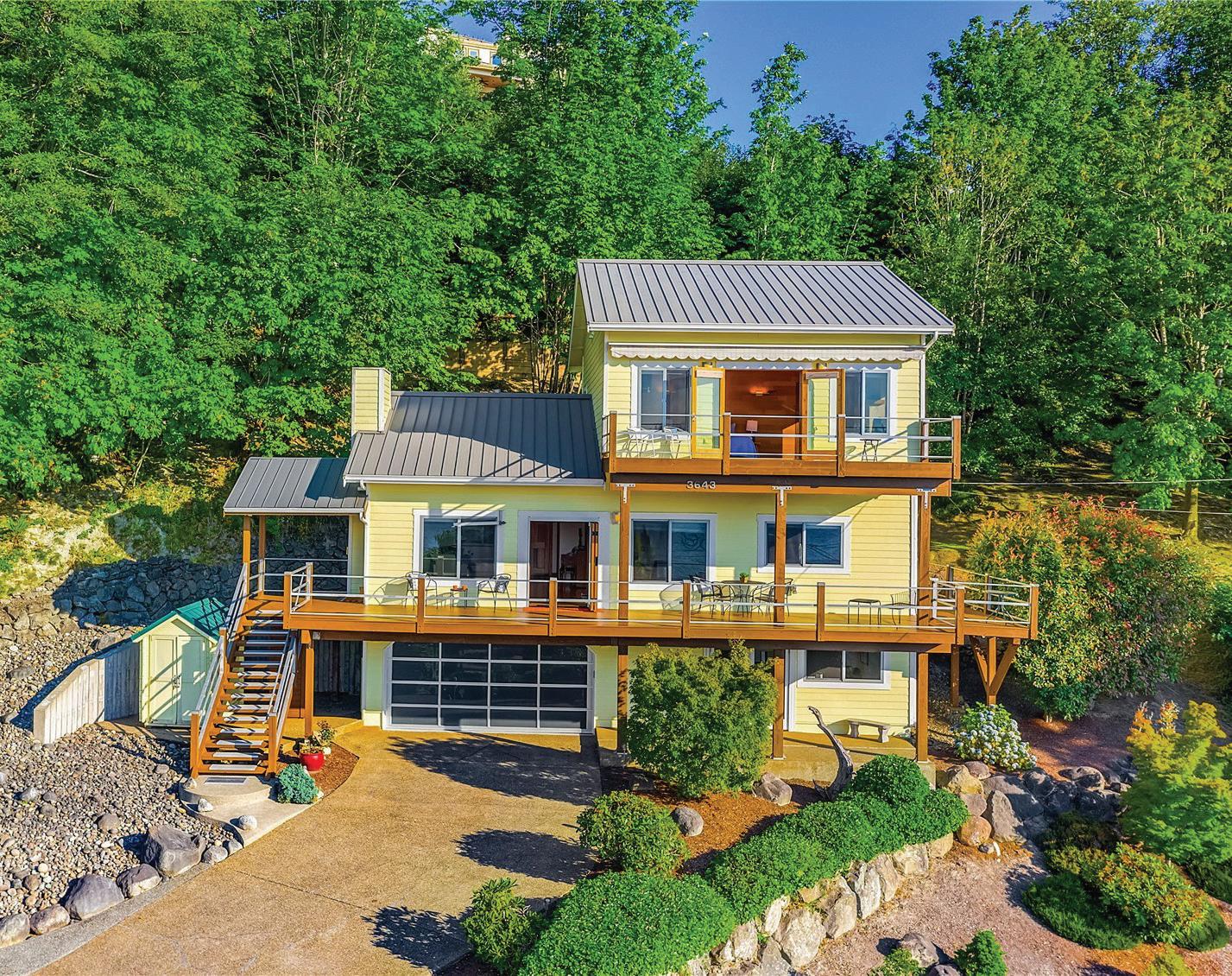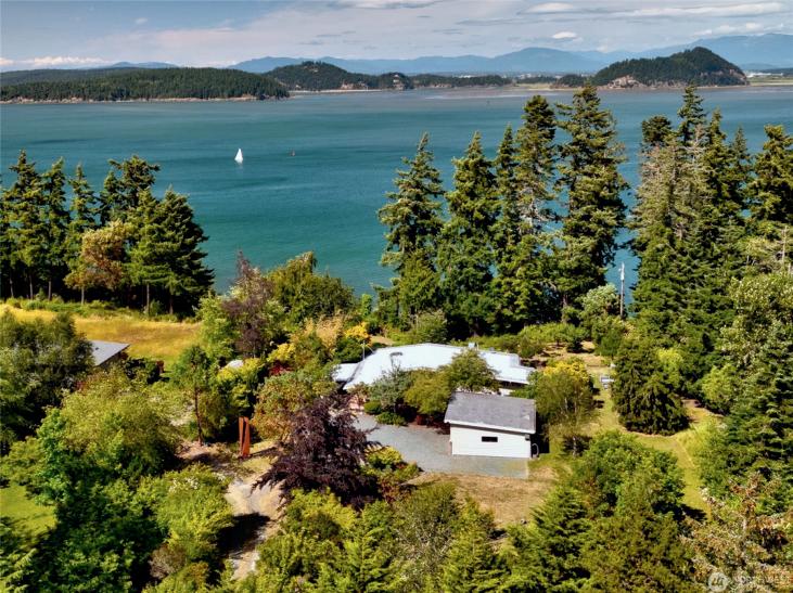 Two Waterfront Retreats on 4.95 acres at 755 & 757 Ferry Road. Step into island living with not one, but two charming waterfront homes with full kitchens, a shared 3 car garage and a total of 3 bathrooms on separate tax lots—perfect for gatherings, guests, or a rare investment opportunity. Set above the shoreline and framed by fir, madrona and beautiful yard art. Each home offers waterfront decks with sweeping views. Between the homes, are beautiful natural landscaping, a gathering area with a stone-laid patio and a built-in firepit that invites cozy evenings under the stars. Inside, natural light pours through big windows or skylights. This rare north-end setting blends privacy, community, and adventure—all in one.
