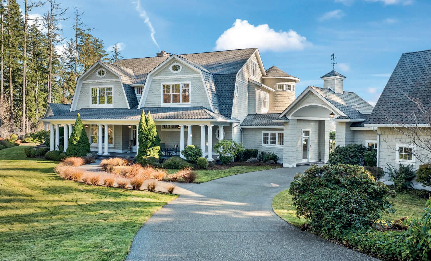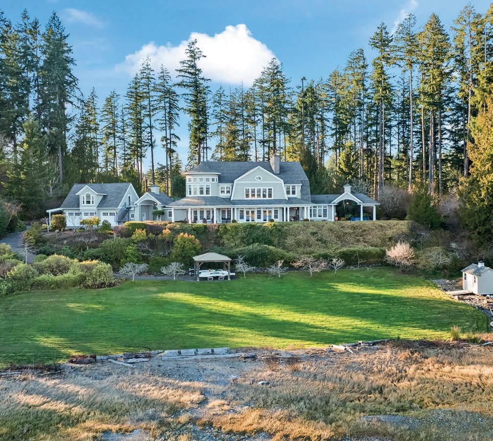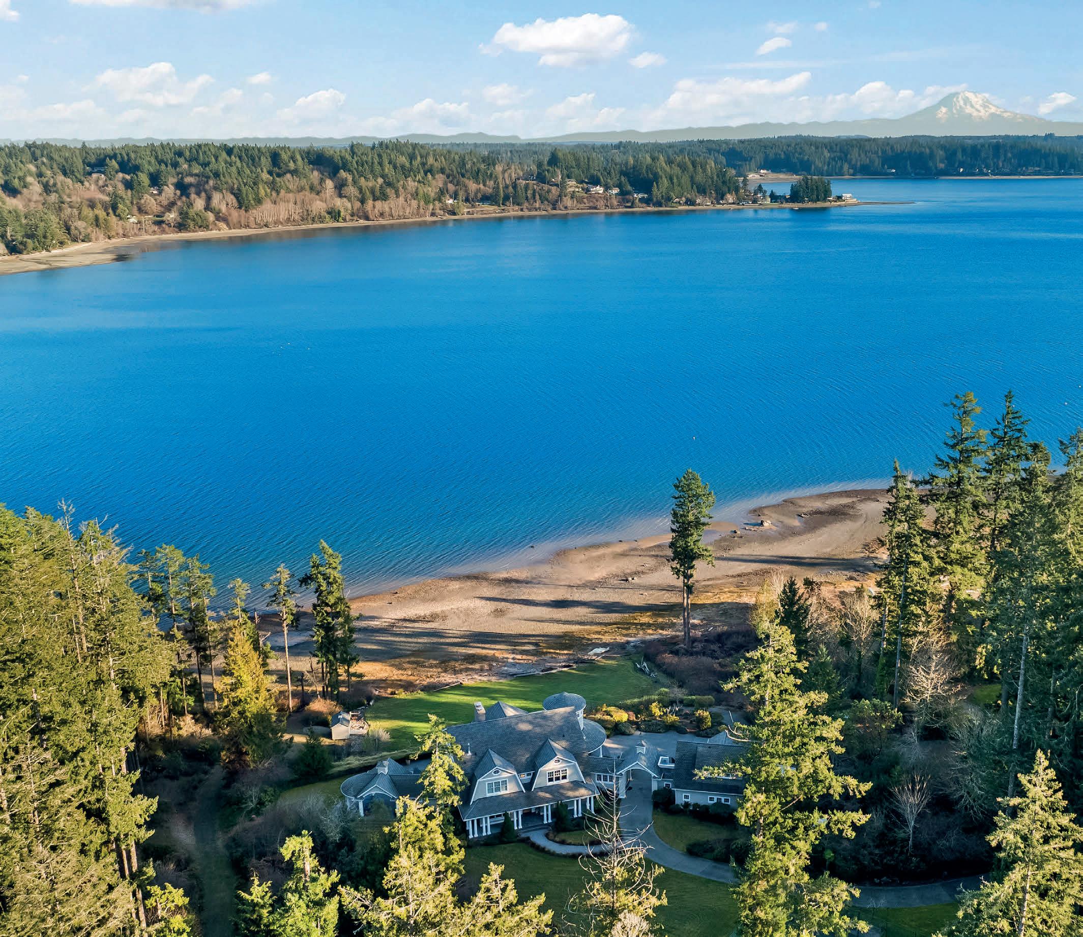 Timeless East Coast–inspired Shingle Style estate on a gated 5-acre sanctuary with 350’ of rare no-bank waterfront—a retreat created for those who prize privacy, beauty, and the ability to truly unplug. Tucked away from the world yet minutes from marinas, dining, and everyday conveniences, the property offers the ideal balance of complete seclusion with effortless access. The primary residence welcomes with soaring 20’ ceilings, an open yet intimate floor plan, walls of windows, wraparound porches, and sweeping views of Puget Sound and Mount Rainier. A chef’s kitchen with marble counters flows to the great room with stone fireplace, while a private spa wing with exercise area and hot tub becomes a personal wellness escape. The grounds invite a refined estate lifestyle: quiet mornings on the porch, meditative walks along your own beach, kayaking & paddle boarding, or casting for fish. Host friendly matches on the private tennis court, set out croquet or badminton on broad lawns, and gather at dusk around the outdoor fireplace. The beach is rich with oysters and clams, perfect for simple seaside suppers beneath brilliant stars. Main house offers 3 ensuite bedrooms; detached 3-car garage includes a guest apartment with 1 bed, 1 bath, and sleeping alcoves for guests or staff. Gardens, fruit trees, gazebo, and woodland trails create a setting where life slows and weekends feel like holidays. A rare legacy property for multigenerational gatherings and restorative escapes.