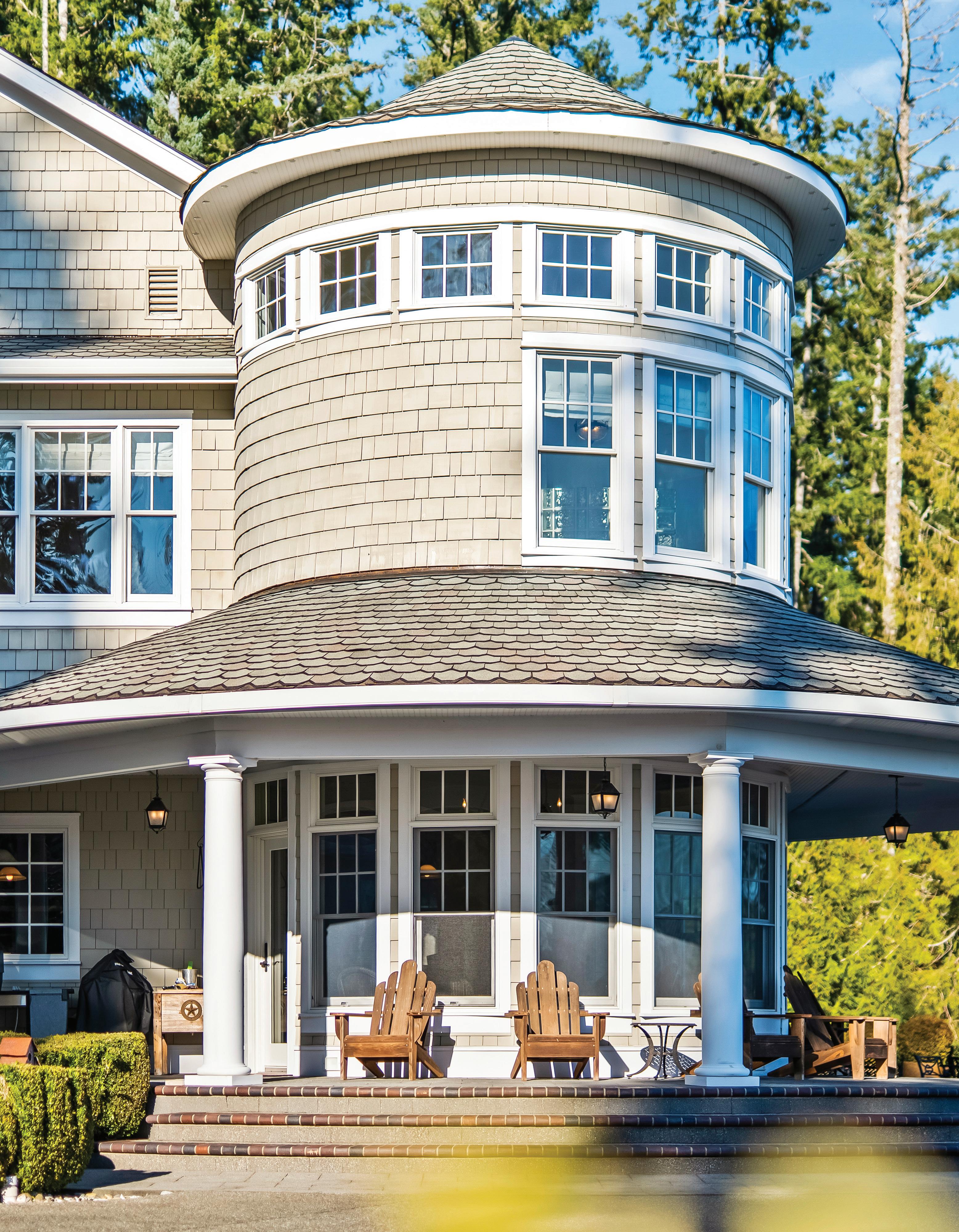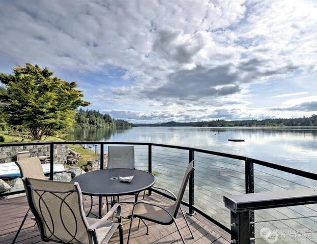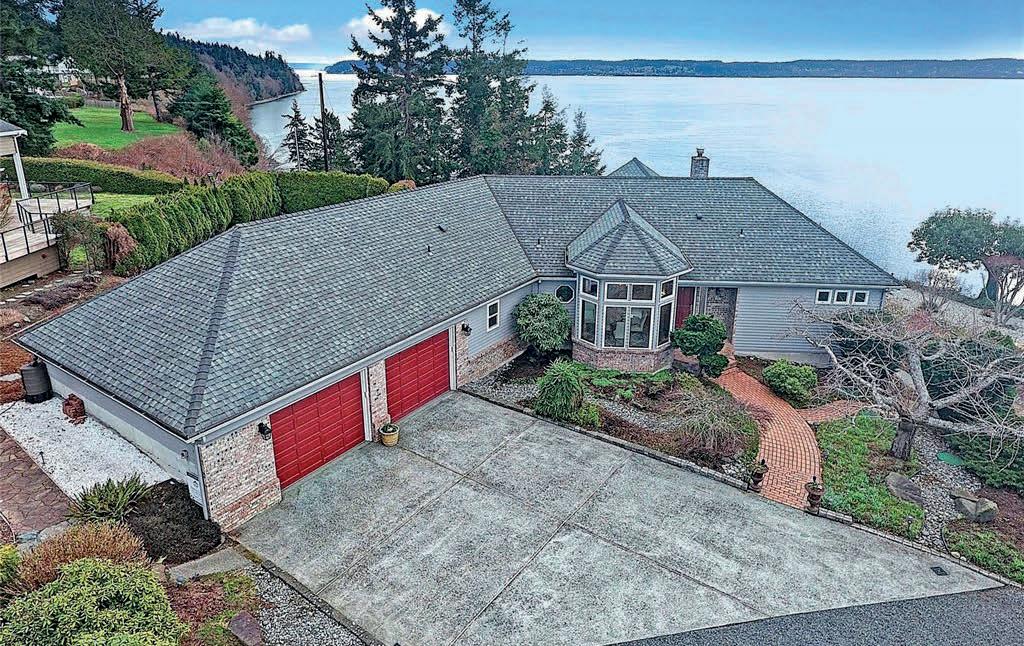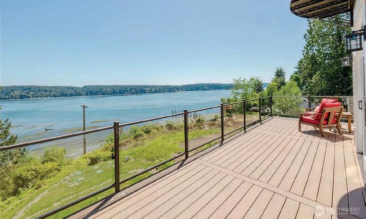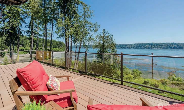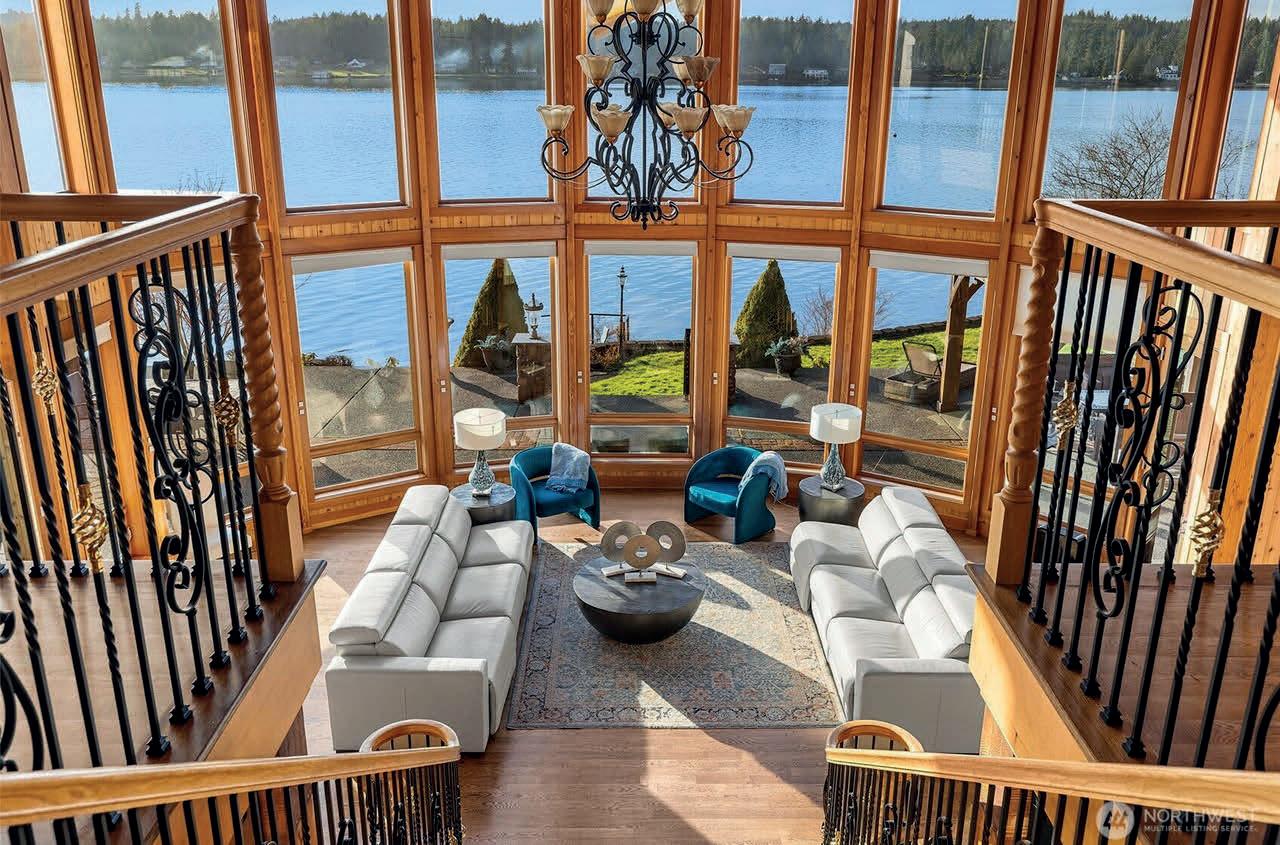 Timeless East Coast–inspired Shingle Style estate on a gated 5-acre sanctuary with 350’ of rare no-bank waterfront—a retreat created for those who prize privacy, beauty, and the ability to truly unplug. Tucked away from the world yet minutes from marinas, dining, and everyday conveniences, the property offers the ideal balance of complete seclusion with effortless access. The primary residence welcomes with soaring 20’ ceilings, an open yet intimate floor plan, walls of windows, wraparound porches, and sweeping views of Puget Sound and Mount Rainier. A chef’s kitchen with marble counters flows to the great room with stone fireplace, while a private spa wing with exercise area and hot tub becomes a personal wellness escape. The grounds invite a refined estate lifestyle: quiet mornings on the porch, meditative walks along your own beach, kayaking & paddle boarding, or casting for fish. Host friendly matches on the private tennis court, set out croquet or badminton on broad lawns, and gather at dusk around the outdoor fireplace. The beach is rich with oysters and clams, perfect for simple seaside suppers beneath brilliant stars. Main house offers 3 ensuite bedrooms; detached 3-car garage includes a guest apartment with 1 bed, 1 bath, and sleeping alcoves for guests or staff. Gardens, fruit trees, gazebo, and woodland trails create a setting where life slows and weekends feel like holidays. A rare legacy property for multigenerational gatherings and restorative escapes.