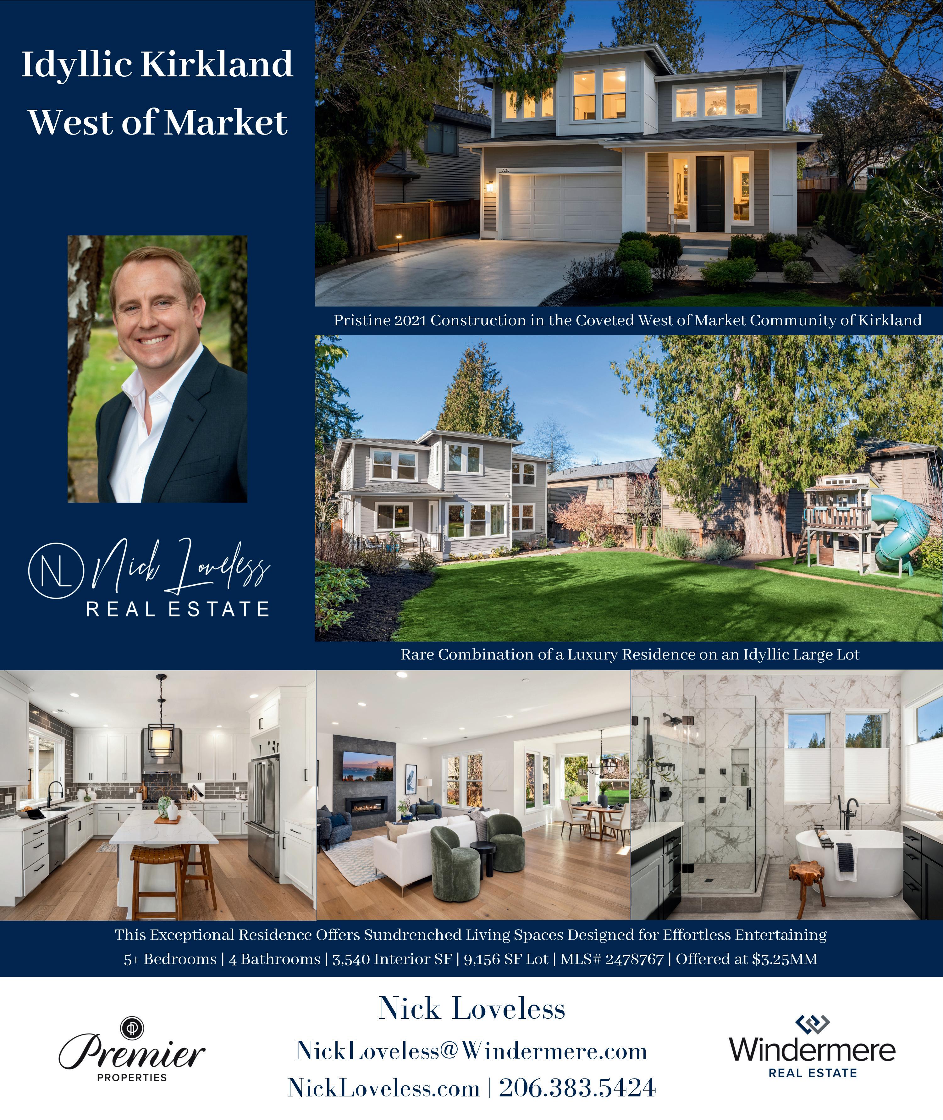 MLS 2465812 | $1,750,000 | Stunning estate homesite in the heart of Kirkland’s highly sought-after Holmes Point. This exceptional 36,524-squarefoot (.84-acre) lot is tucked away on a quiet lane in one of the most tranquil settings in all of Kirkland, featuring an original tennis/sport court and surrounded by towering evergreens and mature landscaping. Permits are nearing issuance for a 4-bedroom, 3.5-bath, 3,229-square-foot architectdesigned custom modern home with a 3-car garage and desirable westerly views showcasing rose-colored sunsets and the Olympic Mountains. Extensive permit-related studies and design work have already been completed, significantly streamlining the path to construction—whether you proceed with the current design or reimagine your own vision. The existing 1959 home offers over 4,000 square feet and is considered of minimal value, presenting a rare opportunity to build new in an established estate setting. The property borders over 600 acres of protected forests and parks and is just a short walk to waterfront Denny Park. Enjoy close proximity to the Holmes Point community boat launch, with surrounding new construction homes valued between $3M–$4M. An unparalleled “A+” location—just 10 minutes to historic Inglewood Golf Club and vibrant Juanita Village, and 15 minutes to downtown Kirkland’s shops, dining, and waterfront lifestyle. Don’t miss this opportunity to build your forever dream home in one of the Eastside’s most coveted neighborhoods.