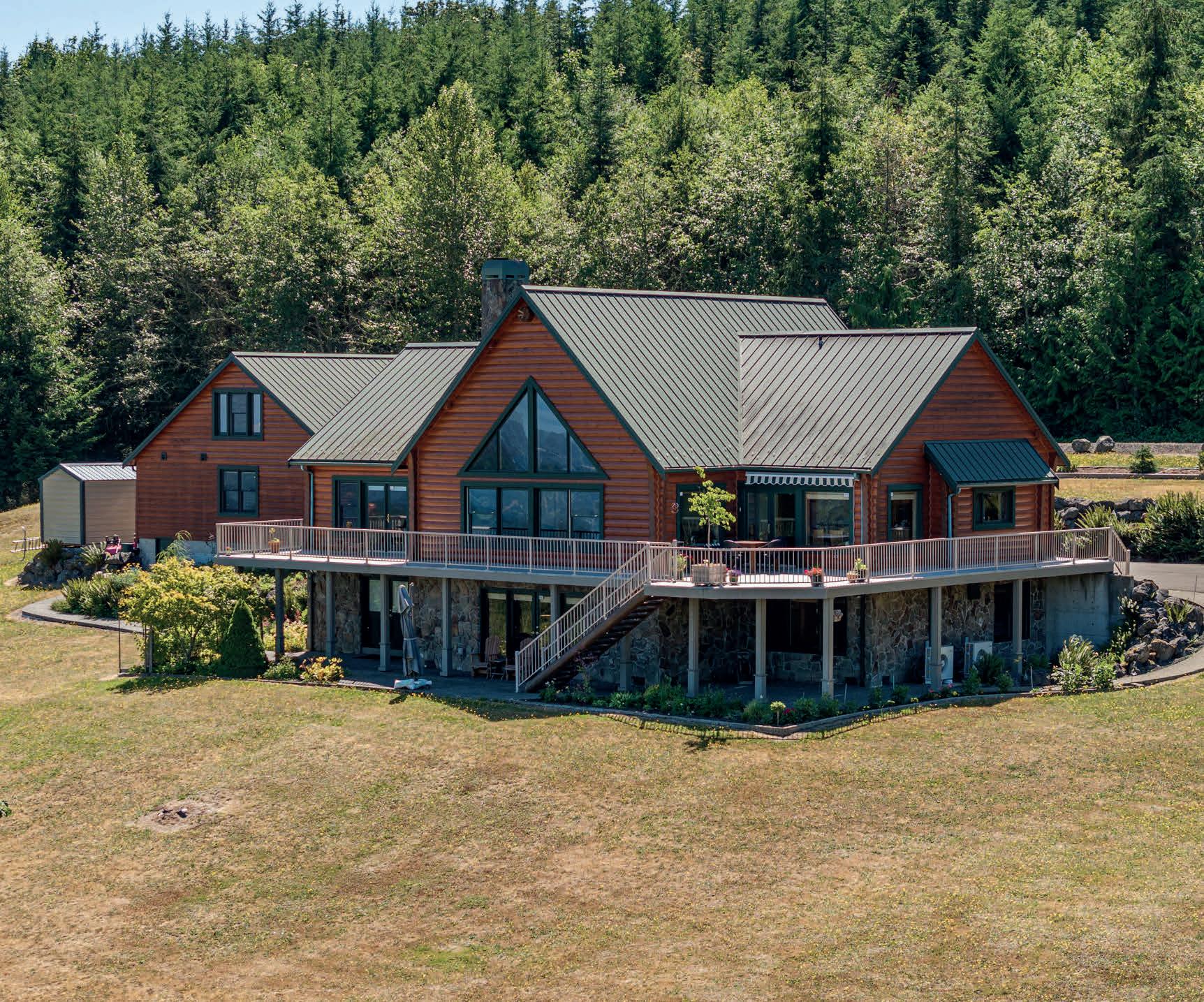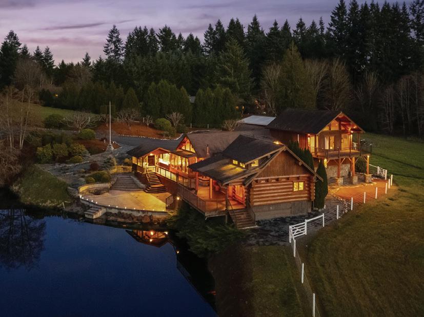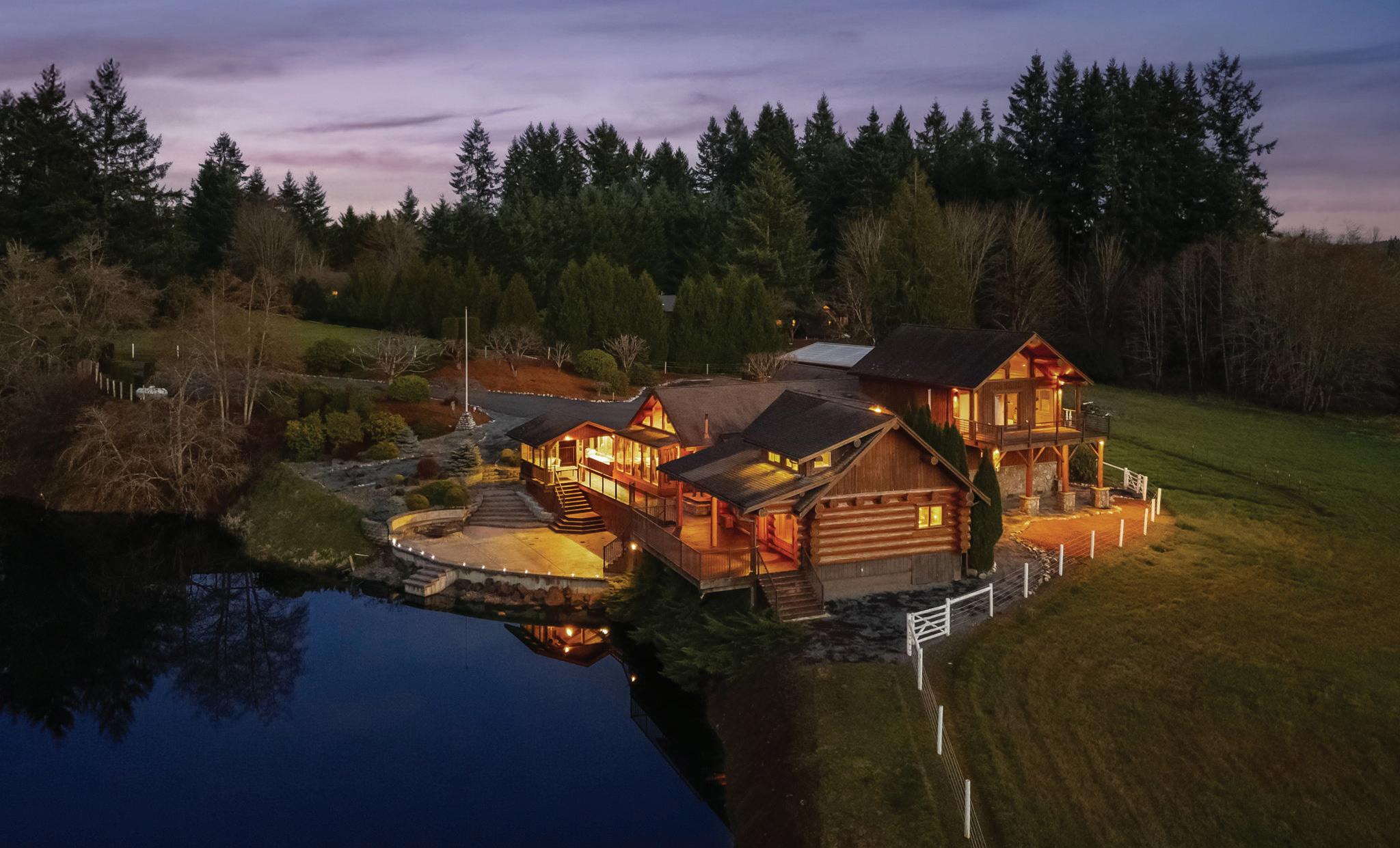 Custom Swedish Cope log home on 21 acres in Lewis County featuring a private spring-fed lake, equestrian pasture, and a 50×60 shop just minutes from Chehalis and Interstate 5.