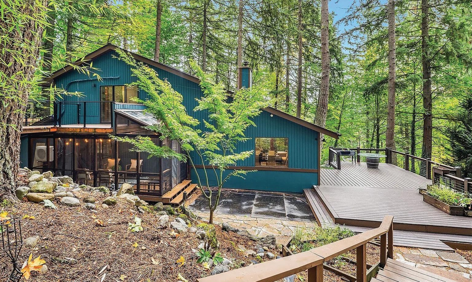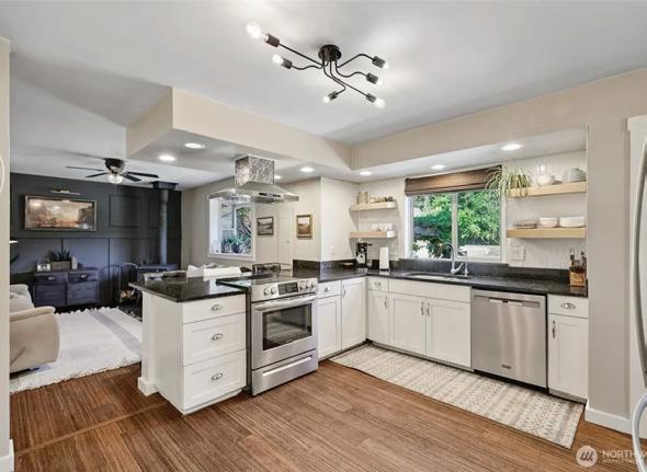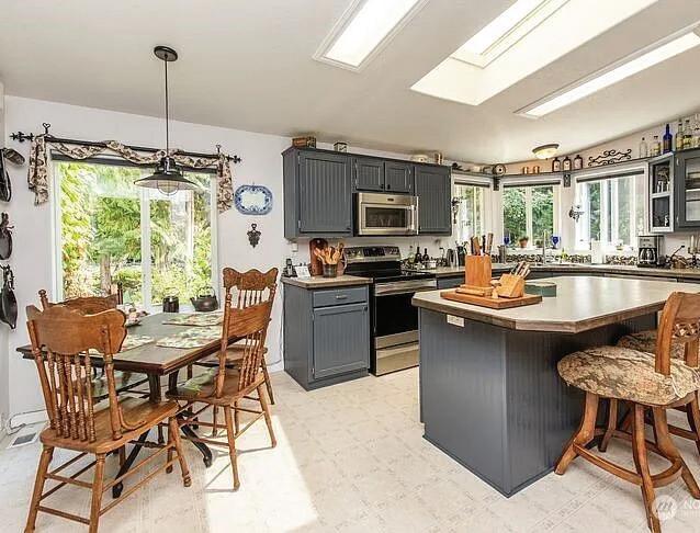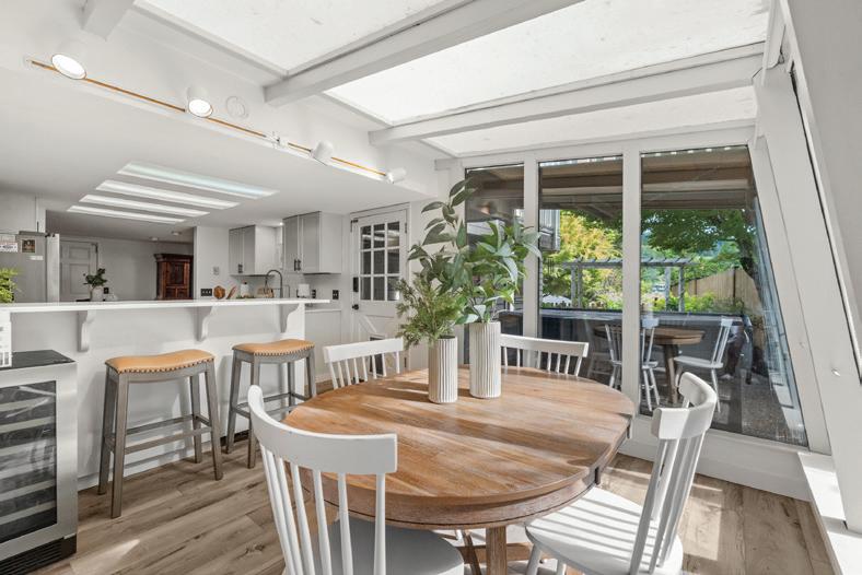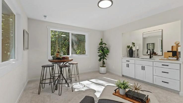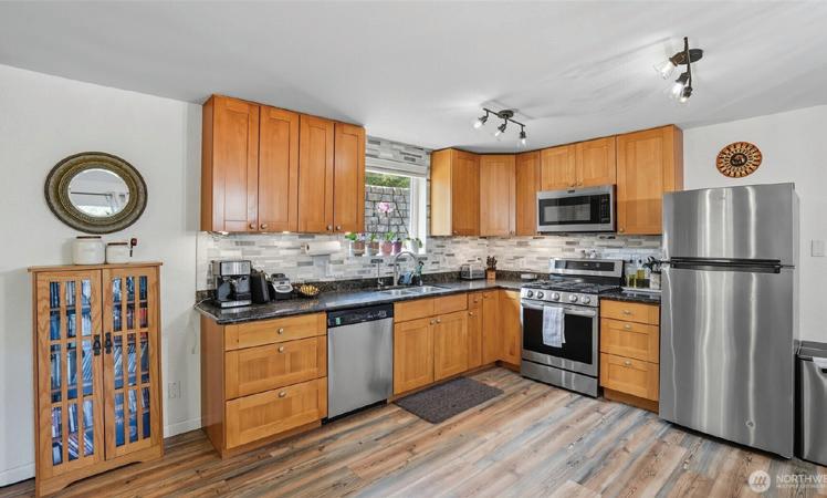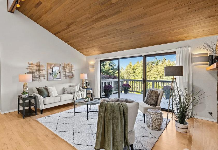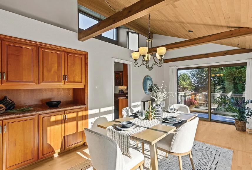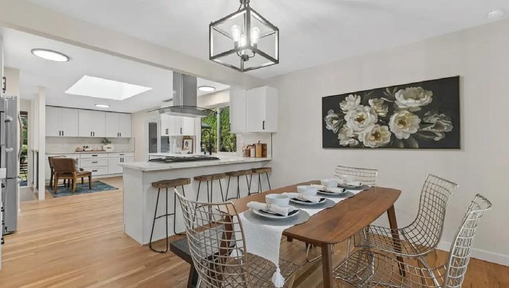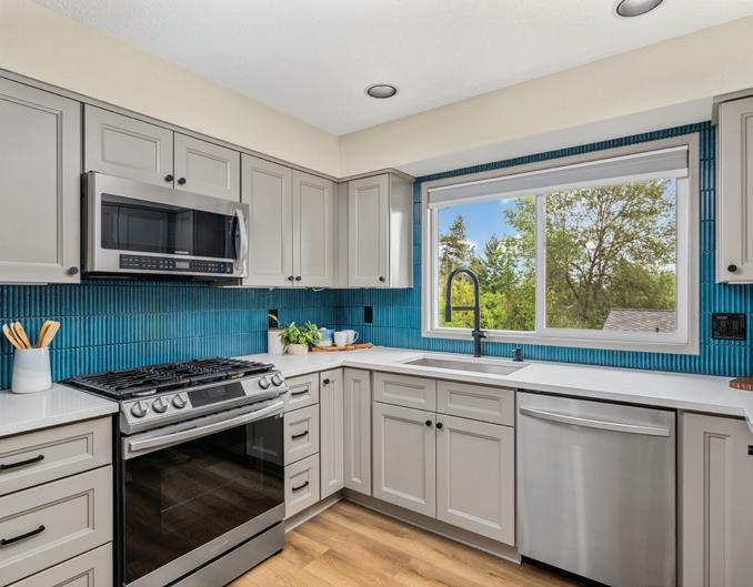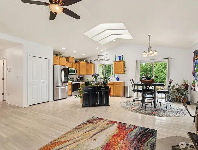 Step into a sleek, fully remodeled contemporary home where clean lines, vaulted ceilings and skylights flood the space with natural light. The open floorplan makes it just right for entertaining or simply kicking back. Think easy flow from kitchen to living to deck overlooking a mostly flat yard where summer BBQs and evening hangouts just feel right. Open the doors, let the kids or dogs run, throw on music, and live your life with space, light, and style. Inside, vinyl plank flooring runs throughout, giving you that cohesive look with zero fuss. The palette is smooth and sophisticated — soft grays with subtle accent tones that feel modern and warm. Three bedrooms offer flexibility for guests, a home office, or whatever your lifestyle needs.