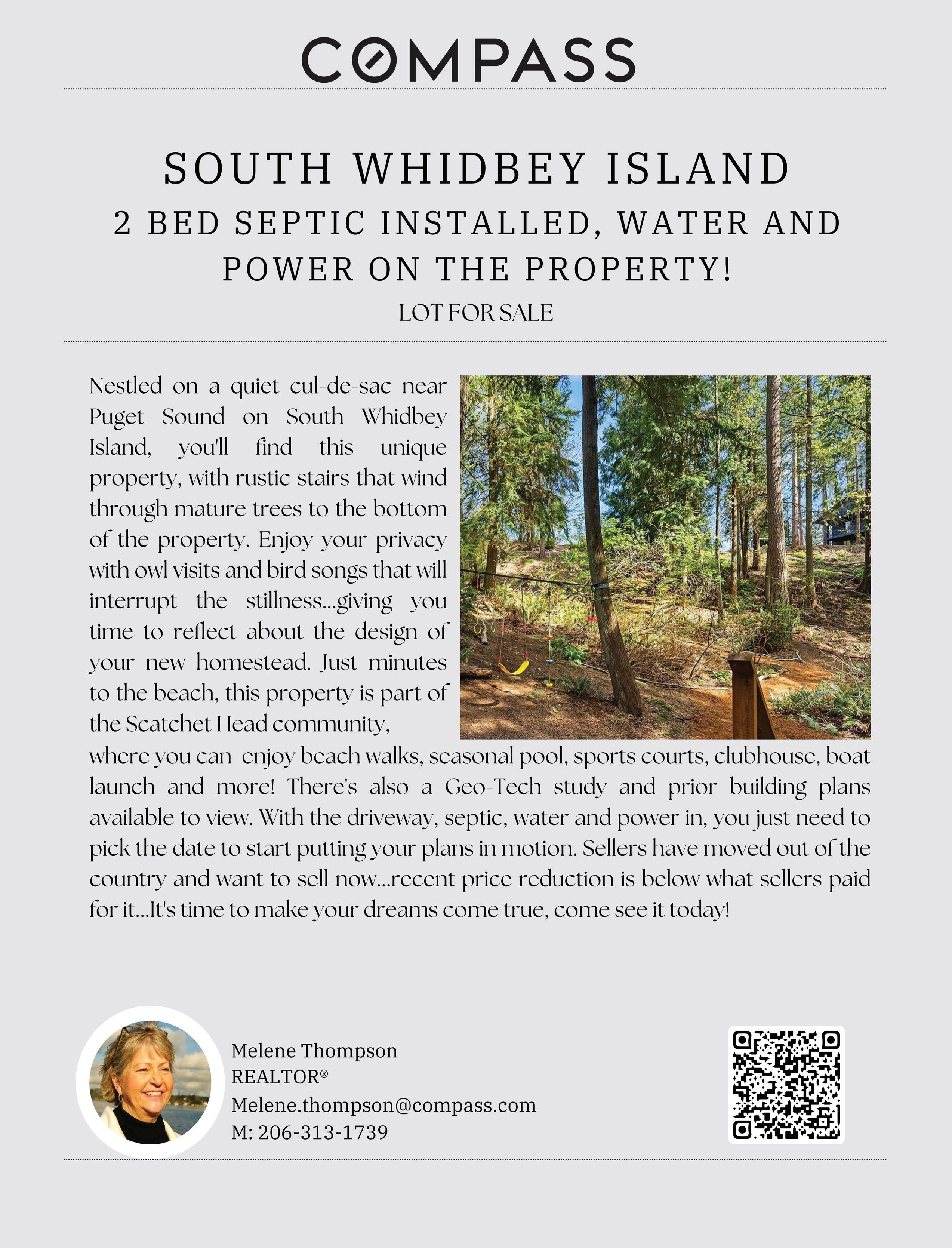 Nestled on a quiet cul-de-sac near Puget Sound on South Whidbey Island, you’ll find this unique property with rustic stairs that wind through mature trees to the bottom of the lot. Enjoy your privacy with owl visits and birdsong that gently interrupt the stillness—giving you time to reflect on the design of your new homestead. Just minutes from the beach, this property is part of the Scatchet Head community, where you can enjoy beach walks, a seasonal pool, sports courts, a clubhouse, boat launch, and more. A geotechnical study and prior building plans are also available to view. With the driveway, septic, water, and power already in place, you just need to pick your date to start putting plans in motion. Sellers have moved out of the country and are ready to sell now. The recent price reduction is below what they originally paid for it—so it’s time to make your dreams come true. Come see it today!