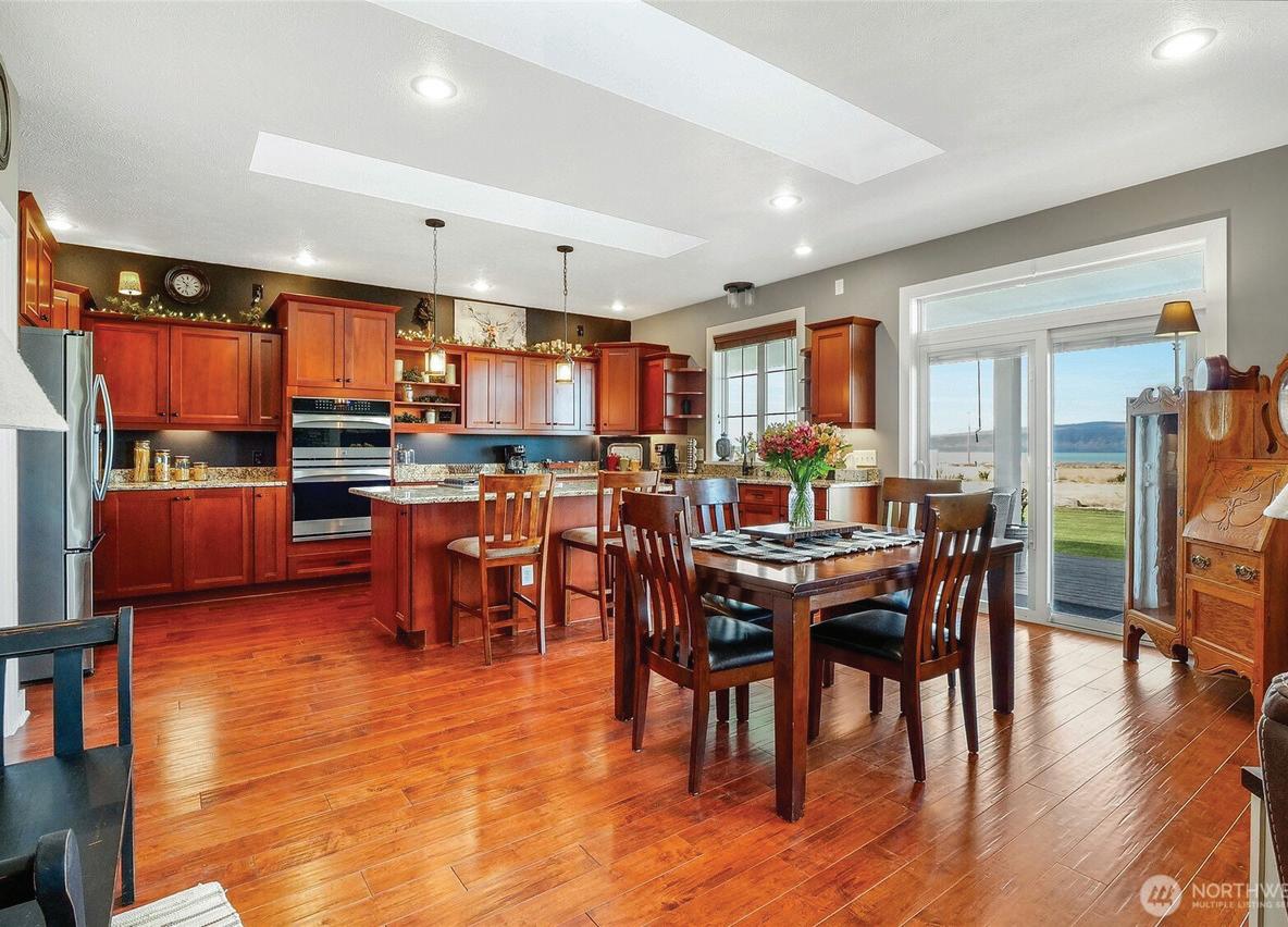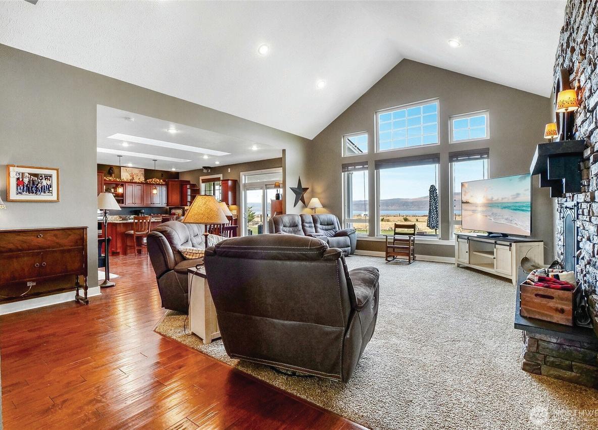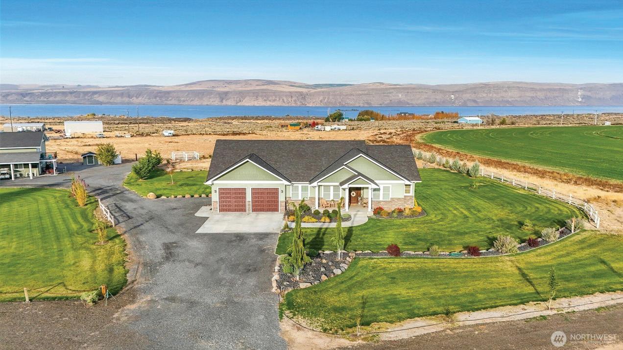 On a manicured 3.2 acres, this high-end home with 3 bedrooms plus an office exudes exceptional craftsmanship and luxury. The open concept great room impresses with vaulted ceilings, a cozy propane fireplace, solid hardwood floors, and a wall of windows showcasing breathtaking views of Banks Lake and its dramatic basalt cliffs. The spacious primary suite offers double sinks, a beautifully tiled shower, and a big walk-in closet. The gourmet kitchen is a chef’s delight, featuring a gas stove, custom cabinetry and granite countertops. Step outside to the Trex deck to soak in the scenery, or to enjoy the insulated, fully finished, RV-sized 1700+ sq ft shop with 864 sq ft guest quarters - perfect for visitors, storage and extra workspace.