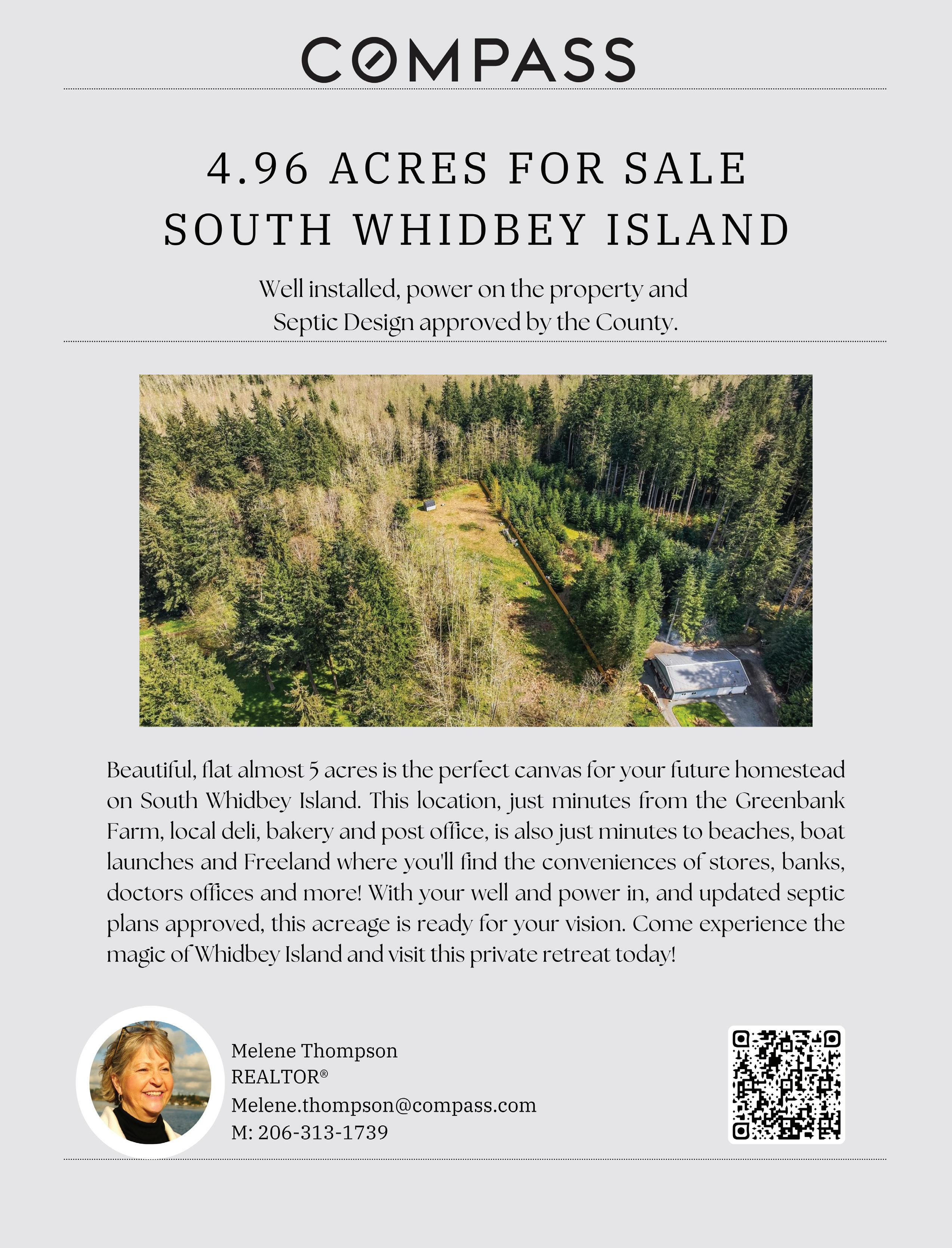 This beautiful, nearly 5-acre flat lot is the perfect canvas for your future homestead on South Whidbey Island. Just minutes from the Greenbank Farm, local deli, bakery, and post office, this location also offers easy access to beaches, boat launches, and Freeland, where you’ll find the conveniences of stores, banks, doctors’ offices, and more. With your well and power already in place, and an updated septic design approved by the county, this acreage is ready for your vision. Come experience the magic of Whidbey Island and visit this private retreat today!