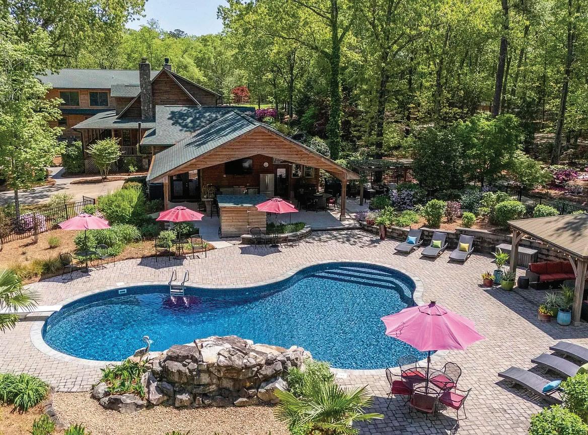 Resort style Outdoor Oasis with heated pool, spa, fire pit, cooking area, and pool house.