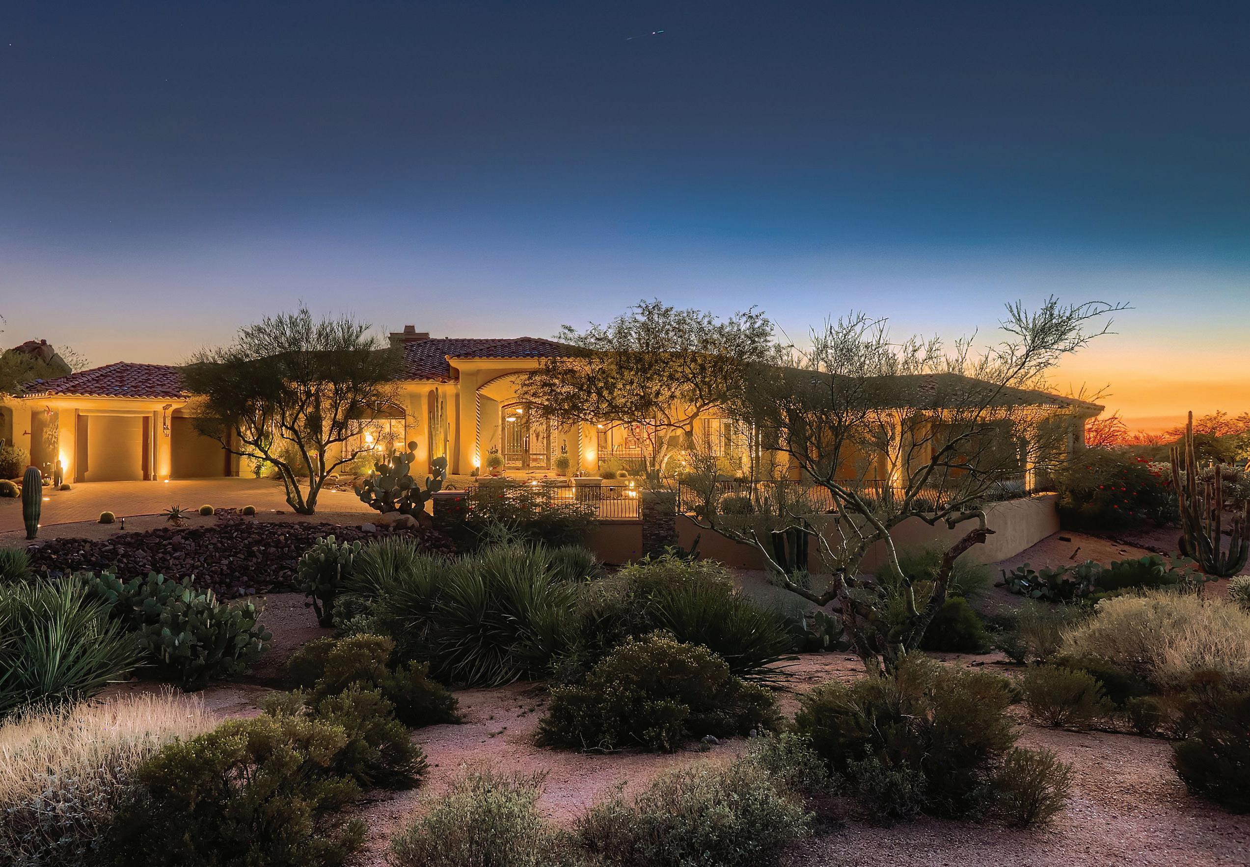 and generous gathering areas. Nearby, a temperature-controlled wine room and private 12-seat theater offer spaces for intimate evenings or larger gatherings. A detached 1,200-square-foot guest house further enhances the home’s flexibility, providing a private retreat for visitors or extended stays. Outdoors, the property unfolds into a resort-style environment shaped by thoughtful design and significant investment. A heated pool and spa with cascading water features are complemented by multiple covered patios, a firepit lounge, and recreational amenities that encourage year-round enjoyment in Arizona’s climate.