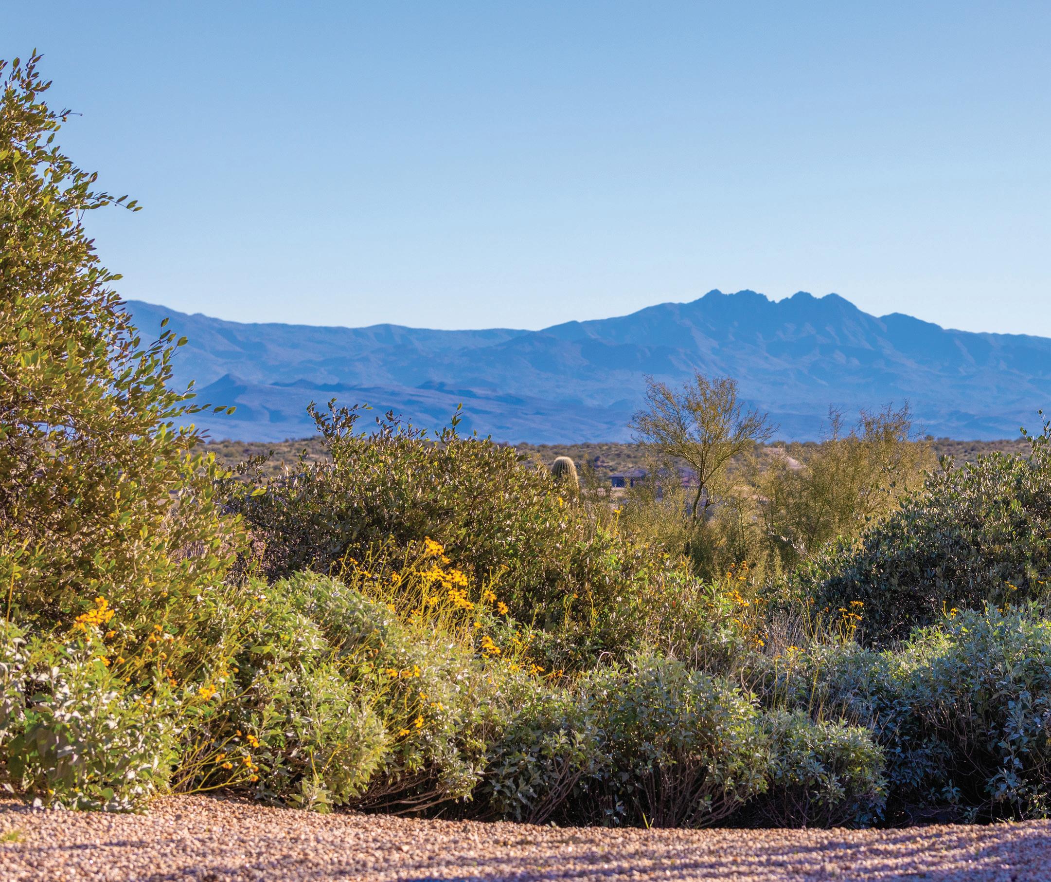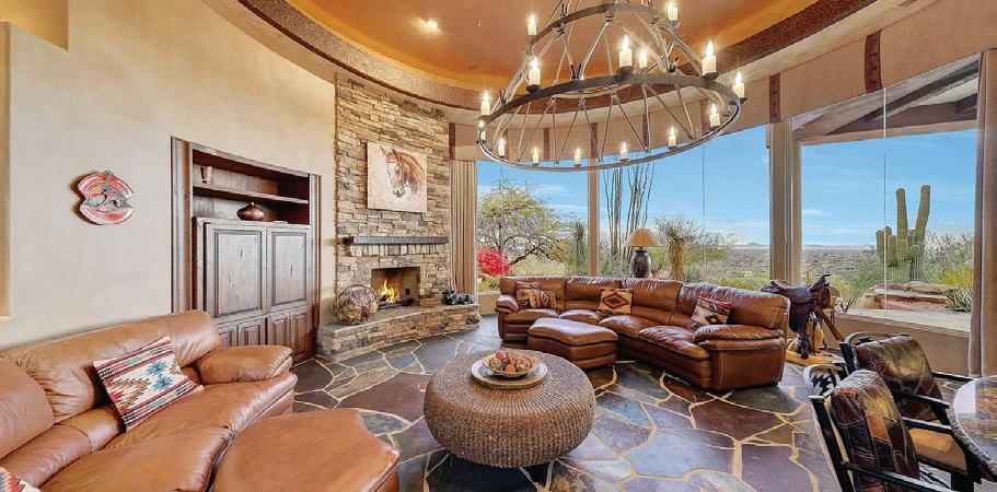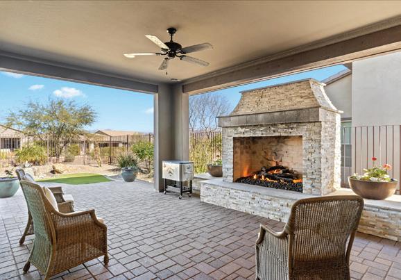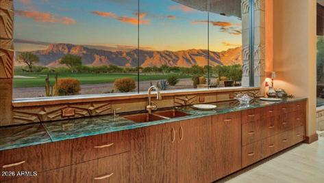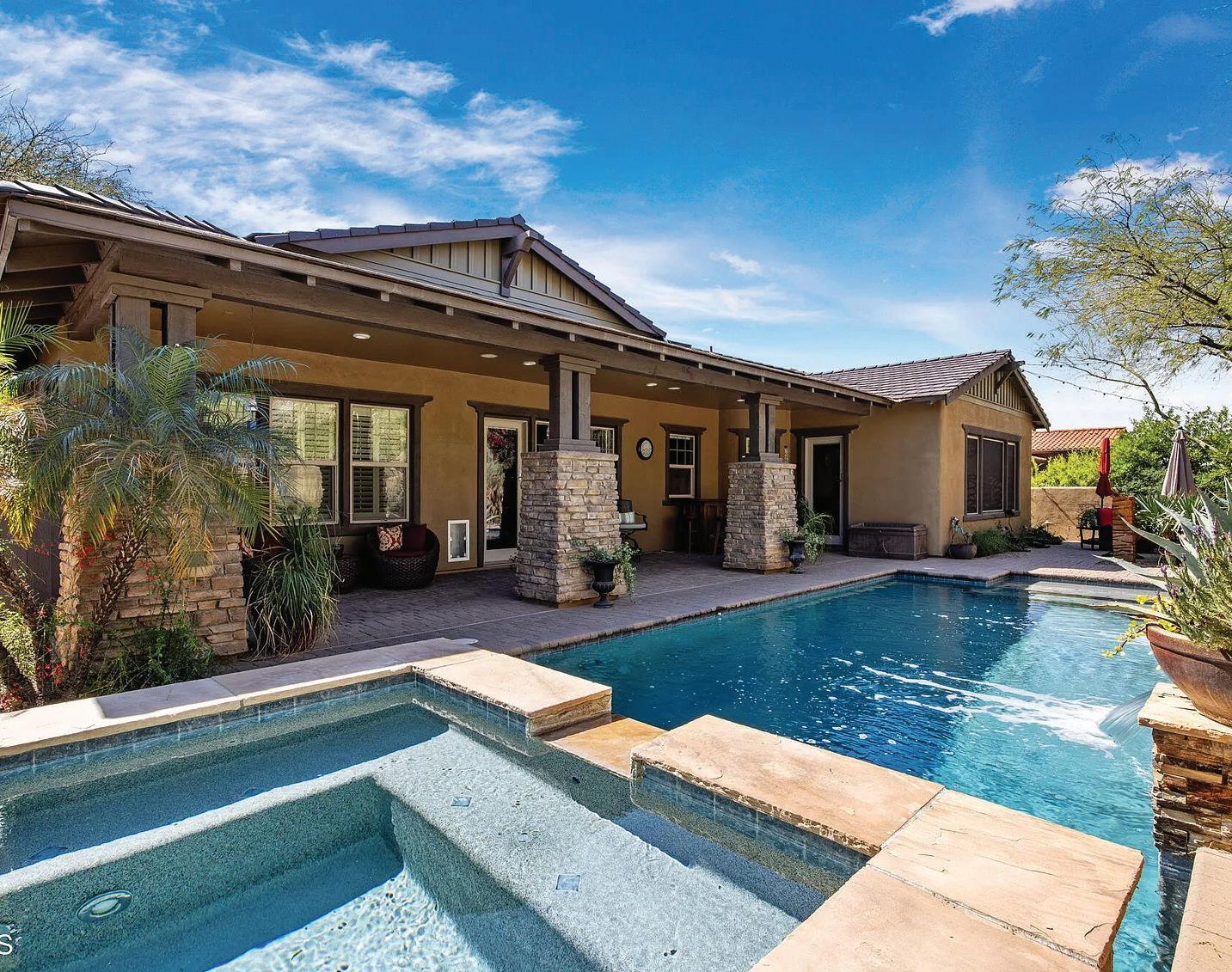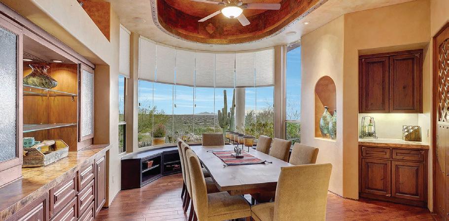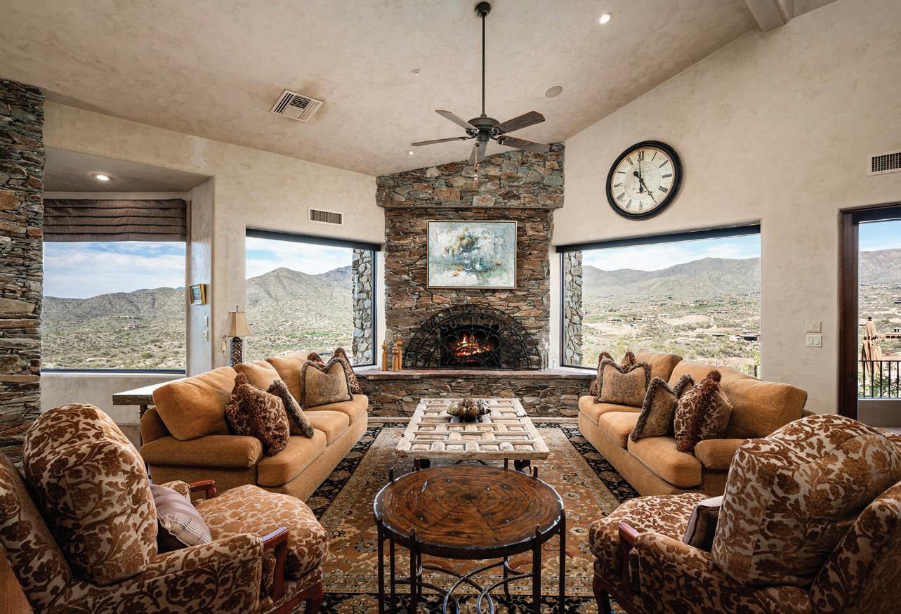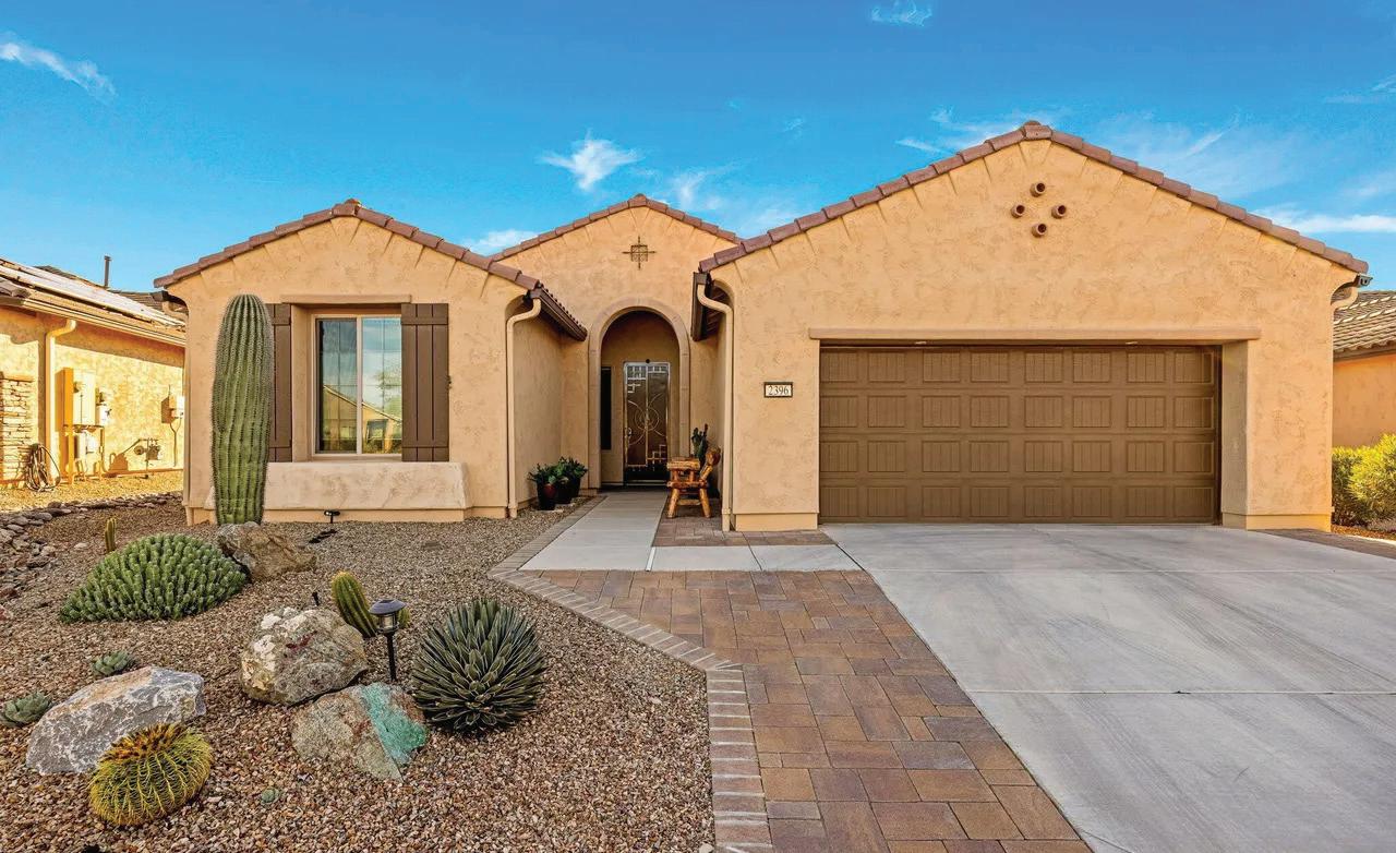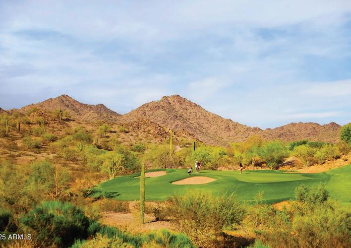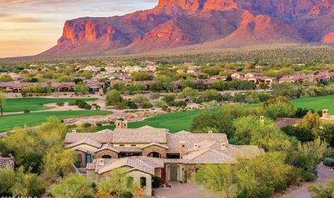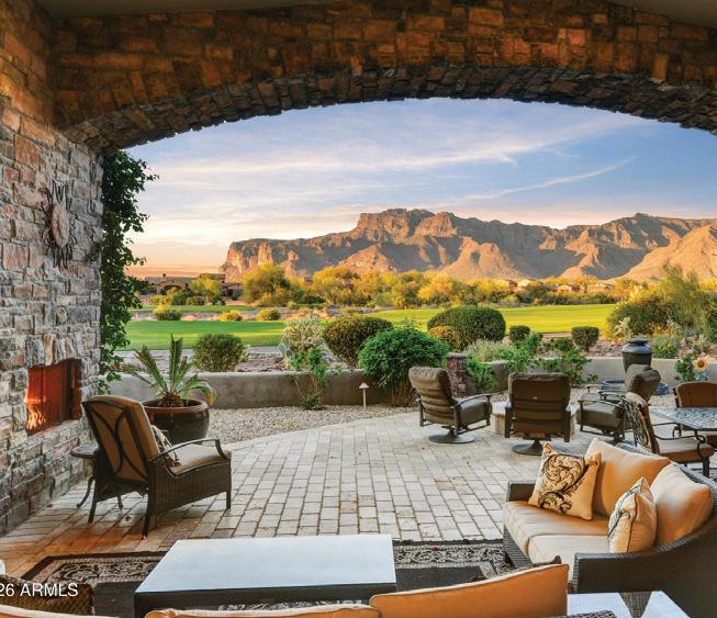 Spectacular Spanish Contemporary with Superstition Mountain views and protected open desert create a remarkable setting for this custom residence located within the prestigious Superstition Mountain Golf & Country Club. Built in 2017, this highly upgraded home borders Arizona State Trust Land and the Tonto National Forest, creating what feels like a private five-millionacre backyard protected by State Trust Land and grazing leases surrounding Sonoran Desert beauty. Thoughtfully designed to capture the dramatic scenery, the home features a 10-foot wall of glass that fills the great room with natural light and breathtaking views of the Superstition Mountains. Situated in a quiet village setting with no through traffic, the property also, borders community open space directly across the street, enhancing the sense privacy and openness.