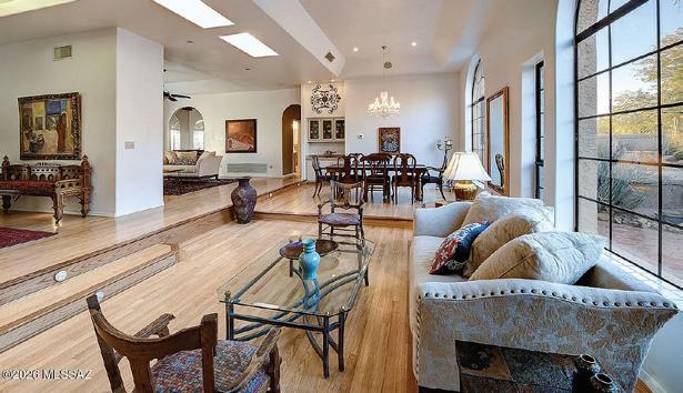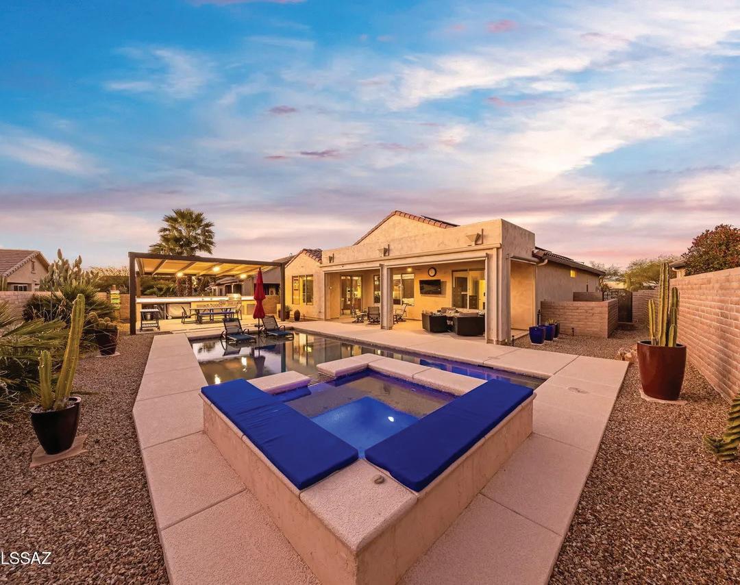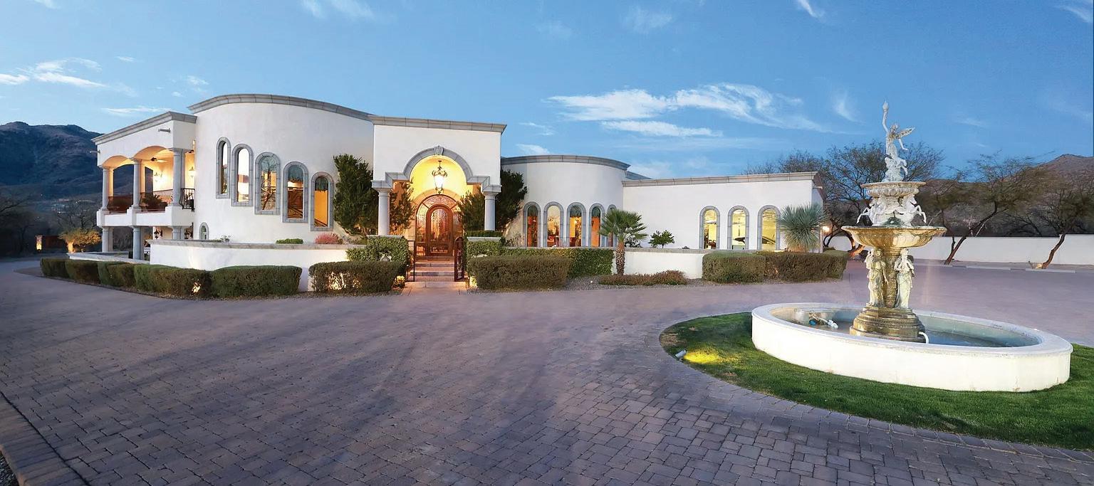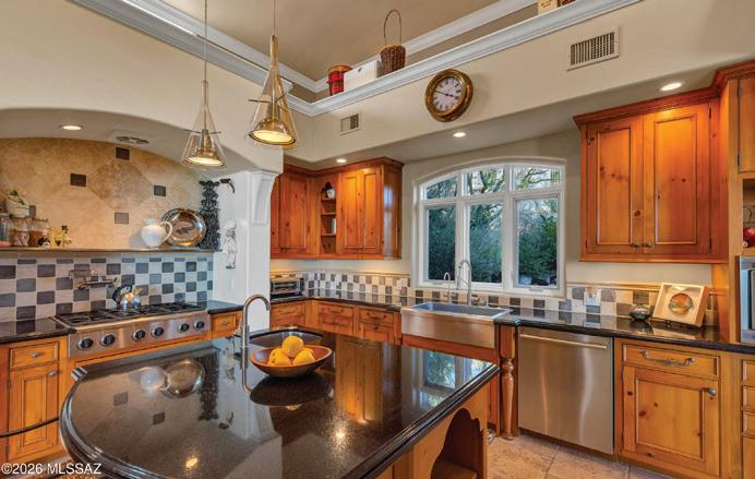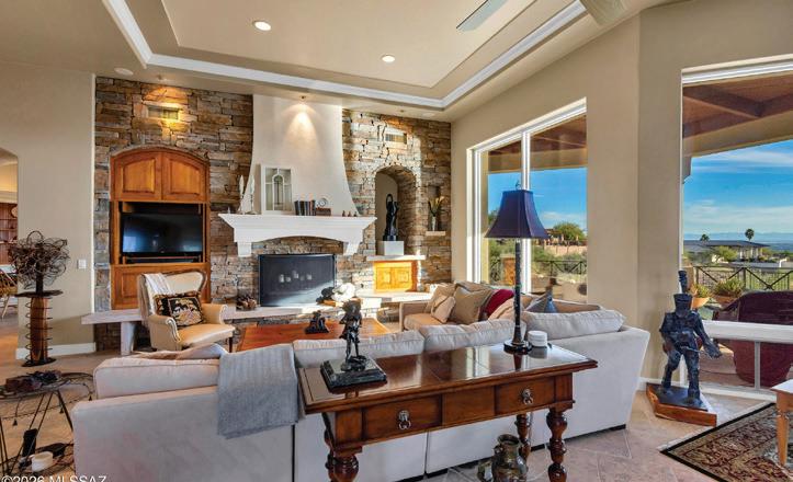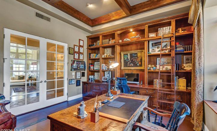 Spectacular Mediterranean Tuscan 6,030 sq ft, 6 bedrooms, 6 baths home in Tucson, AZ. Stunning custom entrance and gate, driveway that winds through manicured grounds with an Italian fountain. Inviting foyer and formal living room with gorgeous, lighted coffered ceiling. Gourmet chef’s kitchen, Wolf appliances, custom alder wood cabinetry and granite countertops. Primary suite has sweeping views from east and west balconies and features a sitting area, coffered ceiling, stone fireplace, rich wood flooring, two expansive walk-in closets and its own washer and dryer. Spa-like bath with jetted tub, steam shower and dual water closets and vanities. Recreation/media room with optional pool table, shuffleboard and a fitness center with a dry sauna. There is also a private detached guest house with laundry, garage and storage. Sparkling saltwater pool with slide, spa and three ramadas with outdoor kitchen, dual built-in BBQ grills, refrigerator, sink, fireplace and TV. Children’s play area with turf and a custom playset, plus a lighted pickleball and basketball court.