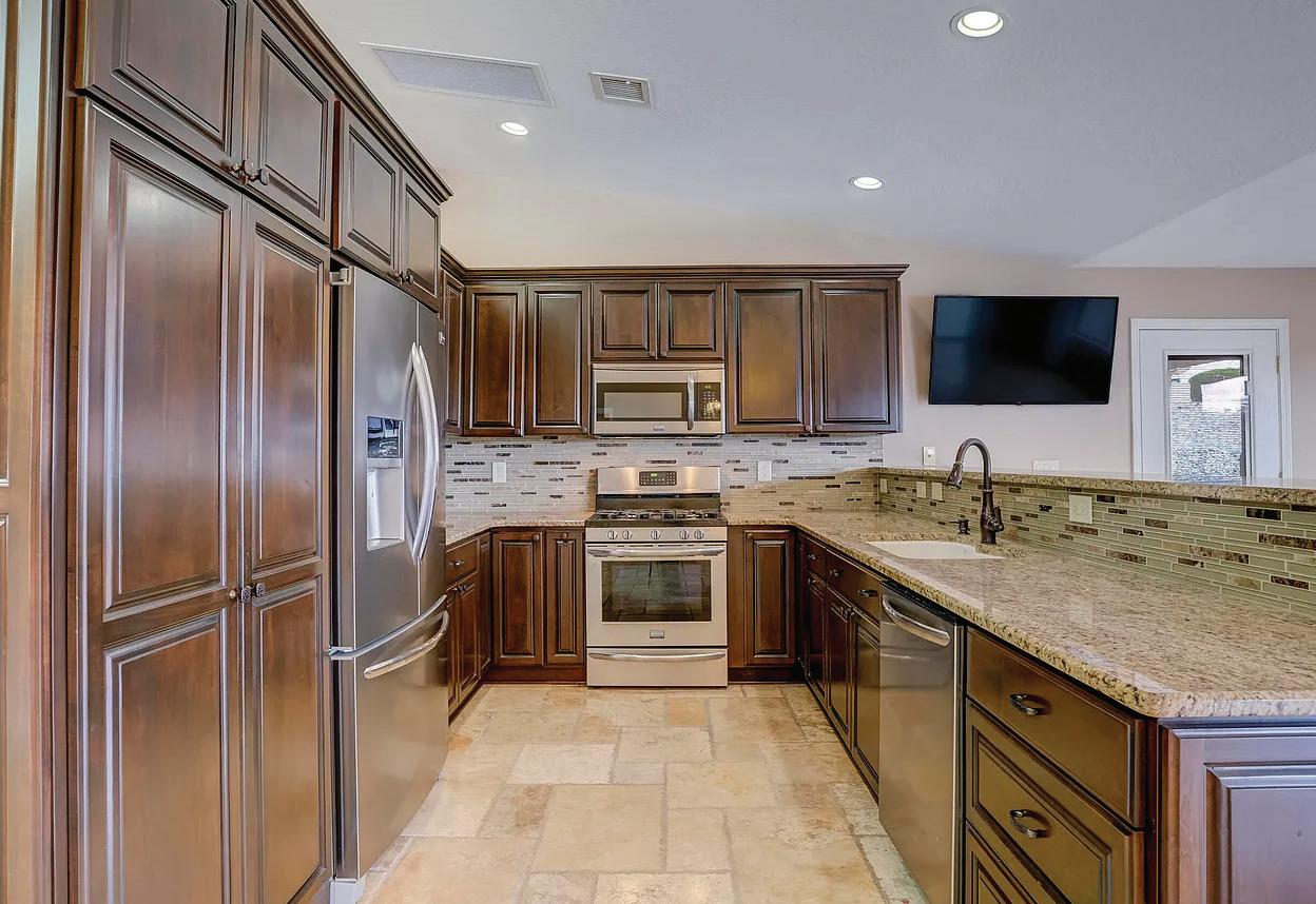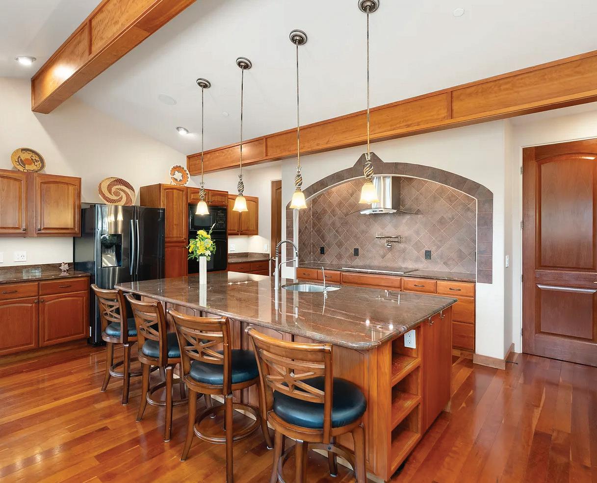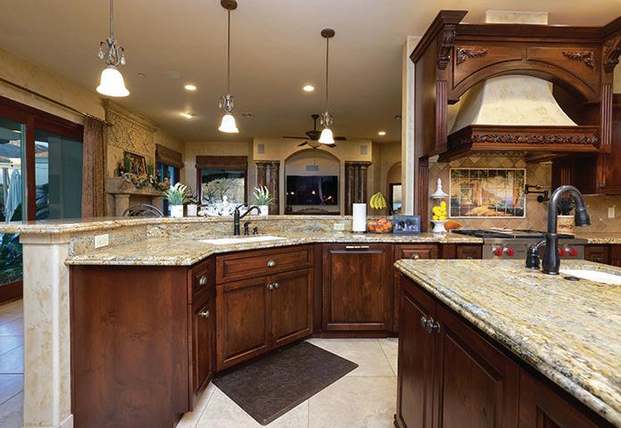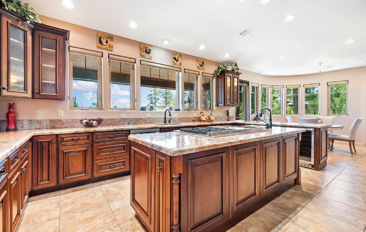 The chef’s kitchen is thoughtfully appointed with granite countertops, abundant high-quality cabinetry, a Sub-Zero refrigerator, LG appliances, warming drawer, under-counter wine cooler, and a uniquely designed dual-level dishwasher.