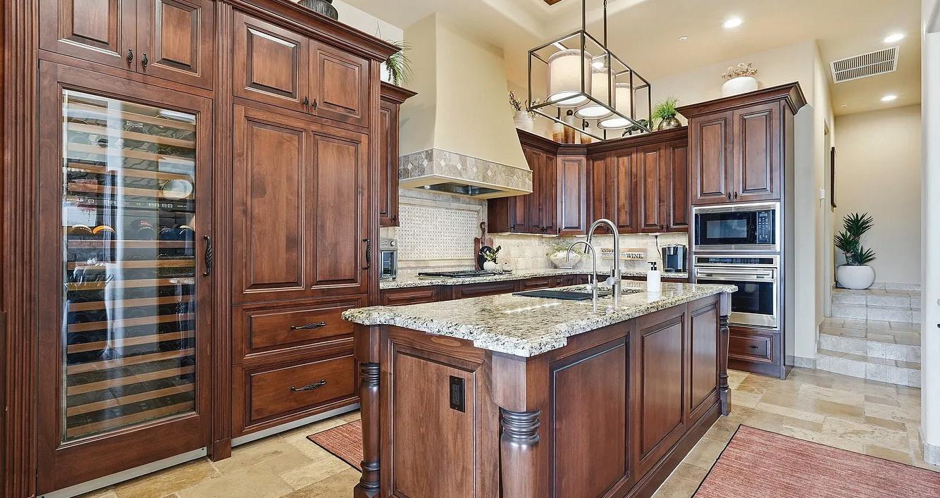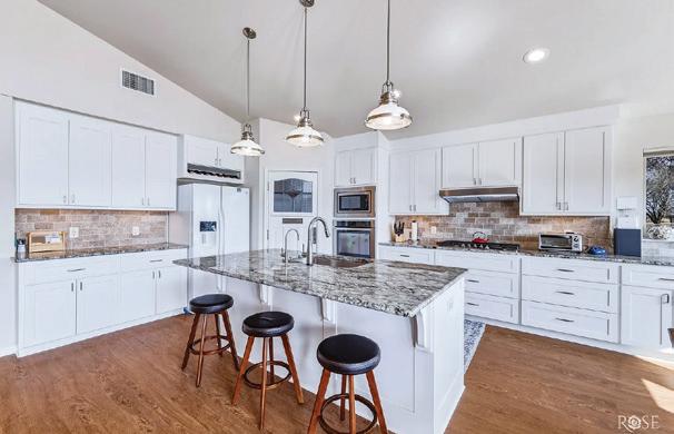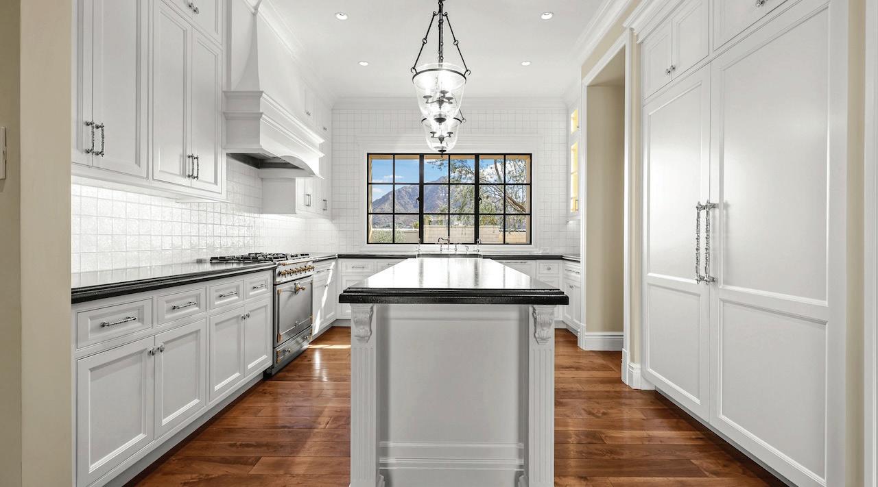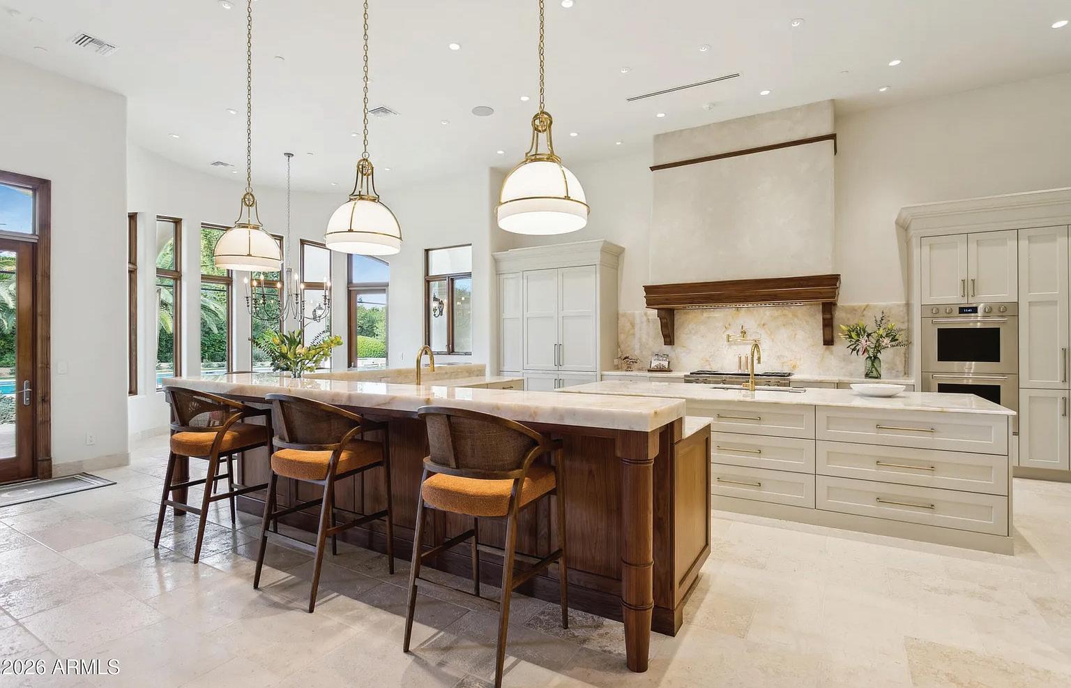 The chef’s kitchen is thoughtfully appointed with granite countertops, abundant high-quality cabinetry, a Sub-Zero refrigerator, LG appliances, warming drawer, under-counter wine cooler, and a uniquely designed dual-level dishwasher.