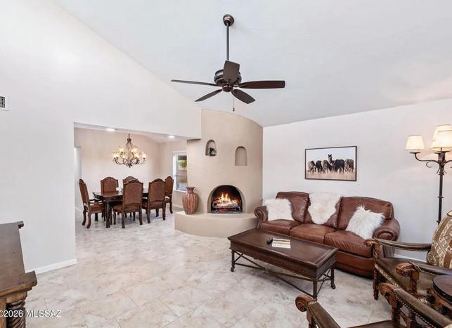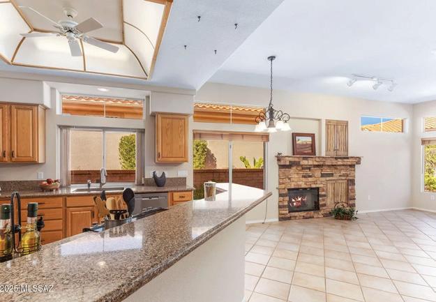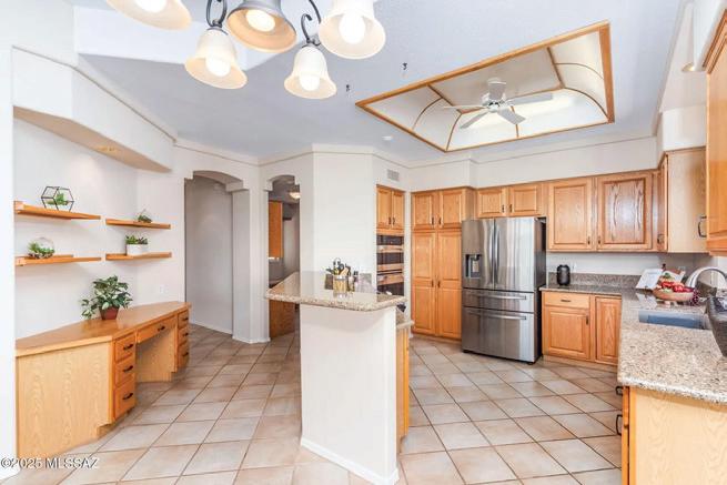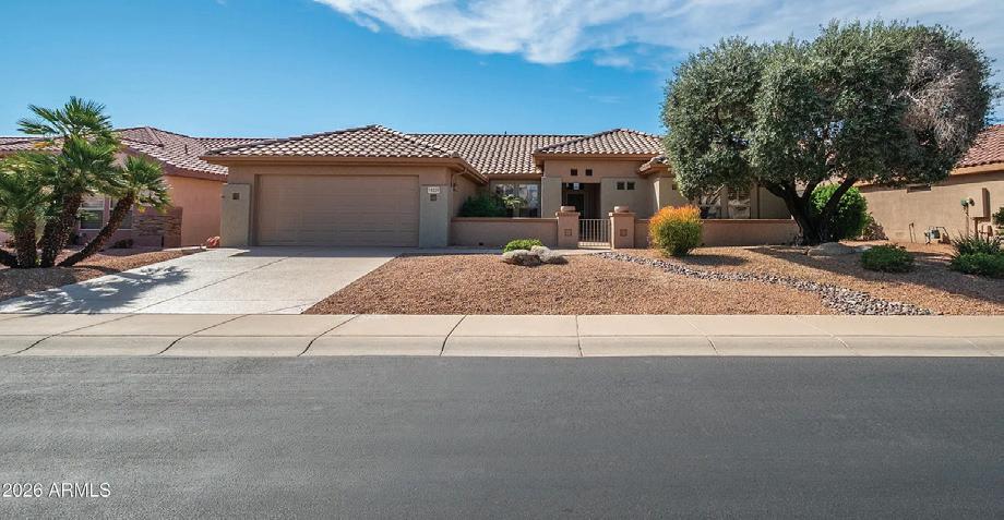 Gorgeous 1,964 SqFt, 2 Bedroom, 2 Bath home with a bonus office area is located in the Premier Active Adult Community, Sun City Vistoso in Oro Valley. From the moment you set eyes on this Impeccably Maintained property you will be delighted by how Spacious, Bright and Beautiful this home is. The flagstone walkway will guide you through the courtyard with mature landscaping, to a glass double door entry with wrought iron security door allowing the fresh air in. Once inside, the foyer welcomes you to an open floor plan that is complimented by soft neutral tones, ceramic tile flooring, high ceilings, and window walls that let in an abundance of natural light and boast gorgeous garden views with an easy flow throughout the home for comfortable living and entertaining guests. The spacious living room offers a separate Dining Area that is perfect for special occasions or enjoying game night with friends. An additional family room adjoins the kitchen and features a stacked stone gas fireplace and is open to a casual dining area, an updated kitchen with granite countertops, SS appliances, electric range, 2 ovens, a breakfast bar, and more... Adjacent to the kitchen is a built in desk and an additional private office space offering a built-in desk with upper cabinets & closet. The oversized two car garage has an epoxy floor, built-in cabinets for storage, a utility sink, access to side yard, and designated space for a washer and dryer. The Primary Suite boasts beautiful garden views and is appointed with wood grain tile flooring, a double sink vanity, soaking tub, walk-in shower, and a large walk-in closet. The hall bath with tub and shower, accommodates guests and the secondary bedroom, which features two large windows, a ceiling fan, sliding door closet, and carpet. If you enjoy gardening and a tranquil space to relax and unwind, you will absolutely fall in love with the meticulously maintained yard, boasting raised flower beds, a pond with waterfall, lush vegetation that provides privacy and the expansive patio that offers shade and accommodates ample seating space for your enjoyment. Welcome home and enjoy all that Sun City Vistoso has to offer!!! NOTABLE FACTS: Driveway & Garage Floor Coated with Epoxy Sept. 2023; New Interior Paint Throughout 2023; New Carpet Installed in Bedroom & Closets 2024; New Electric Stove; New Refrigerator 2024; New Dishwasher 2024; Roof Replaced 2018; HVAC Replaced 2019; Hot Water Heater Replaced 2019. Seller did not activate the alarm therefore shall convey As Is.
