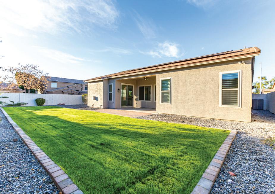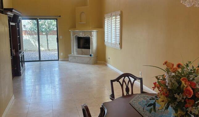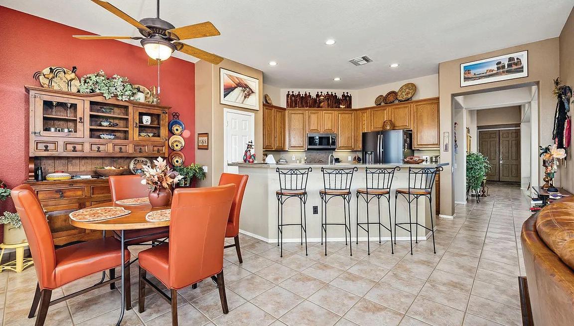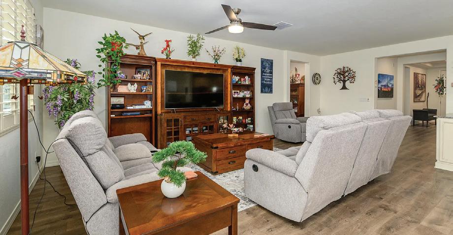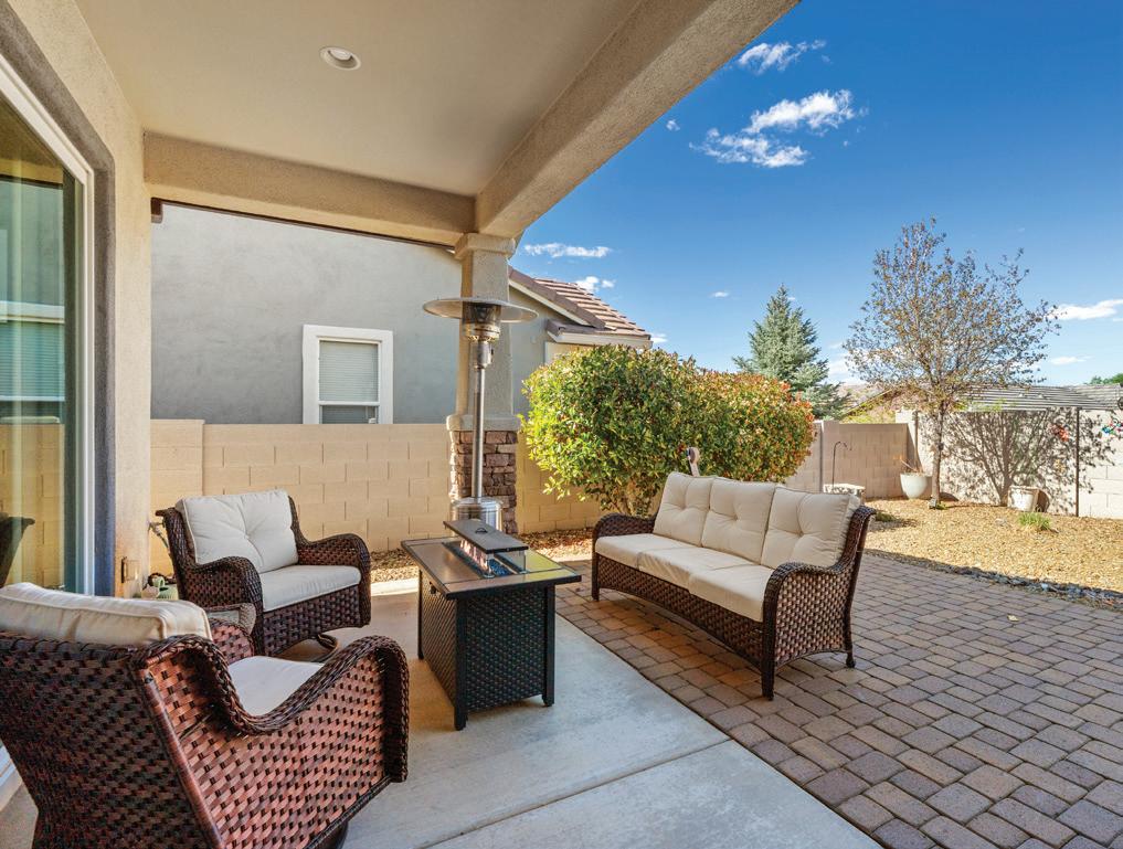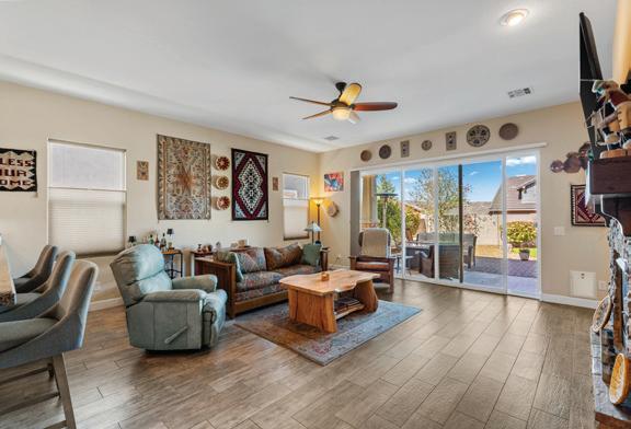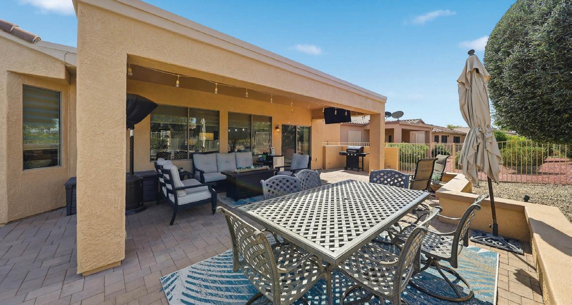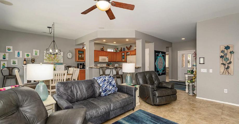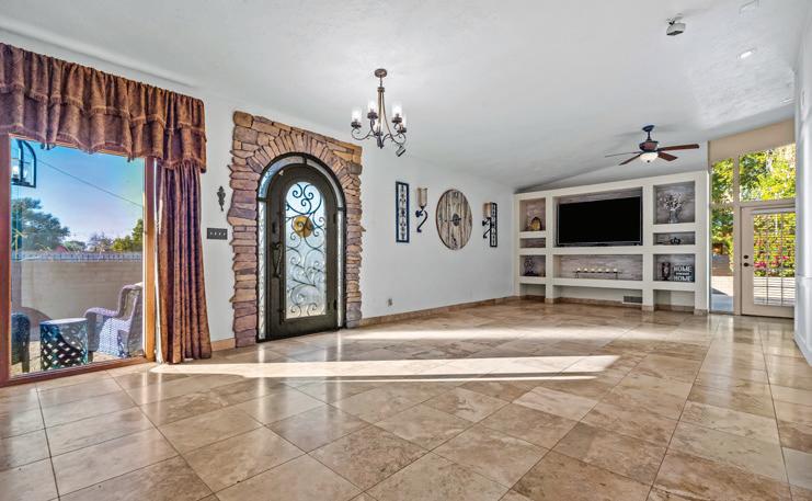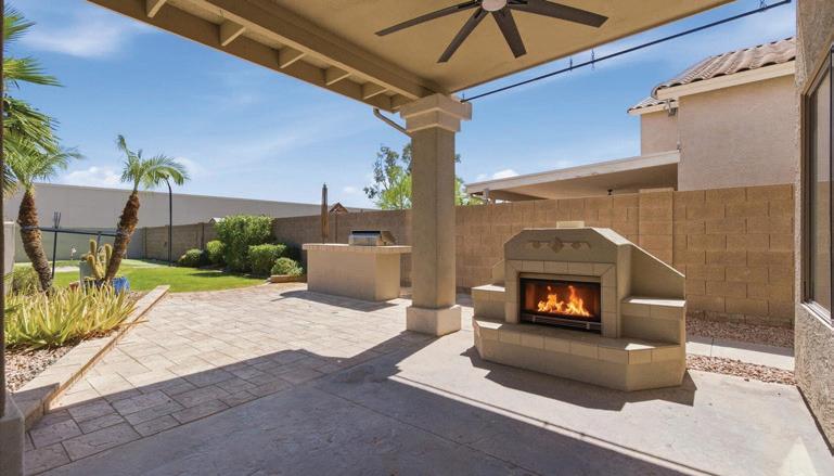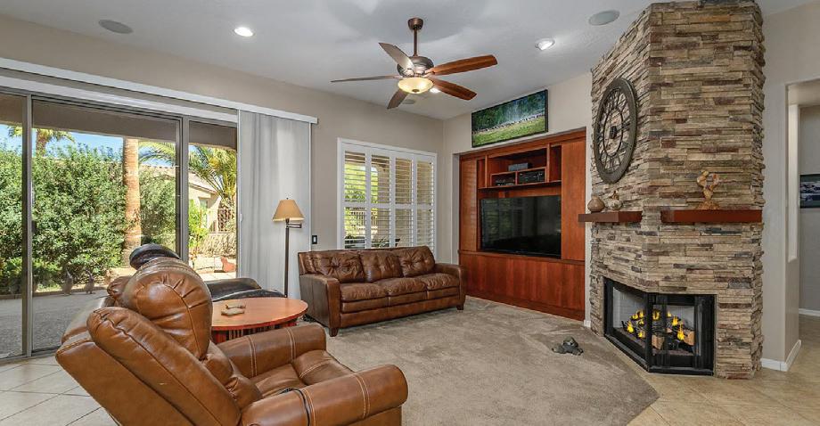 Just beyond, the great room centers around a cozy gas fireplace with custom tile— perfect for quiet nights in or gathering with friends. Natural light pours in through the Pella triple-pane sliding door system, keeping the home bright while supporting a calm, comfortable interior. Step outside to true Arizona outdoor living with a large, extended flagstone patio—ideal for grilling, dining under the stars, pets and play, or simply relaxing—plus mature landscaping that adds privacy and color without the high-maintenance to-do list.