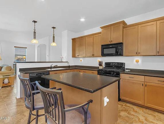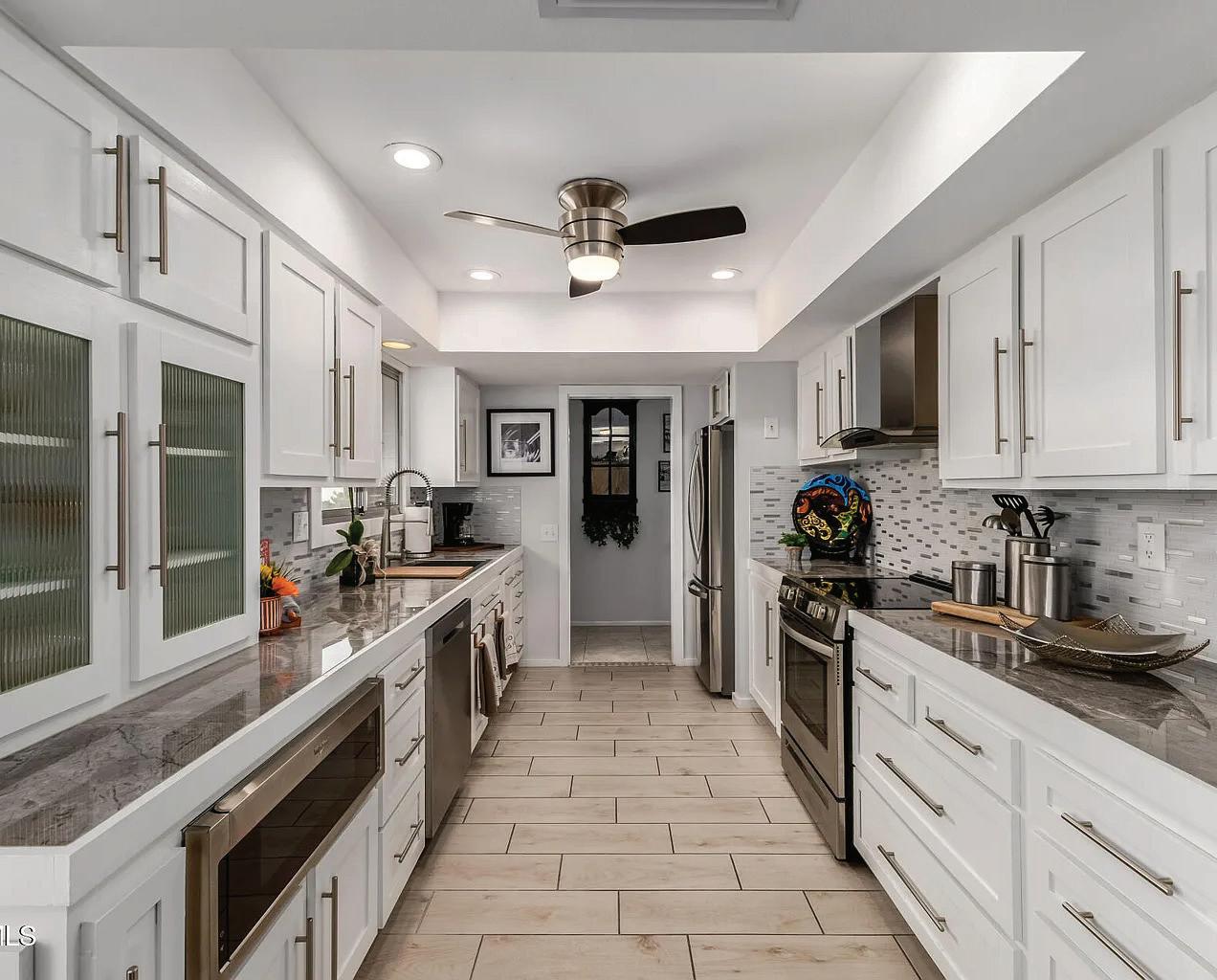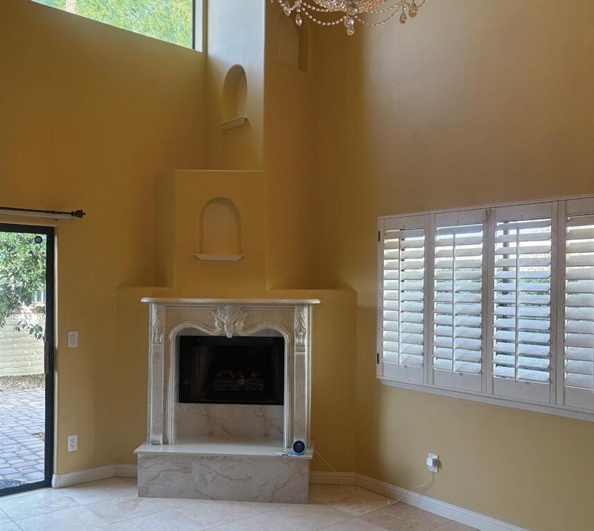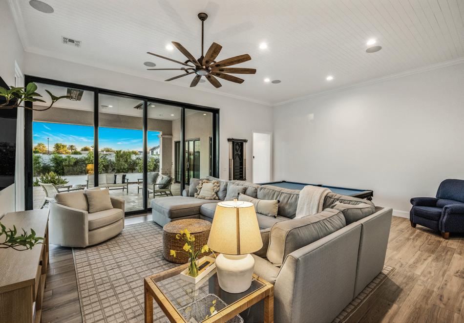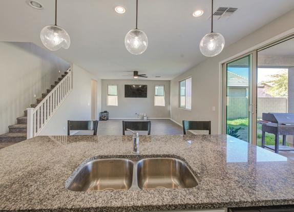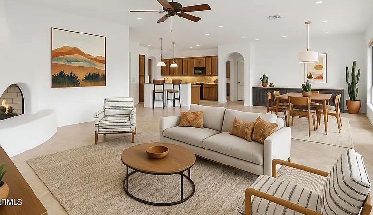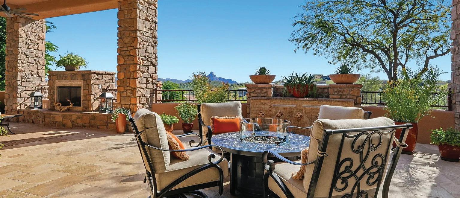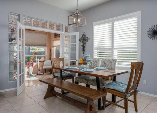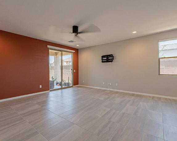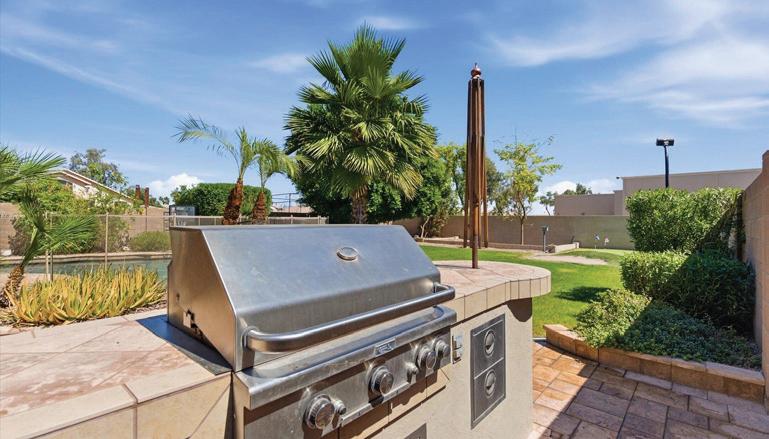 Just beyond, the great room centers around a cozy gas fireplace with custom tile— perfect for quiet nights in or gathering with friends. Natural light pours in through the Pella triple-pane sliding door system, keeping the home bright while supporting a calm, comfortable interior. Step outside to true Arizona outdoor living with a large, extended flagstone patio—ideal for grilling, dining under the stars, pets and play, or simply relaxing—plus mature landscaping that adds privacy and color without the high-maintenance to-do list.