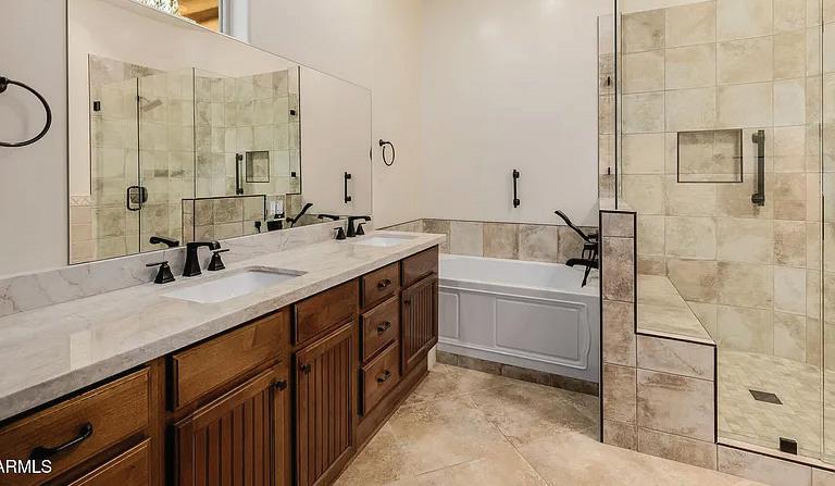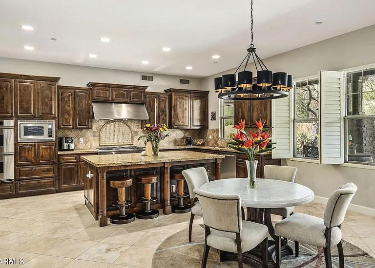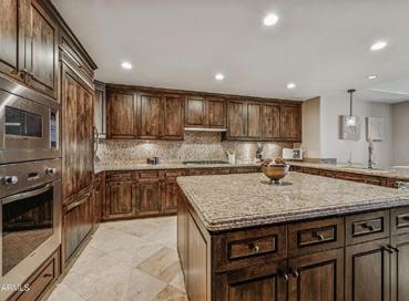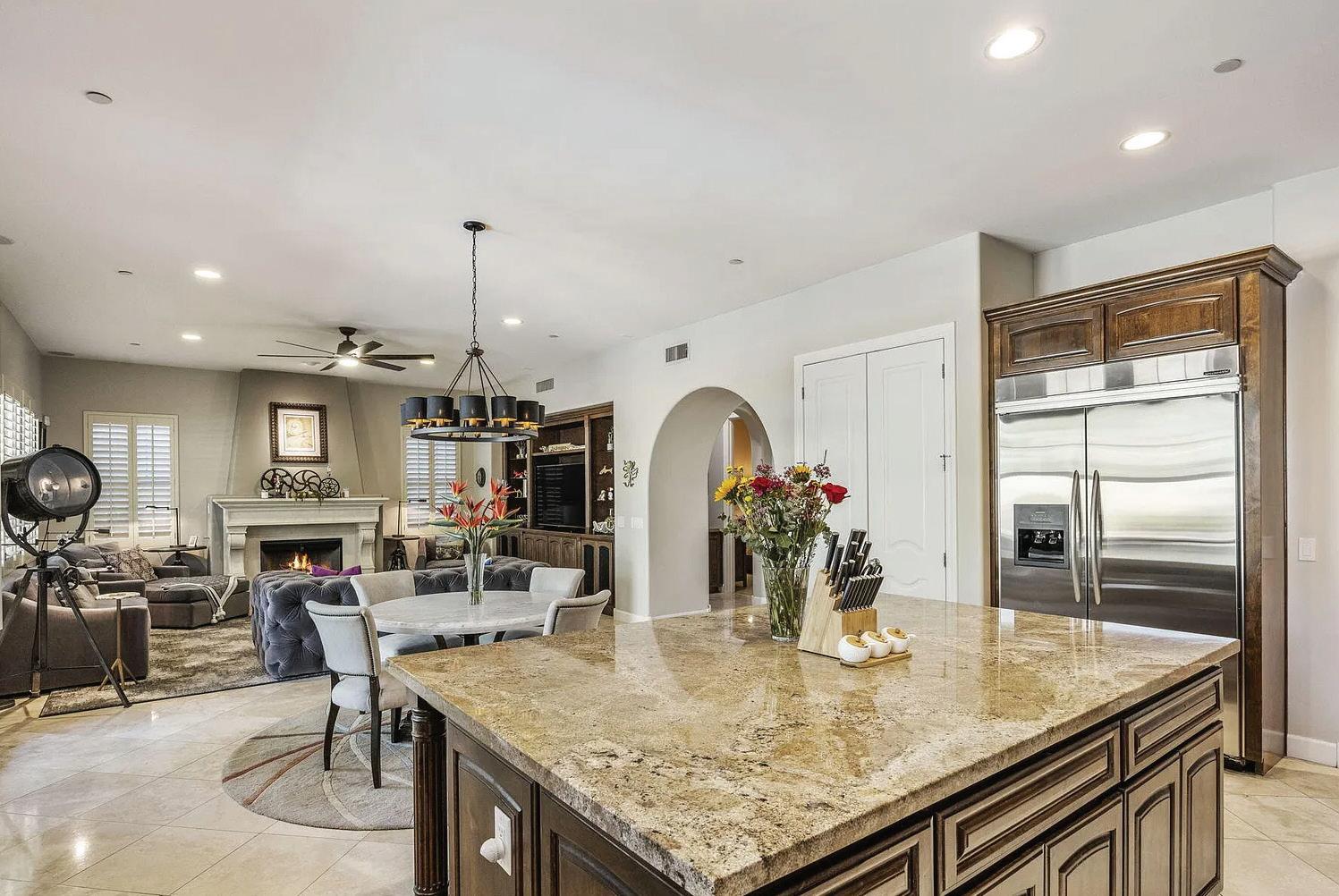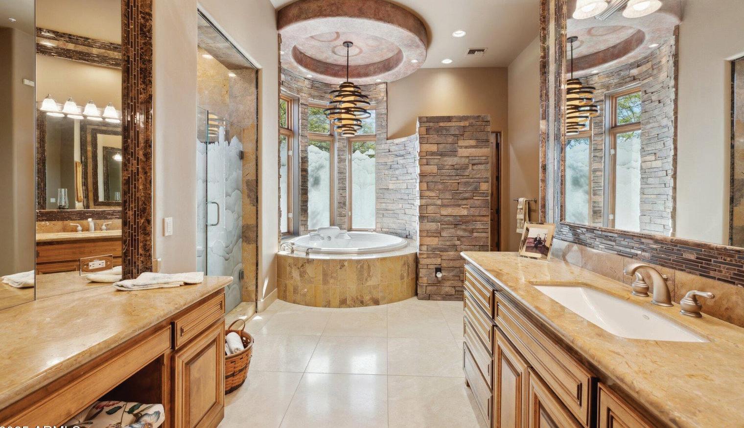 The main residence and detached two-story casita encompass approximately 4,979 square feet on a spacious 1.31-acre lot. From the moment you arrive, you’ll notice the striking architecture, extensive stone accents, and beautifully finished stamped concrete approach and patios.