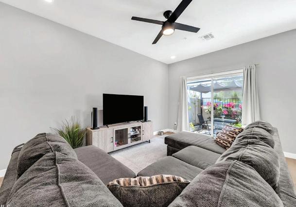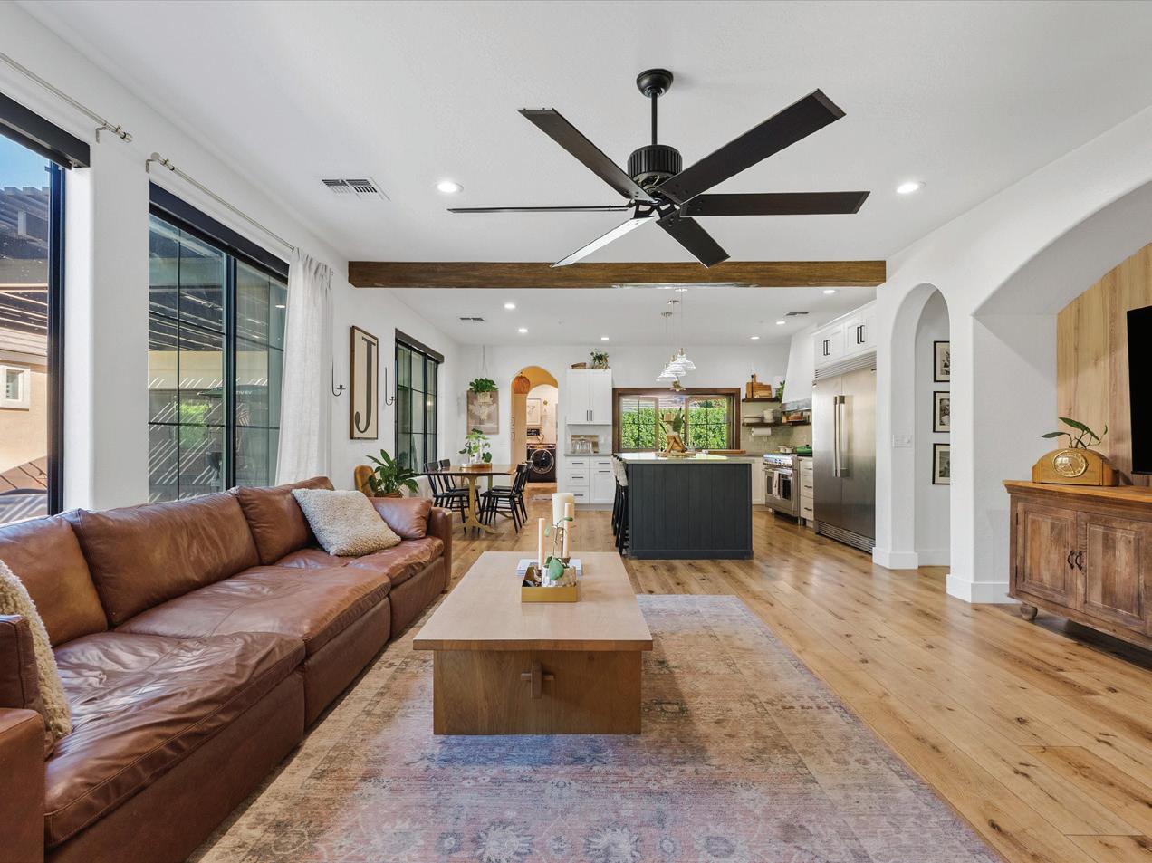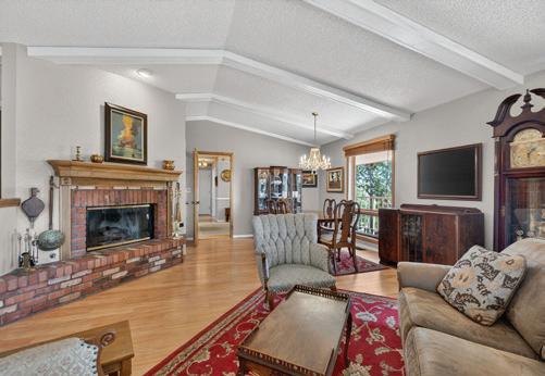 Additional enhancements include an epoxy-coated garage floor, mature fruit trees, lush landscaping, and expanded patio areas designed for seamless indoor-outdoor living.