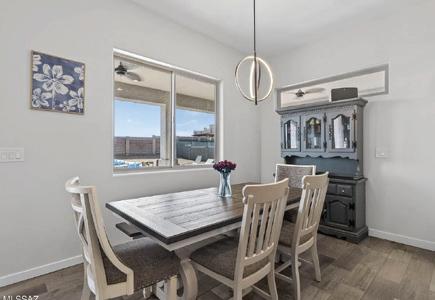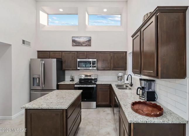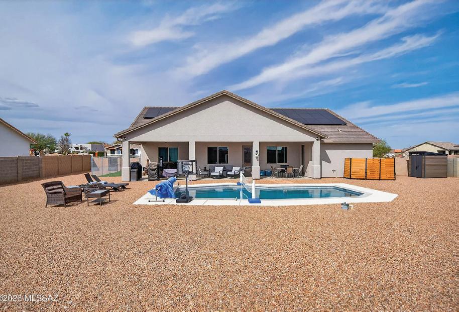 This modern 4-bedroom, 3-bath home offers an open floorplan designed for both everyday living and entertaining. The spacious kitchen features a large island, quartz countertops, a walk-in pantry, gas range, and wine fridge, creating a functional and inviting space. Additional highlights include a security camera system, solar power with two Tesla backup batteries, an instant hot water heater, a water softener, and a whole-house filtration system for added comfort and efficiency. The landscaped backyard showcases pet-friendly turf with volcanic organic infill and travertine tile, providing a low-maintenance outdoor space to enjoy beautiful sunset views. Located in the Vail School District, close to Davis-Monthan Air Force Base, and backing up to Arizona State Trust Land, this home offers privacy, modern comfort, and scenic surroundings.