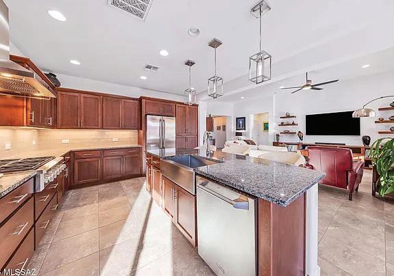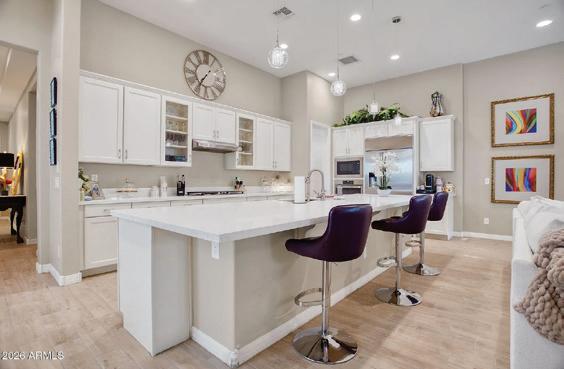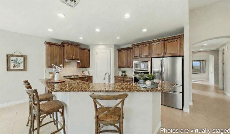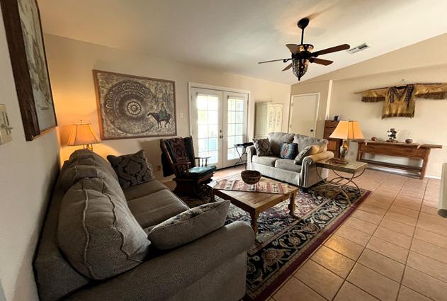 Custom ranch blends privacy, warmth, & comfort. This beautifully designed split bedroom home features 3 bedrooms, 2 bathrooms with over 2,000 sq ft of relaxed elegance. Step through the charming courtyard into an inviting world of privacy. Spacious tiled entry welcomes you into the thoughtfully designed “open” concept living, where LR/DR/KIT flow together. Perfect for entertaining or enjoying everyday living. This expansive layout is enhanced by custom lighting & window blinds, and a blend of tile, laminate & vinyl plank flooring offering style & durability. The kitchen features a center island, breakfast bar, SS appliances, and an adjoining dining area. Guest BRs share a full bath, and one BR includes breakfast bar w/sink, refrigerator & microwave plus private patio. The primary suite is a sanctuary w/full BA & boasts a large walk-in closet.