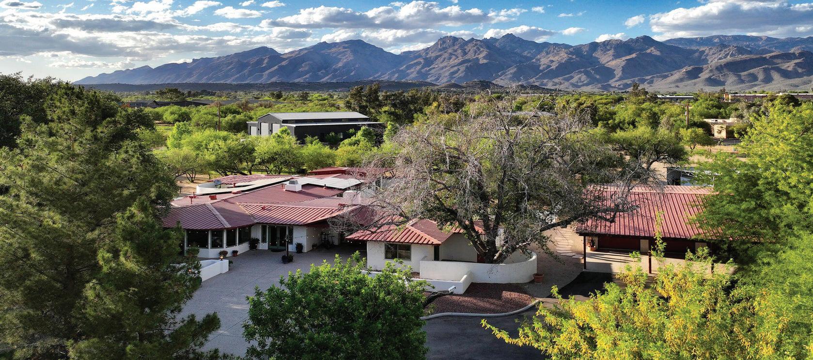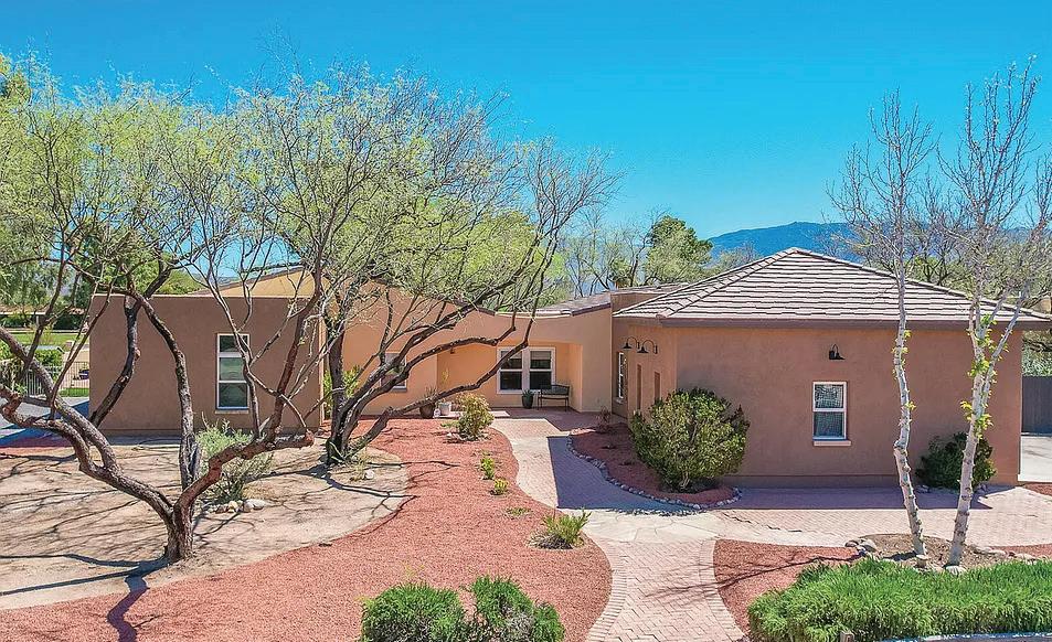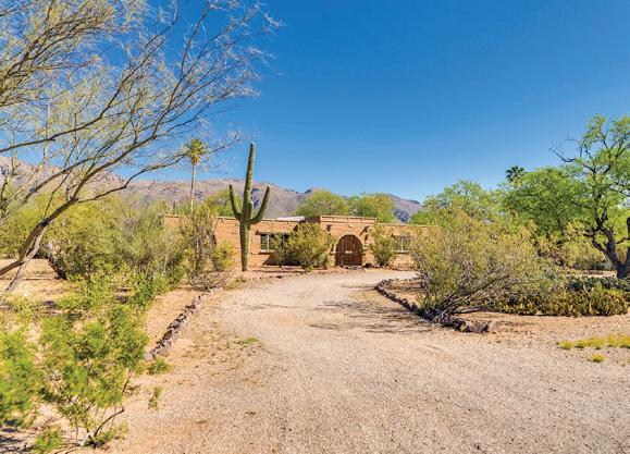 This magical ranch hacienda is a rare offering on Woodland Road in the Tanque Verde Valley. A gated entrance and winding, tree-lined drive create a private, serene setting surrounded by lush pastureland.
