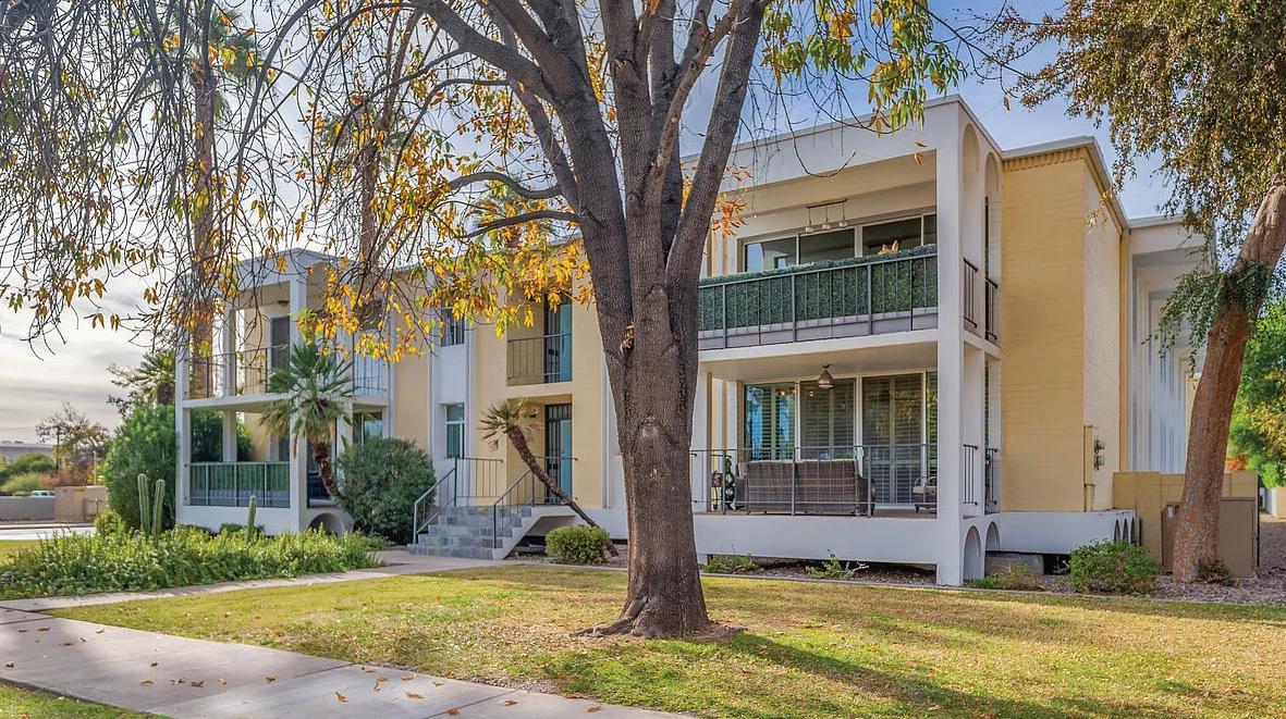 Stunning Condo located in the iconic Olympus mid-century modern community offers a sophisticated living space, built in 1964 and perfectly positioned on Central Ave in one of Phoenix’s most coveted North Central Corridor locations. Only 36-units In this gem designed by renowned architect Robert Starkovich, features distinctive concrete construction, fleur-de-lis breeze blocks, and a striking midcentury aesthetics. Ground floor w/largest patio in complex. Featuring newer modern touches, quartz counters, light featured glass doors, under counter lighting, custom closet designs, large open floorpan that has so much space to entertain. Building is also part of the Phx historic preservation and featured in Phx home&garden. HOA pays heating/cooling, internet, cable, water, trash, sewer.