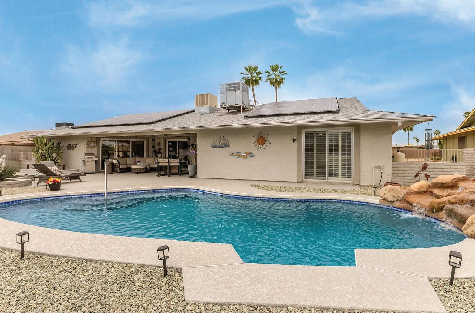 Why build when the perfect home is right here! This popular Fiesta model features 2 bed/3 bath w/den & a bonus built-in desk area at laundry rm. for an extra office or hobby space! Once inside, the large picturesque windows in great room, dining room and primary bedroom all look onto a resort style pool and built in kitchen area thoughtfully designed to accommodate all your entertaining needs. The Gourmet Kitchen boasts roll out shelves @ cabinets, SS Monogram appliances, granite countertops, farm sink, breakfast bar, tile backsplash and much more! !! Open Great Room concept for ease of conversation while entertaining guests is also open to the dining area with a 2’ extension. The primary suite is tastefully appointed w/double vanity, walk in tile shower and spacious walk-in closet. Retire to the covered patio area with retractable screens that will extend your living space for a more intimate setting or open them up to your own private oasis perfect for entertaining friends and family for any occasion. Enjoy the resort style pool and spa w/a waterfall feature and a Baja Shelf to keep cool while basking in the sun! Your new outdoor kitchen area offers a pergola with retractable louvers & misting system for added comfort. All this coupled with the magnificent sunrise and sunsets only found in the desert welcomes you home!!!