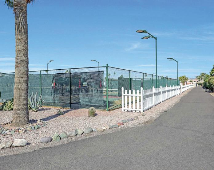 This beautifully reimagined 2-bedroom, 2-bath residence with a versatile den offers refined desert living for the most discerning buyer. Thoughtfully upgraded throughout, the home features granite countertops, custom knotty alder cabinetry, crown molding, designer lighting, and tile flooring throughout. A charming beehive fireplace anchors the living space, while updated plumbing fixtures and fresh interior and exterior paint add a crisp, modern touch.