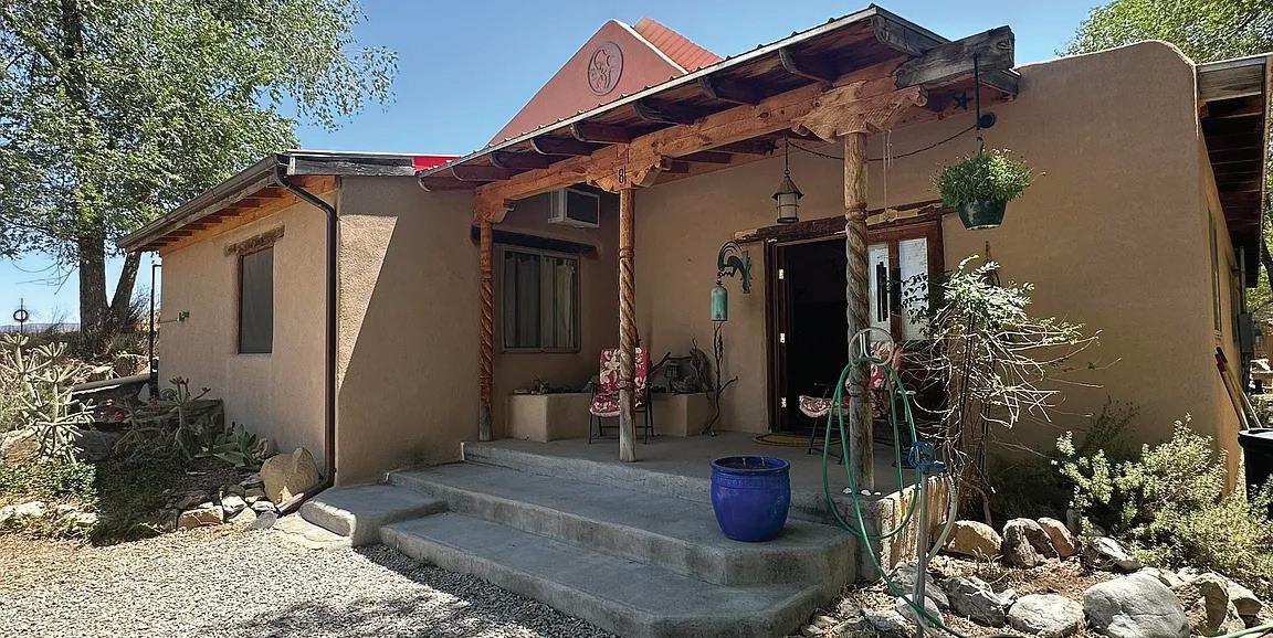 $472,000 Hand crafted, unique adobe home sits along a tree lined seasonal creek. This 3BD/2BA home was created with craftsman attention to detail transitioning from a former carpentry shop to a home with heart and soul. Custom tile and Saltillo floors, manzanita cabinetry in the kitchen. Numerous live edge wood shelving, desktops and a library. The clerestory windows provide light and warmth. The expansive, living area highlights a Lynyrd Skynyrd kiva fireplace flowing to bancos and access to the back patio. The primary bedroom passes a cozy entertainment/work space including a floating, live edge shelf and tiled Mexican cabinet. The primary bedroom has tin ceiling, cedar -lined walk-in closet, wood stove and a sitting area with French doors opening to the back patio. There is an herb lab/pantry area with stained glass. A stained glass door in the loft opens over the dining area. The attention to detail and care in this home is unparalleled. The love that created this home is palpable. Seller financing available.