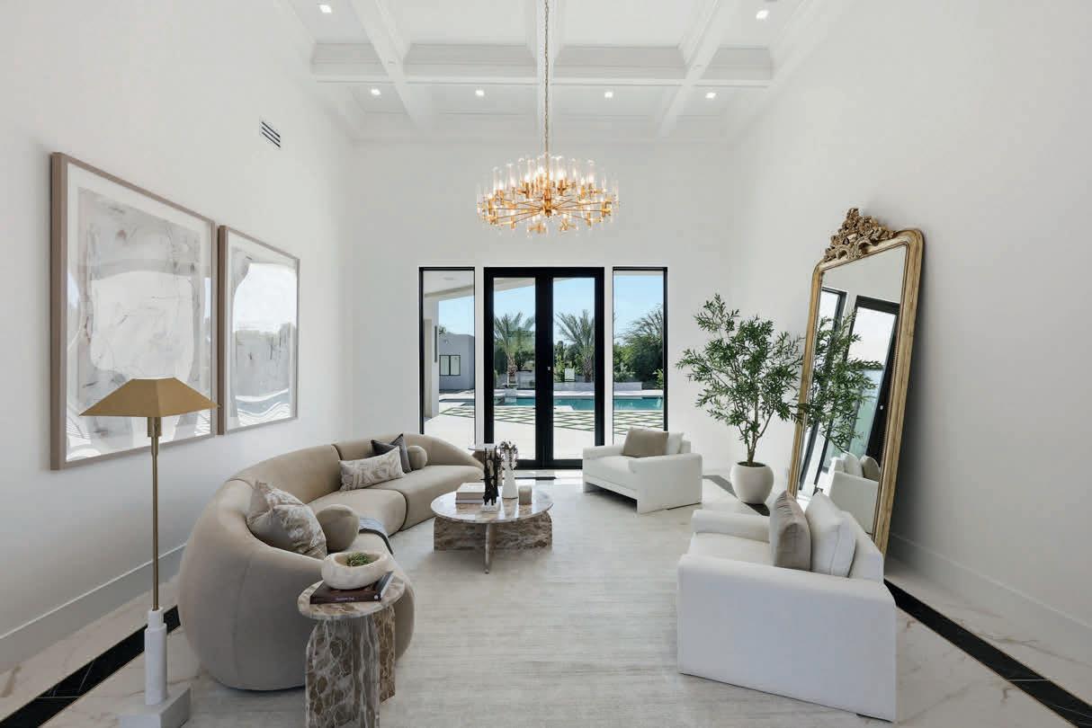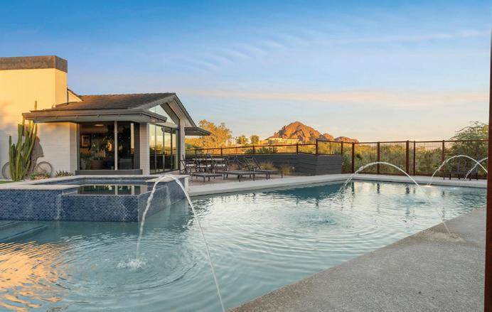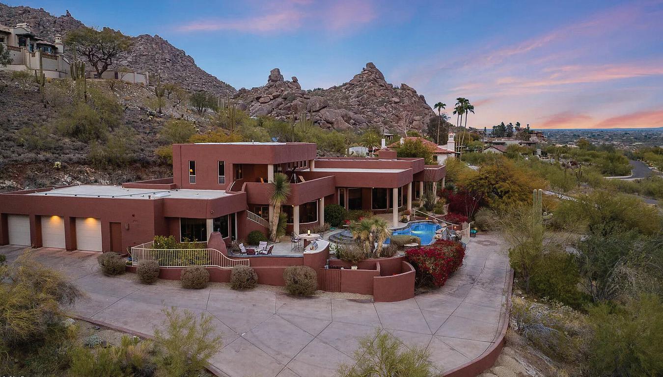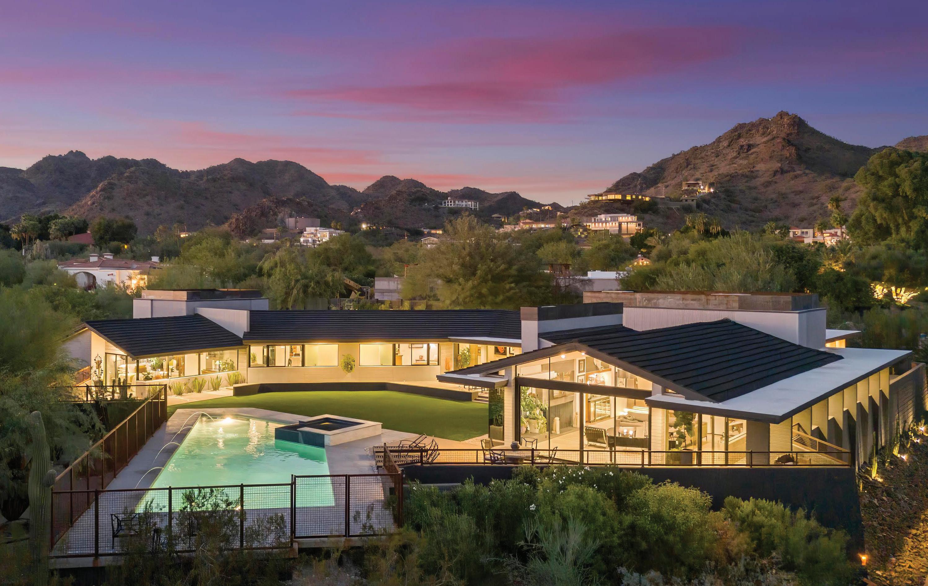 Perched high on the cliffs of Camelback Mountain, this breathtaking mid-century modern estate redefines luxury desert living. Built in 2018 and meticulously designed for seamless indoor-outdoor living, this 5,800 sq ft architectural gem captures sweeping mountain and city lights views from every angle—especially the dazzling Arizona sunsets. Floor-to-ceiling glass walls dissolve the boundaries between inside and out, allowing natural light and panoramic vistas to flow into every corner of the open-concept layout. The main living areas open effortlessly to expansive outdoor spaces, creating an entertainer’s dream with multiple lounging and dining zones. The chef’s kitchen is a true showpiece, featuring topof-the-line appliances, sleek cabinetry, a massive island, and direct access to an outdoor kitchen for al fresco dining under the stars. Outside, the pool appears to float above the city, while a built-in fire pit with surround seating creates the perfect gathering space to soak in the skyline below. Every detail from the architectural lines to the carefully integrated landscape was designed to blend luxury with the mountain’s natural beauty. With 5 spacious bedrooms and 5.5 bathrooms, this home offers both privacy and comfort on a rare 1.036-acre lot. Built high into the mountain, it provides unmatched elevation, exclusivity, and views that few properties in the Valley can rival. This is more than a homeit’s a private retreat in the sky.
