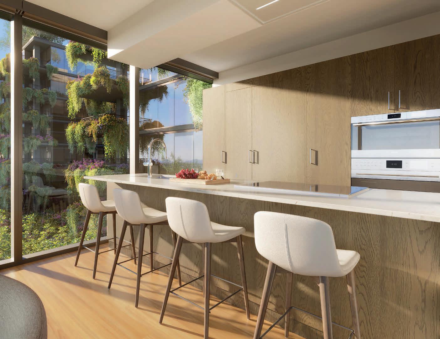 The project is designed by architects David C. Hovey, FAIA, and David Hovey Jr., AIA, whose work has long centered on what the firm describes as biophilic design—architecture that maintains a constant visual and physical connection to the surrounding environment. David Hovey Jr. describes Optima McDowell Mountain as their “next evolution of sustainable living in the desert,” with various shaded outdoor areas throughout that encourage time outdoors. At full buildout, the community will include six eight-story buildings housing approximately 1,330 residences. A defining feature of the master plan is the site allocation: roughly 75 percent of the land is dedicated to open space, positioning landscape as a primary organizing element. That emphasis carries into the residences. Homes are designed with expansive glazing, elevated ceiling heights, and private terraces that extend living areas outward, integrating outdoor space into daily living.