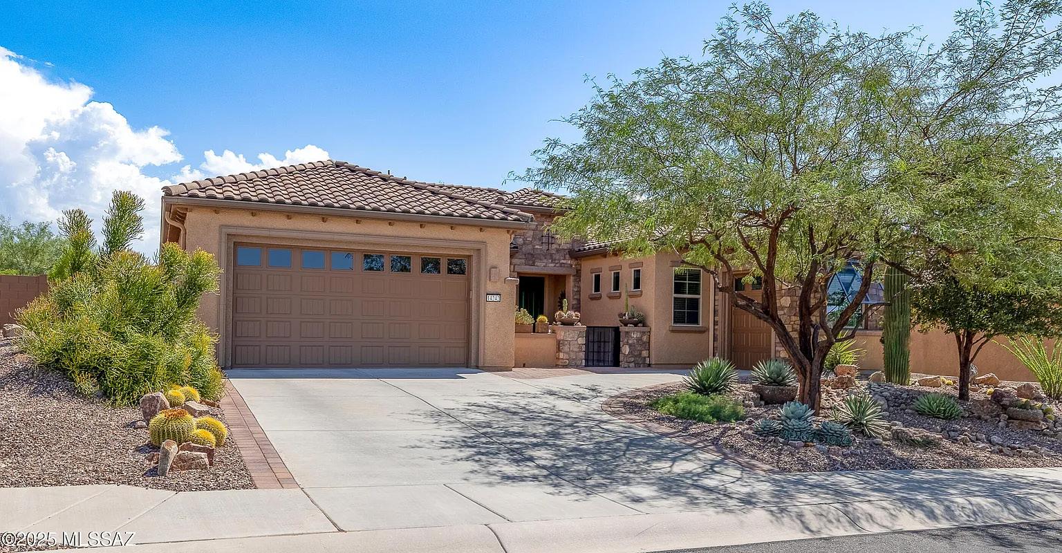 Spectacular Mediterranean Tuscan 6,030 sq ft, 6 bedrooms, 6 baths home in Tucson, AZ. Stunning custom entrance and gate, driveway that winds through manicured grounds with an Italian fountain. Inviting foyer and formal living room with gorgeous, lighted coffered ceiling. Gourmet chef’s kitchen, Wolf appliances, custom alder wood cabinetry and granite countertops. Primary suite has sweeping views from east and west balconies and features a sitting area, coffered ceiling, stone fireplace, rich wood flooring, two expansive walk-in closets and its own washer and dryer. Spa-like bath with jetted tub, steam shower and dual water closets and vanities. Recreation/media room with optional pool table, shuffleboard and a fitness center with a dry sauna. There is also a private detached guest house with laundry, garage and storage. Sparkling saltwater pool with slide, spa and three ramadas with outdoor kitchen, dual built-in BBQ grills, refrigerator, sink, fireplace and TV. Children’s play area with turf and a custom playset, plus a lighted pickleball and basketball court.