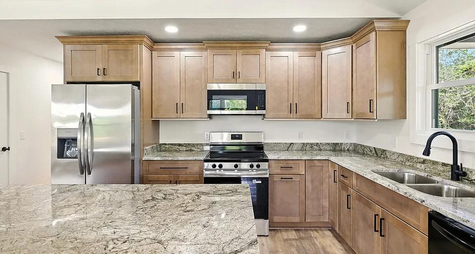 Built in 2022 as a forever home, this spectacular mountain retreat blends modern luxury with rustic elegance, offering thoughtful design, breathtaking views, and exceptional functionality throughout. Step inside to a warm and welcoming entry, where a convenient guest bathroom and laundry closet are perfectly positioned before the home opens into a stunning kitchen. Designed for both beauty and performance, the kitchen features stainless steel appliances, including a gas range and double oven, granite countertops, and custom wood cabinetry set against sheetrock walls—ideal for both everyday living and entertaining.
