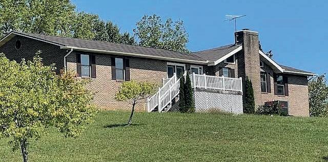 This exceptional custom built 3 bedroom, 3.5 bath home offers over 4,700 sq ft of finished living space, including a full walkout basement and expansive wrap around porch with sweeping countryside views. The main level features a spacious kitchen with wood center island, stainless steel appliances, wall microwave and convection oven, dishwasher, electric range, and side by side refrigerator. A formal dining area is located between the kitchen and the living room. The main living area features a cozy brick wood burning fireplace and elegant French doors that open to the wrap around covered porch. The primary suite offers private porch access, a travertine tile walk in shower, double vanity, and custom walk in closet. A mudroom with vintage service sink, built in cabinetry, and laundry area adds convenience. The upper level includes an open loft area, two large guest bedrooms with multiple closets, and a full guest bath with tub/shower combination and linen closet. The finished walkout basement provides generous open living space, a full bath, stone fireplace with wood burning insert, mechanical room, and French doors to a lower patio. Exterior features include black board fencing, concrete driveway, dog kennel, and both well and city water. Enjoy peaceful country living just minutes from downtown Olive Hill, approximately 80 miles to Lexington, and 30 minutes to Ashland. Quality construction throughout includes poured concrete basement and slab foundation, Nichiha composite cement siding, stone veneer foundation, aluminum clad wood windows, 2”x6” studded walls with foam insulation, custom walnut hardwood floors milled from trees on the property, and maple floors with walnut inlay upstairs. This property offers exceptional craftsmanship, privacy, and a beautiful rural setting.