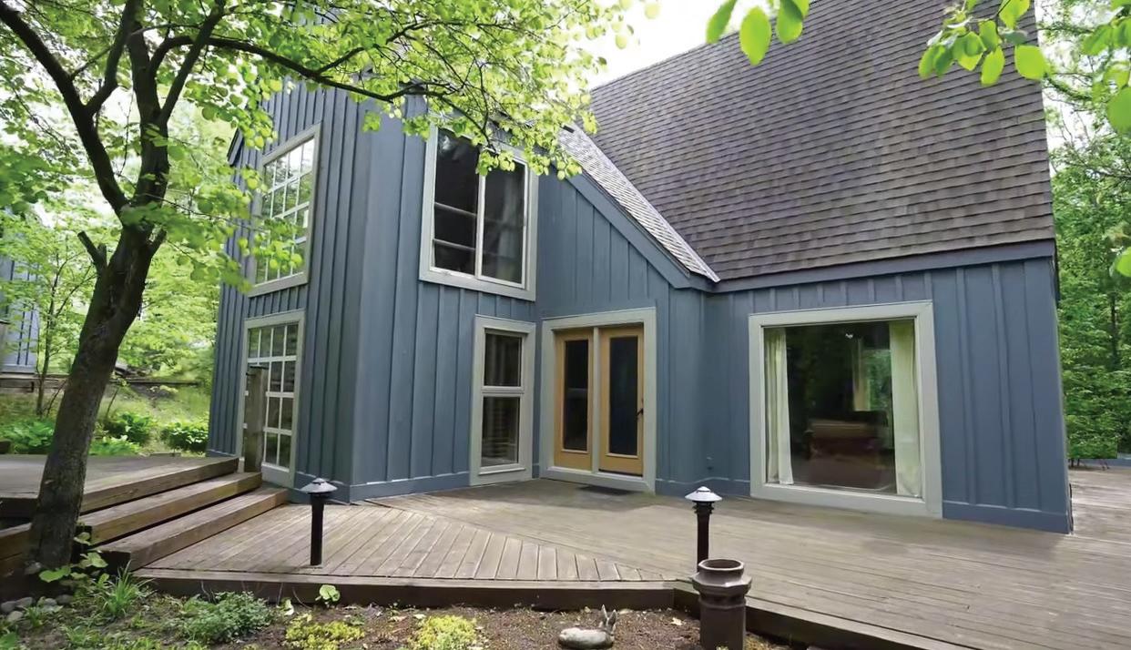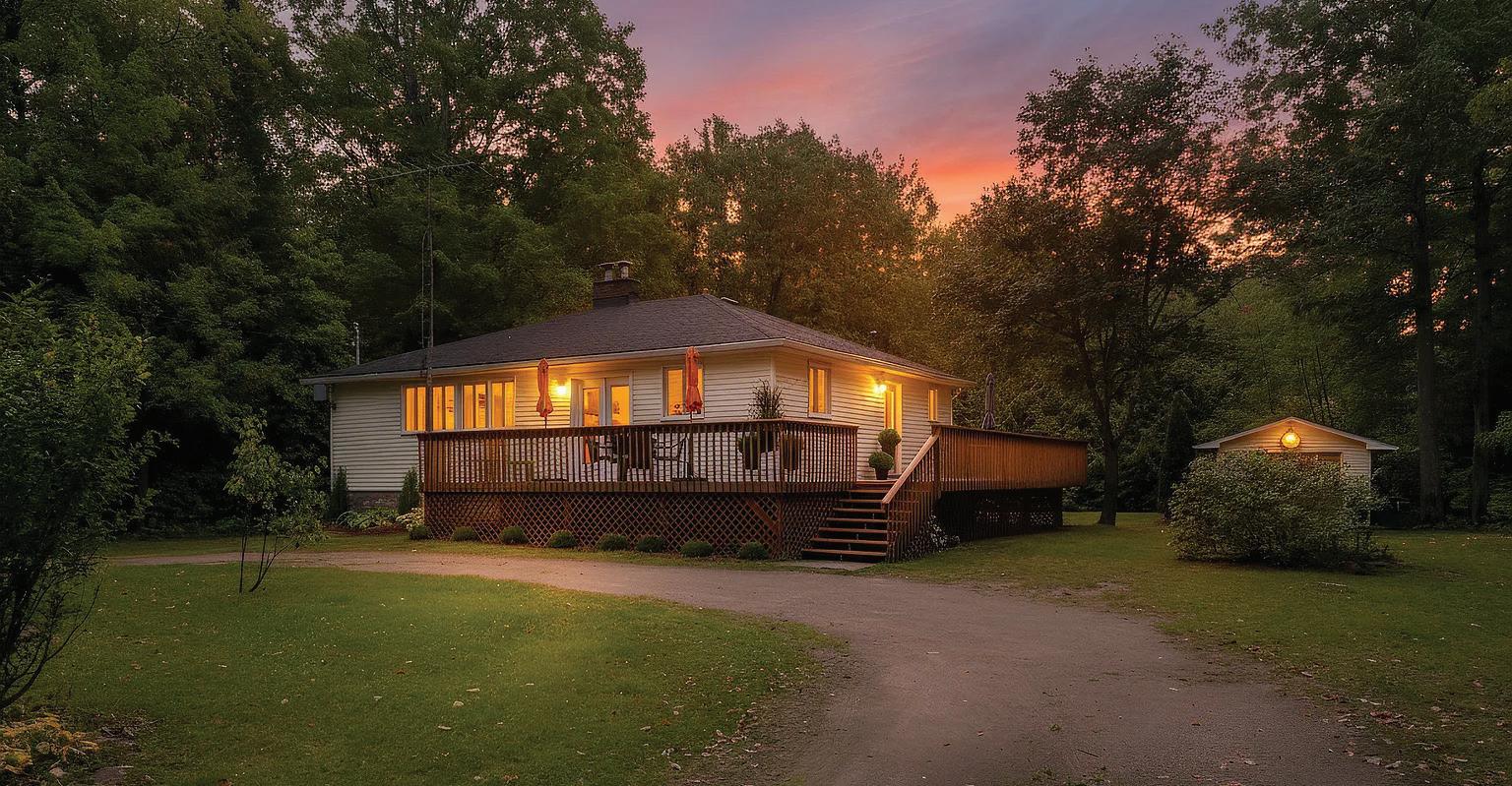 Country lovely and extremely private lot, near lake, 30 min to Kingston and Brockville, bright, unique 2 level home, huge deck, finished basement, garage, outbuilding, and RV guest house with own deck. $548,803.