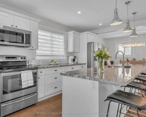 Welcome to 4 Grand Place in the sought-after Allandale Heights neighborhood of Barrie. This beautifully renovated four-level side split features hardwood floors, custom details, and abundant natural light. The main floor includes a cozy family room with a stone gas fireplace and terrace doors to the backyard. The custom kitchen boasts a large island, abundance of cabinets, and flows into a dining area with access to a private, fenced yard. Upstairs offers 3 bedrooms and a spacious landing perfect for an office or reading nook. The fully finished basement includes a recreation room, a stylish bathroom, and potential for a fourth bedroom. Located on a quiet dead-end street near parks, trails, schools, and amenities, this home combines modern comfort with outdoor privacy.